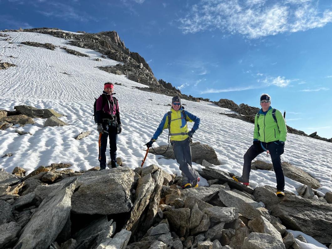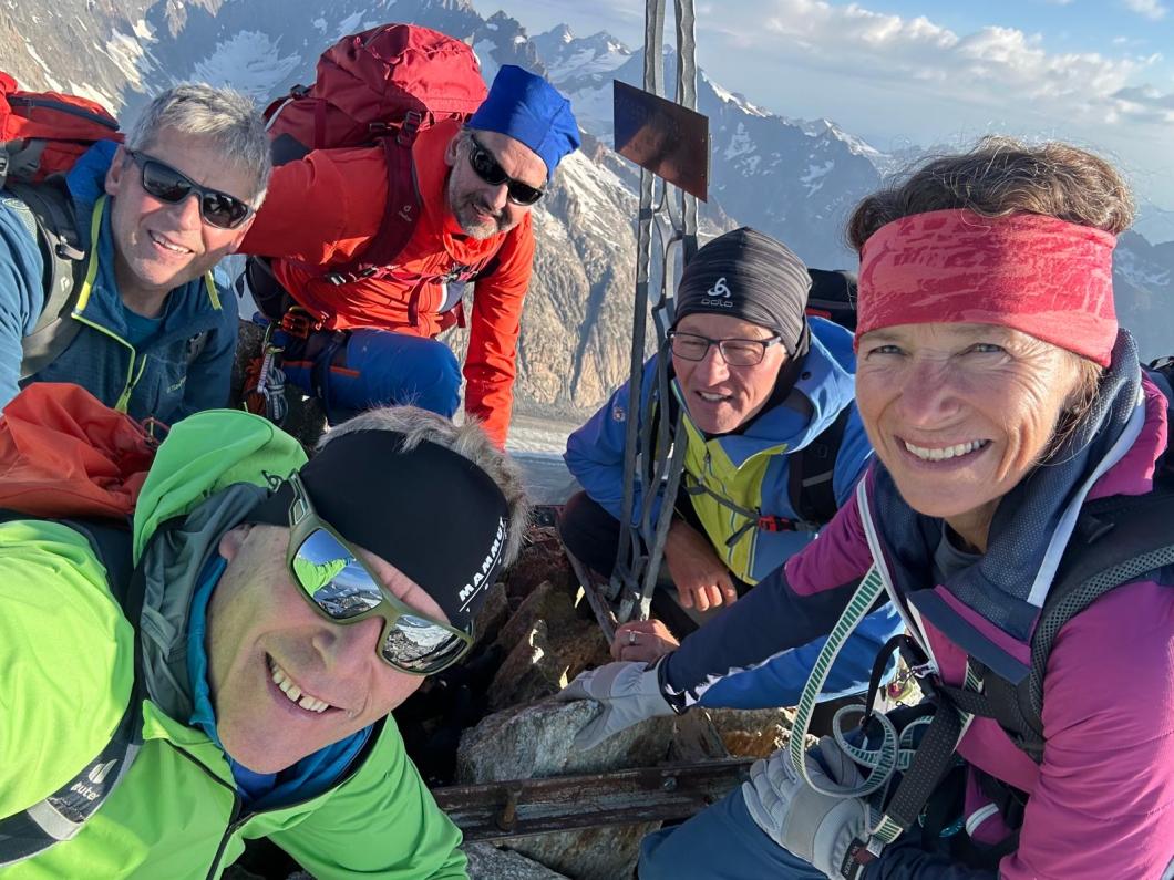 | Tourenbericht Aufgrund schlechter Wetterprognose im Wallis mit Gewitter, Regen und starkem Wind wurde die Tour auf das Täschhorn abgesagt. Als Alternative auf der Alpennordseite, sah ich einer Tagestour nichts im Wege stehen, meldete doch der Wetterbericht für SA Vormittag einigermassen gutes Wetter. So starteten wir die Tour mit einer Autofahrt auf den Grimselpass bis in's Oberaar auf den Parkplatz. Dort liefen wir um 03:00 Uhr in der Früh los. Zwischen den wenig sichtbaren Sternen tanzten hie und da noch ein paar Regentropfen herum. Auf dem Wanderweg entlang des Stausees kamen wir zügig voran und auch der anschliessende Aufstieg über den Gletscher bereite uns keine Schwierigkeiten, probierten wir doch stets das "Heading" zum Oberaarjoch, wo es schon ein wenig heller war, einzuhalten. Pünktlich zum Sonnenaufgang erreichten wir das Joch und erlebten dabei eine fantastische Morgenstimmung, welche unsere Glückshormone wieder voll aufleben (laden) ;-) liessen! Schnell hatten wir die Hütte erreicht, gingen dort über die Terrasse, weiter auf unseren noch bevorstehenden aber nicht mehr langen Gipfelanstieg. Dieser führte uns über die Südflanke, zuerst durch Geröll, Stein und dann zunehmend im Firn hinauf zum Gipfel des Oberaarhorns. Platz hatte es nicht allzu viel auf dem Gipfel, dennoch reichte es für ein Gipfelfoto und, um das herrliche Panorama bei noch gutem Wetter rundum zu bestaunen, auch eine kurze Lektion Geo-Kenntnisse in der Runde fehlte nicht. Auf gleichem Weg stiegen wir nun wieder hinab zur Hütte wo wir bei "Corsin" eine Pause einlegten und draussen auf der Terrasse Kaffee und feinsten Kuchen genossen! Da wir aber den Zeitrahmen, wetterbedingt einhalten wollten, verliessen wir die Hütte schon bald wieder und folgten auf gleichem Weg retour. Angeseilt über den Gletscher hinunter bis zum See und wieder über den Wanderweg entlang bis zum Parkplatz. Auf dem markierten Weg, begleitete uns noch eine Weile die wirklich warme Sonne, auch trafen wir noch verschiedene Kostgänger an, welche dort unterwegs waren. Wie geplant erreichten wir also das Auto wieder vor dem Mittag und auch vor der Schlechtwetterfront, welche nun bereits von Westen im Anzug zu sein schien. Zufrieden, und mit dem guten Gefühl im Bauch, das Schön-Gutwetterfenster perfekt ausgenutzt zu haben, fuhren wir nun wieder den Grimselpass hinunter zurück nach Hause. Danke euch Teilnehmern, äs het ifach Früd gmacht zämä mit öch! |