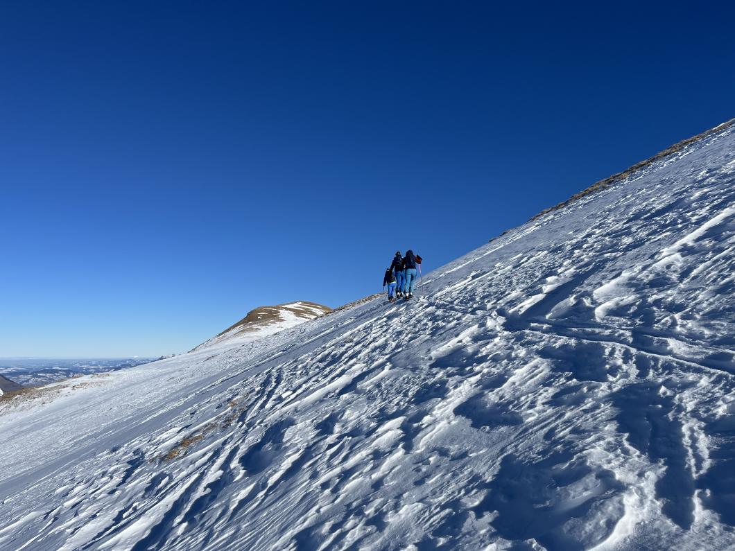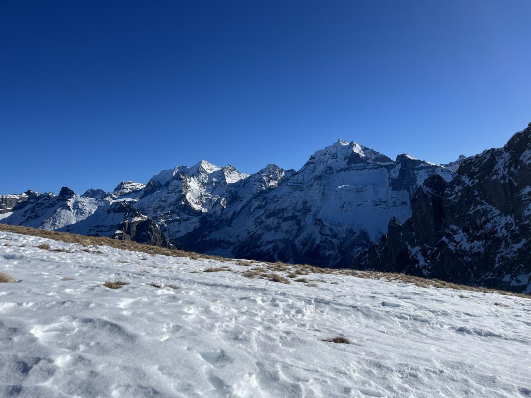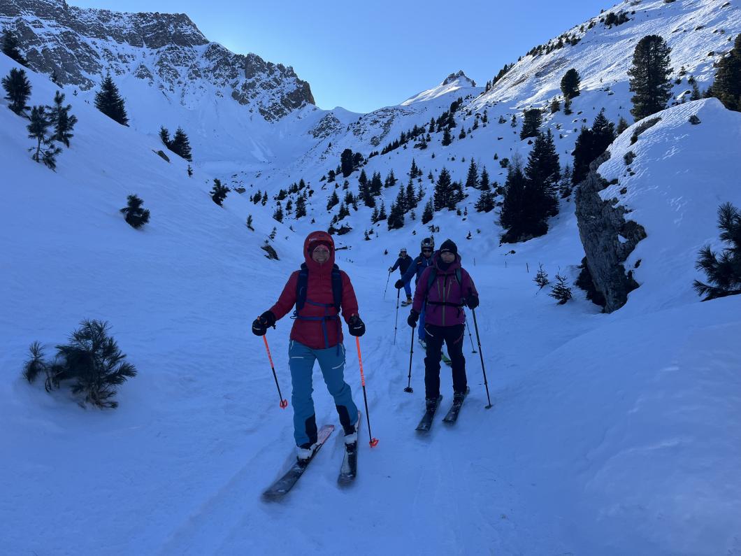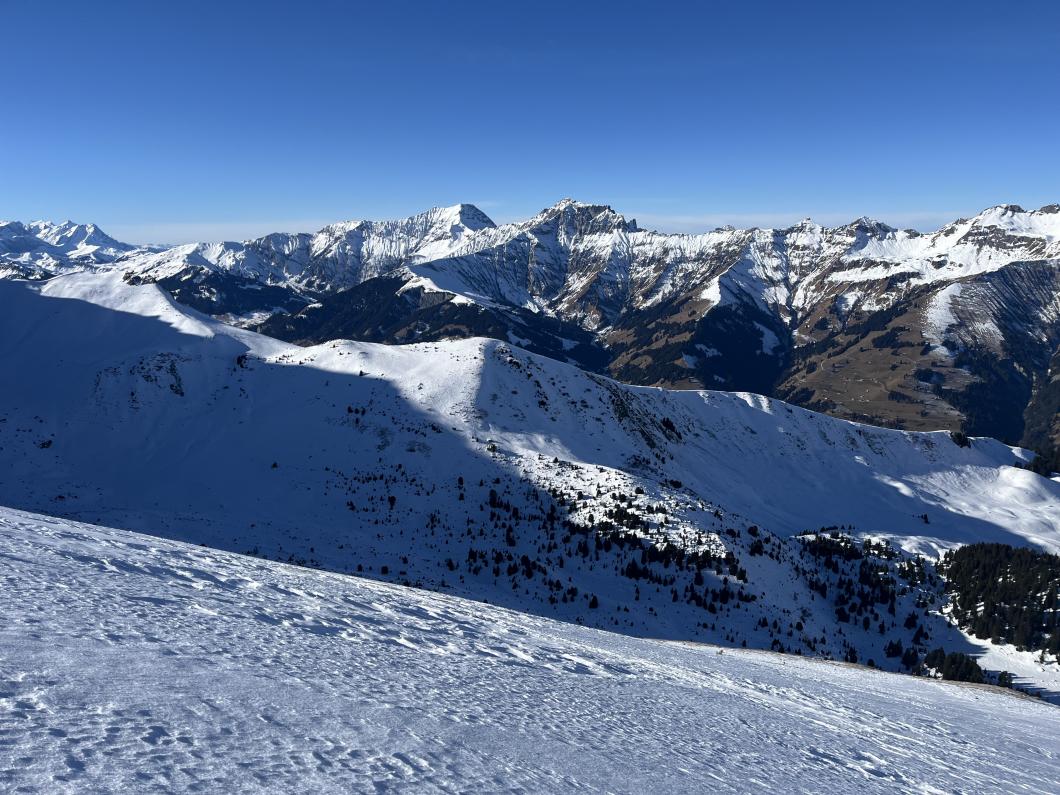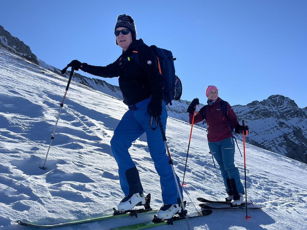 Bei der Bergstation Elsigenalp begrüsst uns fünf Teilnehmer Freis statt Rosina. Brrrr, -13°. Die Aufwärmübungen und die erste Sonne mochten uns nur etwas aufwärmen. Dann ging es in den Gefrierschrank bzw. via Elsigsee durch lichten Wald ins sonnenlose Glögglital. Nach dem kupierten Gelände wurden die Harsteisen montiert und es wurde merklich steiler. Immer noch bitterkalt, während im übrigen Tal die Sonne schien. Als wir im Zickzack mit viel Kick-Kehren (üben) die Höhe gewonnen hatten, erreichten wir auf der Schulter des Howang die Sonne. Trotz der Wärme mochten sich nicht alle Teilnehmer:Innen erwärmen. Es wurde flacher und nach knapp anderthalb Stunden erreichten wir den aperen Gipfel. Nur kurz genossen wir die Aussicht bei steifem Wind und zogen alles, was die Rucksäcke hergaben, an. Trotz altem, verblasenem Schnee war die Abfahrt überraschend schön. Wir holten ganz ins schattige Glögglital aus und traversierten hoch über dem See zur Elsigenalp zurück. Nach einer Abfahrt auf der Piste, gönnten wir uns die Wärme und die Gastfreundschaft mit Blick auf unser erstes diesjährige Tourenziel. Es war «ärdig-eisig-schön»! Merci Fries für die Touren(durch)führung. //Bänz