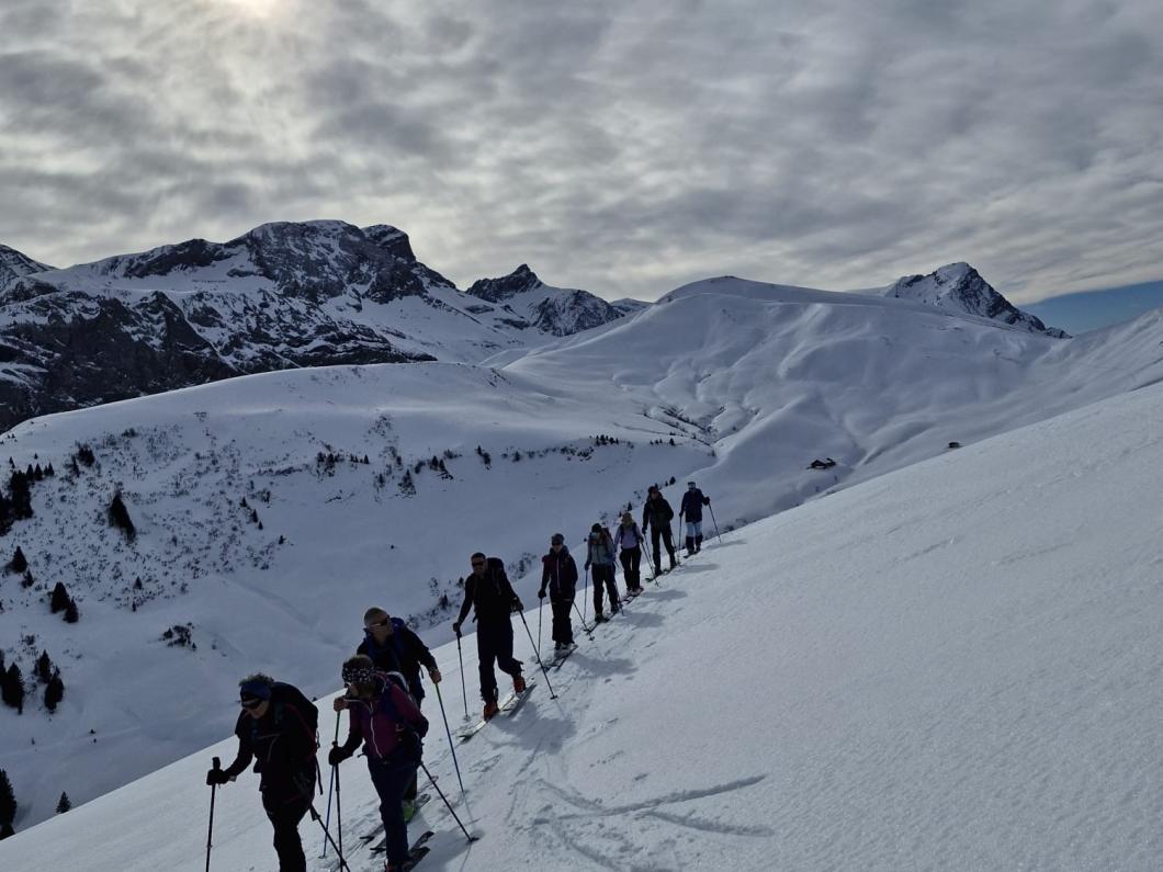 | Tourenbericht Am 25. Januar 2025 unternahmen wir die Skitour "Rund ums Stübleni" - eine Genusstour mit abwechslungsreichen Auf- und Abstiegen, die nicht nur unterschiedliche Schneeverhältnisse, sondern auch eine wunderschöne Landschaft bot. Ab Wimmis fuhren wir gemeinsam in die Lenk und von dort aus auf den Betelberg Auf dem Betelberg angekommen begann die Tour mit einem ersten kurzen Aufstieg zum Leiterli. Nach dem ersten Aufstieg folgte die erste Abfahrt zum Lägermedi. Danach ging es wieder bergauf zum Trütlisbergpass. Dort machten wir eine Pause genossen die schöne Aussicht auf die umliegenden Berge und die Gryden. Yvonne erzählte uns wie die Gryden entstanden, was die Pause noch interessanter machte. Die nächste Etappe führte uns hinunter nach Schönebode. Von dort aus begann der längste Aufstieg der Tour zur Fürflue. Oben angekommen, machten wir eine Pause und konnten erneut die herrliche Aussicht geniessen und uns verpflegen. Nach der Pause gab es noch eine kurze Abfahrt und dann den letzten Aufstieg zurück zum Ausgangspunkt Leiterli. Bei einem kurzen Halt erzählte uns Yvonne, dass sie bei der Rekognoszierung der Tour einen Steinadler beobachten konnte - es war ein spannender und wunderschöner Tag. Vielen Dank Yvonne für die tolle Organisation und die spannende Tour! |