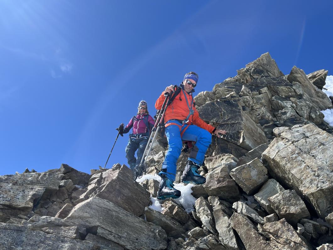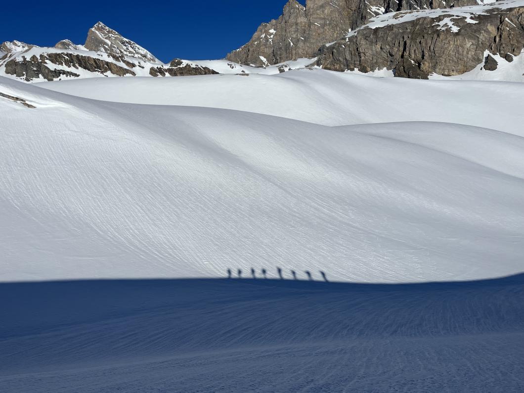 | Tourenbericht 1.Tag Früh und gut gelaunt fuhren wir in Adelboden los Richtung Val di Rhêmes. In Rhêmes Notre Dame parkierten wir und zogen Richtung Benevolo Hütte los. Nur ein einziges Mal mussten wir auf dem Hüttenweg wegen Schneemangel kurz die Skis tragen Nach einer kurzen Pause in der Hütte machten wir uns auf, um den Punta della Paletta zu besteigen. Es war sehr warm und der Aufstieg musste ein bisschen erkämpft werden. Aber es lohnte sich, die Aussicht war grandios und auf der Abfahrt hatten wir wunderbaren Sulzschnee. 2.Tag Zuerst stiegen wir alle auf den Punta Calabre. Erwin führte seine Gruppe noch auf den Roc Basagne. Um diesen Gipfel zu erreichen musste die Gruppe die Skis ein paarmal an- und abfellen. Die Route sah folgendermassen aus: Abfahrt nach Norden, Aufstieg zum Col di Rhême, Abfahrt nach Süden und Aufstieg zum Gipfel. Fritz fuhr mit seiner Gruppe direkt zurück zur Hütte. 3.Tag Heute war unser erstes Tagesziel Punta Galisia. Nach zwei Tagen mit Schwitzen, frierten wir beim Aufsteigen. Oben teilten wir uns in drei Gruppen. Fritz fuhr mit seiner Gruppe direkt zurück zur Hütte. Ruedi machte Einige gluschtig das Culoir zwischen Punte Galisia und Roc Basagne abzufahren. Erwin bot seiner Gruppe an den Punte Basei zu besteigen. Dazu wurde zuerst nordwärts abgefahren, nachher noch ein Stück traversiert und aufgestiegen zum Colle Basei und weiter den Spuren nach über den Grat bis zu den Gipfelfelsen. Wir nahmen an, dass hier der „Wintergipfel“ ist. Auf der Abfahrt hatten wir wunderbaren Pulver an den Nordhängen und Sulz an den Südhängen. 4.Tag Rund um den Granta Parei war für die Gruppe von Erwin der Tourenplan. Aufstieg zum Colle Tsantelleina, Abfahrt auf den Glacier de Rhêmes-Colette, Aufstieg zum Grat vom Ricco di Coletta (Punkt 3228m) und Abfahrt zurück zur Hütte. Fritz und Ruedi bestiegen mit ihrer Gruppe auf der gleichen Runde zusätzlich den anspruchsvollen Punta Tsanteleina. Ruedi machte eine super Spur. Herausfordernd waren die Spitzkehren, die letzten Meter vor dem Gipfel (40°) und auch beim Abfahren war Vorsicht die erste Priorität. Auf dem Rückweg gelang es Fritz die Gruppe zu überzeugen, den auf dem Weg liegenden Becca Traviersière auch noch zu erklimmen. 5.Tag Fritz führte seine Gruppe auf den Roc de Basagne. Ruedi und Erwin boten den Roc dal Fond mit alpinen Herausforderungen an. Zuerst wurde der Aufstieg gemacht wie gestern die Abfahrt und weiter zum Picco di Colletta. Dieser flache Hügel war anspruchsvoller als gedacht! Weiter gings mit der Abfahrt zum Colle Tsanteleina, dann wurde der Gletscher di Tsanteleina überquert und wieder aufgestiegen zum Col di Rhêhme. Nun war noch der herausfordernde Gipfelanstieg zum Roc dal Font an der Reihe. Auf dem Gipfel war es windstill und die Gruppe genoss nochmals die Rundsicht, bevor sie wieder voll konzentriert abfuhr. 6.Tag Alle zusammen stiegen wir auf zum Gran Vaudala und fuhren durchs Vallone della gran Vaudala zurück nach Rhêmes Notre Dame. Es war eindrücklich wie viel Schnee geschmolzen war. Die Skis mussten eine längere Strecke getragen werden. Am Morgen war das Wetter noch schön und im Laufe des Vormittags nahm die Bewölkung und der Wind zu. Als wir zurück bei den Autos waren gabs ein paar Regentropfen. Dankbar, dass wir die Tourentage ohne Unfälle, bei so schönem Wetter, idealen Schneeverhältnissen und guter Gemeinschaft verbringen durften, machten wir uns auf den Heimweg. Die vielen schönen Erinnerungen werden uns zurück in den Alltag begleiten. |