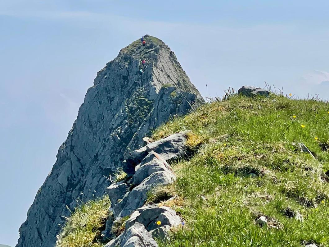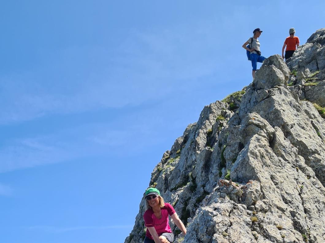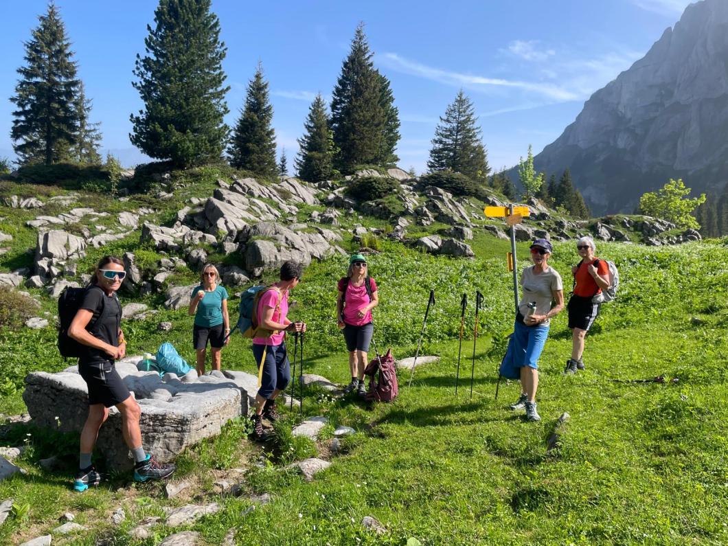 | Tourenbericht Bei schönem Wetter fuhren wir frühmorgens auf die Axalp. Wir starteten entlang dem Holzschnitzerweg bis zum Hinterburgsee. Dies ist ein angenehmer Weg zum Einlaufen. Nun gings stozig im Zick Zack hinauf zur Alp Urseli. Hier machten wir unsere erste Pause. Nun kraxelten wir über Kalkfelsen hoch in den Sattel und weiter gings nochmals stotzig bis auf den Axalpgrat. Nun war nur noch der ausgesetzte Grat bis aufs Axalphore zu überwinden. Wieder zurück auf dem Axalpgrat machten wir ausgiebig Mittagspause. Die Fernsicht war getrübt durch die Rauchpartikel von den Waldbränden in Kanada. Das war fast ein bisschen unheimlich. Freuen konnten wir uns an der Pracht der vielfältigen Frühlingsblumen. Für den Abstieg nahmen wir den Weg über Tschingel und Chiemand. Im Alpstübli auf der Axalp erfrischten wir uns mit Getränken und genossen noch die gute Kameradschaft, bevor wir uns auf die Heimfahrt machten. Bericht: Rosina Inniger |