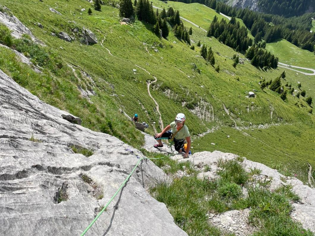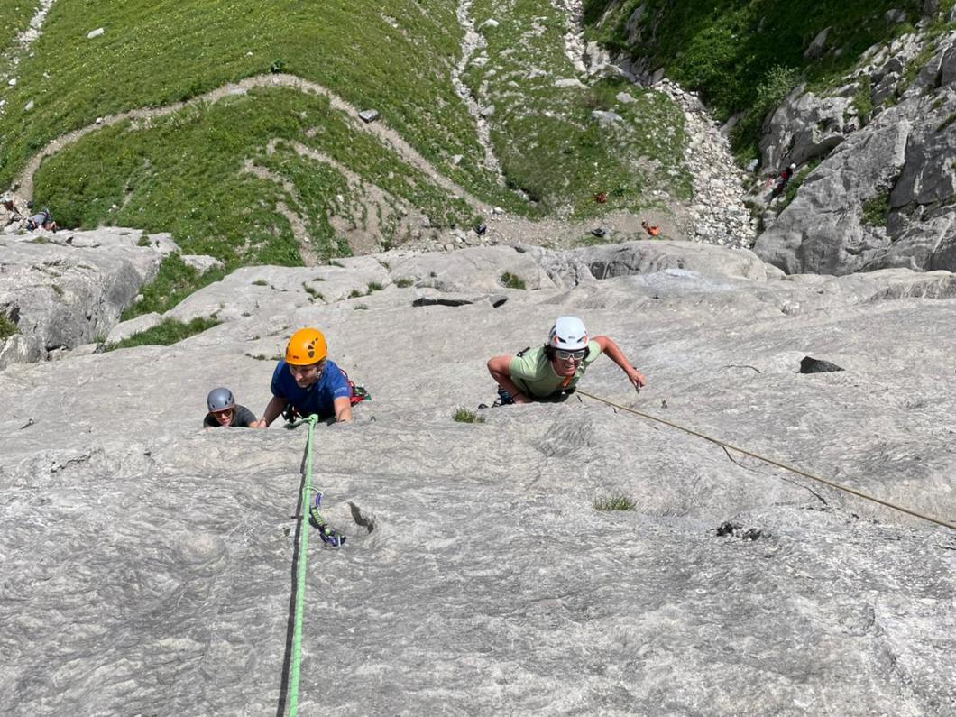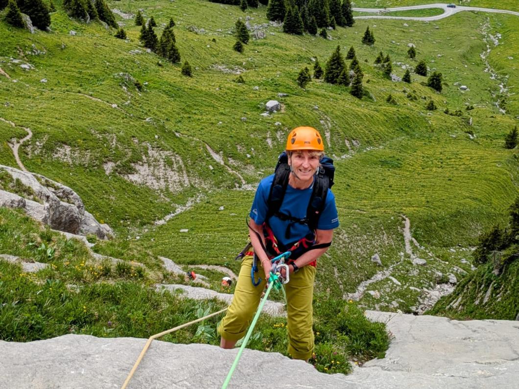 | Tourenbericht Wie macht man vier Frauen glücklich? Ja genau MANN geht mit ihnen klettern. Am besten Mehrseillängen und auch am besten an einen Ort, wo sie noch nie geklettert sind. Dies hat Köbi Hari mit uns gemacht. Wunderbares Sommerwetter mit einer leichten Brise, schöner Kletterfels all dies fanden wir an Ueschenen vor. Nach einem kurzen Zustieg haben wir zusammen eine der vielen Routen ausgewählt. Köbi instruierte uns vor dem Einstieg meisterhaft, Kommandos wurden abgemacht, Knoten, Seilhandhabung und Material geprüft. Nach einigen Mehrseillängen mit anschliessendem Abseilen, genossen wir unseren Lunch. Inmitten der schönen Bergblumen und Bergwelt schmeckte das Sandwich gleich doppelt gut. Die Zeit verging wie im Fluge, es war bereits früher Nachmittag. Wir beschlossen noch zwei Seillängen zu klettern und danach einen kühlen Drink zu geniessen. Herzlichen Dank an Köbi, dass er mit uns Frauen einen lustigen, sportlichen, herausfordernden und unvergesslichen Tag verbracht hat. |