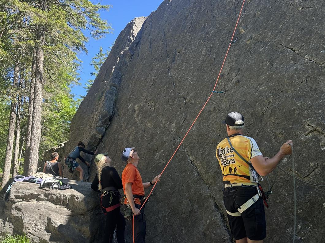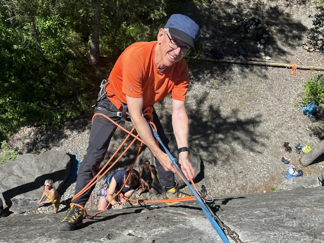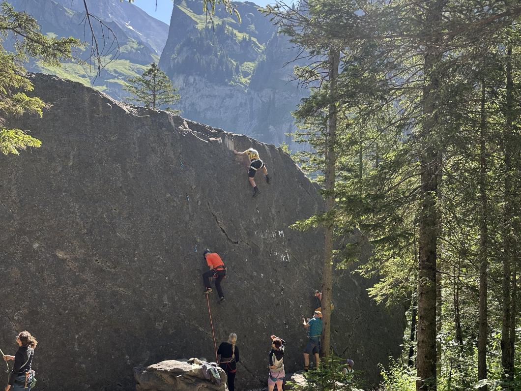 Anseilen klappt bei den Meisten schon ganz gut. Nach weiteren Instruktionen dürfen wir in Zweierseilschaften am Chälistein Routen klettern. Immer unter dem wachsamen und kompetenten Blick von Adi. Bei Unsicherheiten und Fragen ist er gleich zur Stelle. Wer es nicht so hat mit dem Lassowerfen zum Halbmastwurf, dem wird mit Buchstaben als Eselsbrücke geholfen (VP). So können wir alle viel lernen. Der Chälistein eignet sich ideal dafür. Heute war er auch noch ideal, weil wir uns immer wieder in den Schatten des Waldes zurückziehen konnten. So merkten wir die Hitze des Tages erst, als wir uns alle auf dem Chälistein besammelten, um die Theorie des Abseilens in die Praxis umzusetzen. Praktisch üben konnten wir dann auch am Nachmittag als wir den Klettersteig Chäligang begingen. Angeseilt und gegenseitig sichernd statt mit Klettersteigset. Eine super Übung!