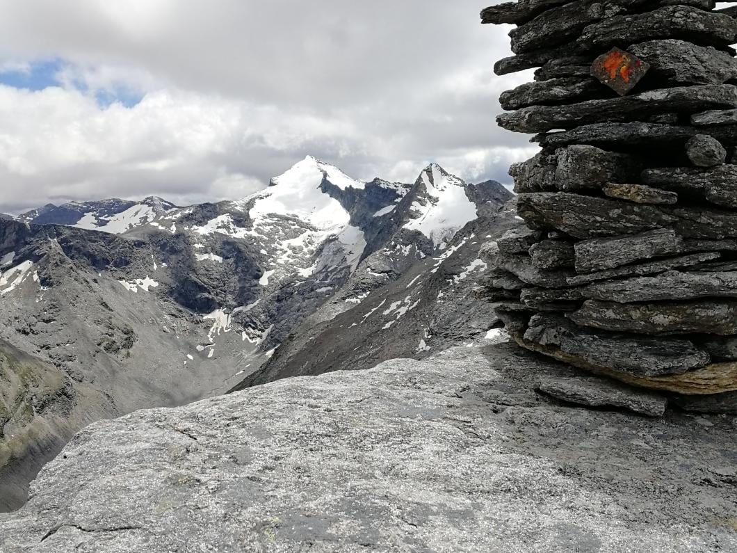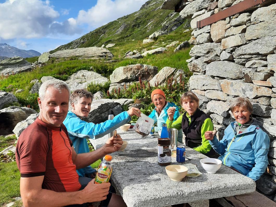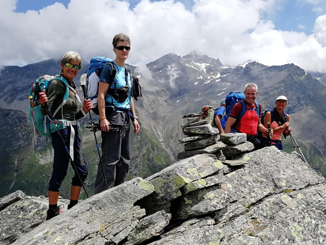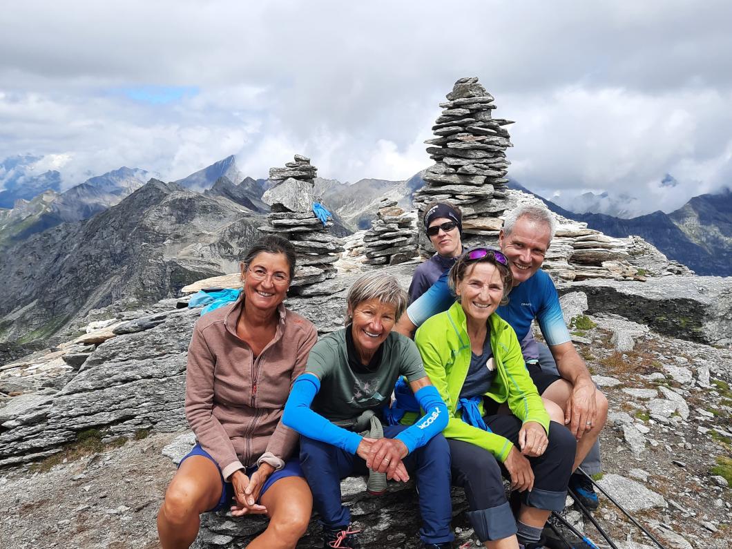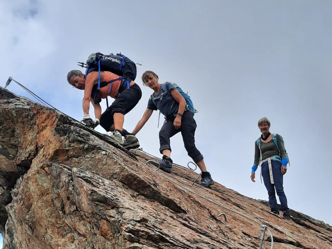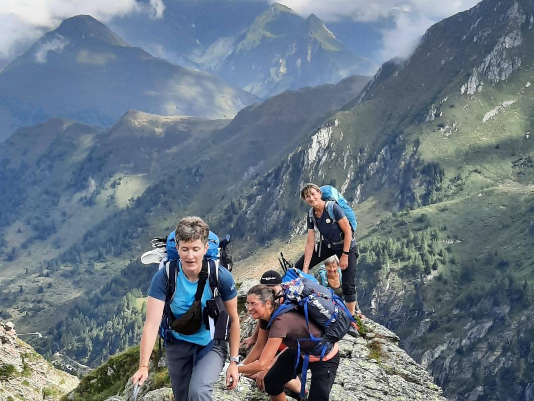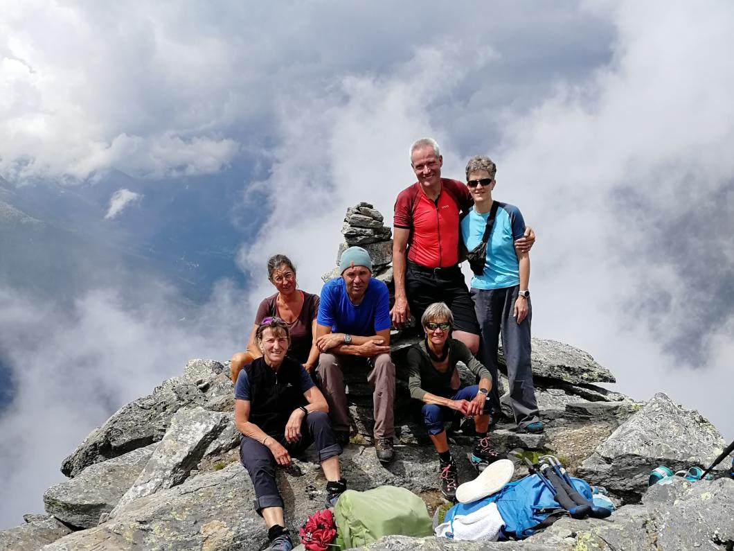 Nach zwei Tunnels am See geht’s wieder aufwärts in Richtung Via Alte Carassino, T5 mit 5 Gipfeln. Zum Glück hat das Wetter schnell gebessert, sodass wir tatsächlich diesen langen teilweise ausgesetzte Grat erklimmen können. Ich merke schnell, dass ich da mit einer schnellen, geübten Gruppe unterwegs bin! Auch über meine Schlüsselstelle mit Drahtseil und Eisenbügeln können Käthy und Ruth noch ‘gsprächle’ und Markus ist meistens schon weit voraus. Zum Glück weist mir Erwin zwischendurch noch den Weg! Etwas später erreiche auch ich noch den Gipfel für die kurze Rast und das Gipfelfoto bevor wir weiterziehen, denn schnell ändert das Wetter - Donnergrollen und Regen treiben uns voran! Nass erreichen wir die schöne leere Terasse der Cap. Adula, Kuchen gibt’s keinen mehr, dafür können wir ein wohl verdientes Tessiner Plättli draussen geniessen!