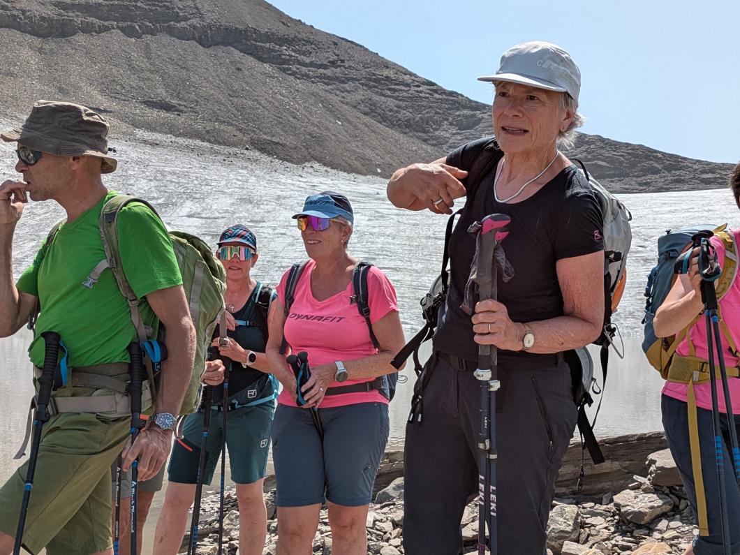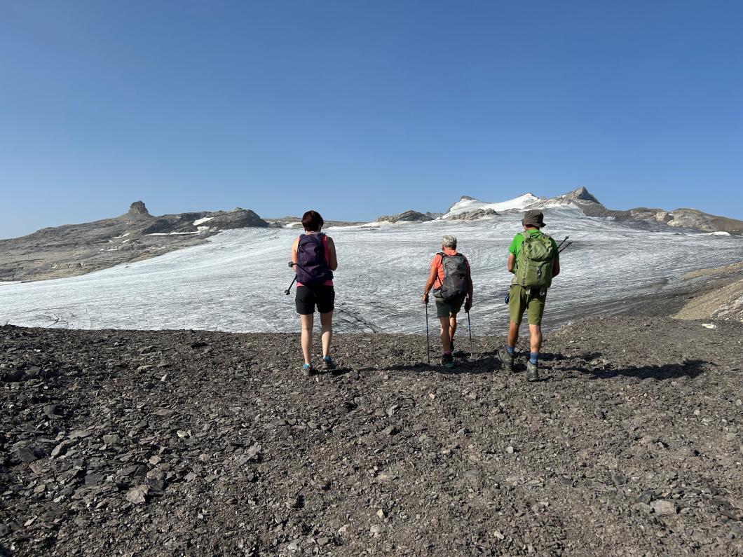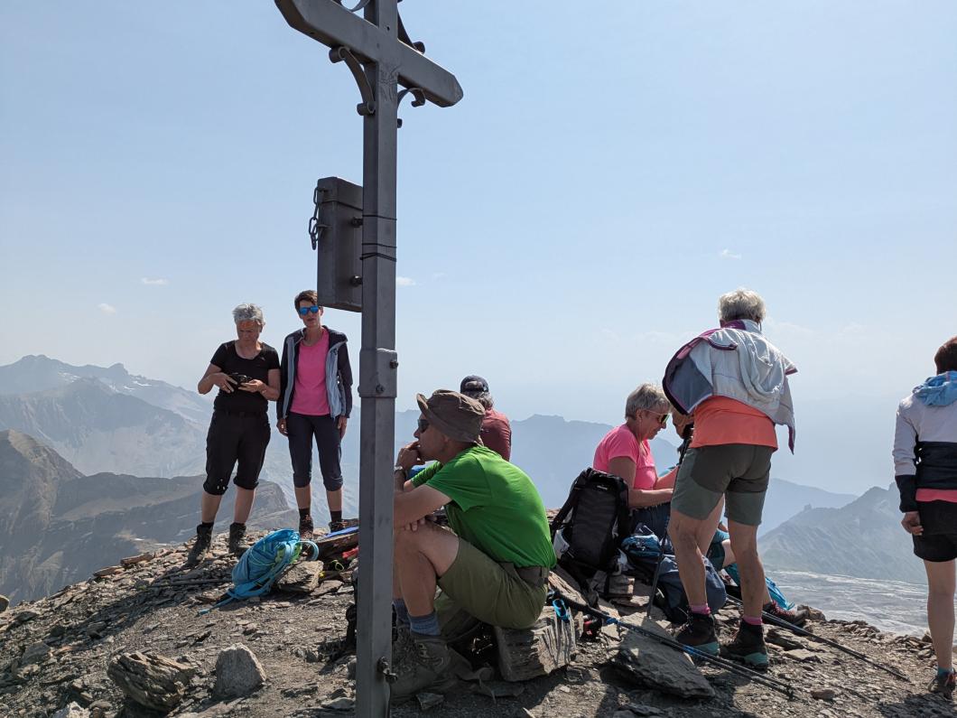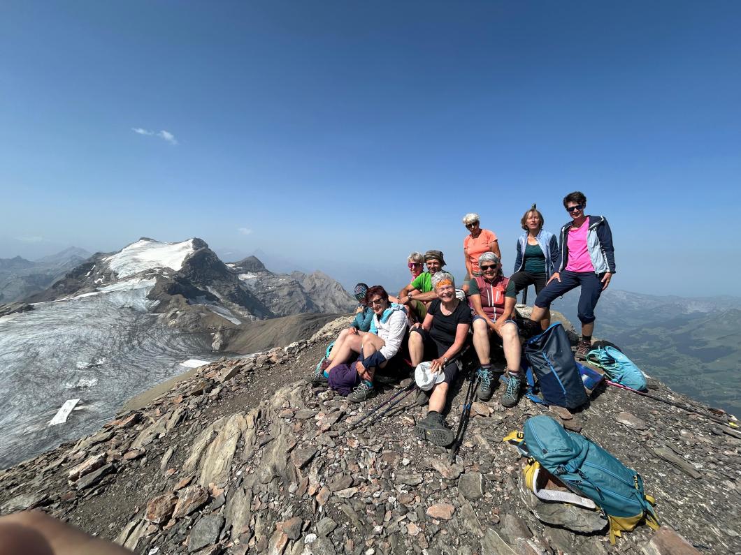 | Tourenbericht Unsere Tourenleiterin ist kurzfristig krankheitshalber ausgefallen, so übernahm Erwin die Leitung der Tour. Wegen der heissen Wetterprognose fuhren wir in Adelboden um 4 Uhr los, so konnten wir in morgendlicher Frische bereits um 6 Uhr bei der Talstation Reusch unseren Aufstieg Richtung Oldenhorn in Angriff nehmen. Zügig ging es stets Bergauf, ein abwechslungsreicher Weg lange noch im kühlen Schatten gings durchs Oldetäli zum Oldesattel, dann stiegen wir auf steinigem Rücken immer steiler durchs Geröll hinauf zum Gipfel. Leider ist heute die Sicht sehr trüb und wir konnten die Walliser Alpen im Dunst kaum erkennen. Nach einem feinen Picknick mit Beobachtung von einigen Gänsegeiern und einem Bartgeier machten wir uns an den Abstieg. Wir entschieden uns, anstatt hinauf zur Bergstation von Glacier 3000, hinunter zur Cabanne des Diablerets zu wandern. Entlang des von der Hitze geplagten, aber trotzdem kühlen Zanfleuron Gletscher gings über den Col de Zanfleuron hinunter zur Cabanne, wo wir noch Kaffee und Kuchen oder ein erfrischendes Getränk genossen. Danach liessen wir uns von der grossen Luftseilbahn bequem hinunter zum Col du Pillon, und mit dem Bus zurück zum Ausgangspunkt befördern. Danke Erwin für die kurzfristige Leitung der Tour, und allen für den wunderschönen Tag, den wir gemeinsam erleben durften. Bericht: Madeleine Lauber |