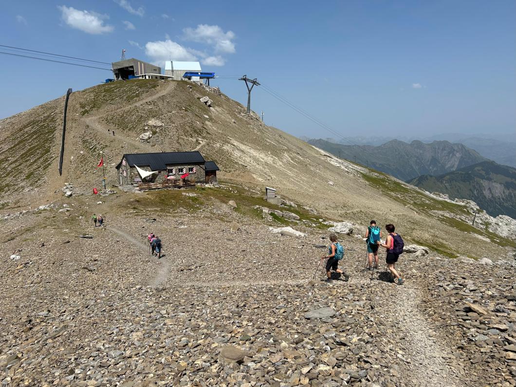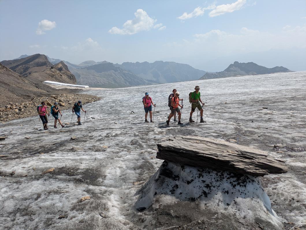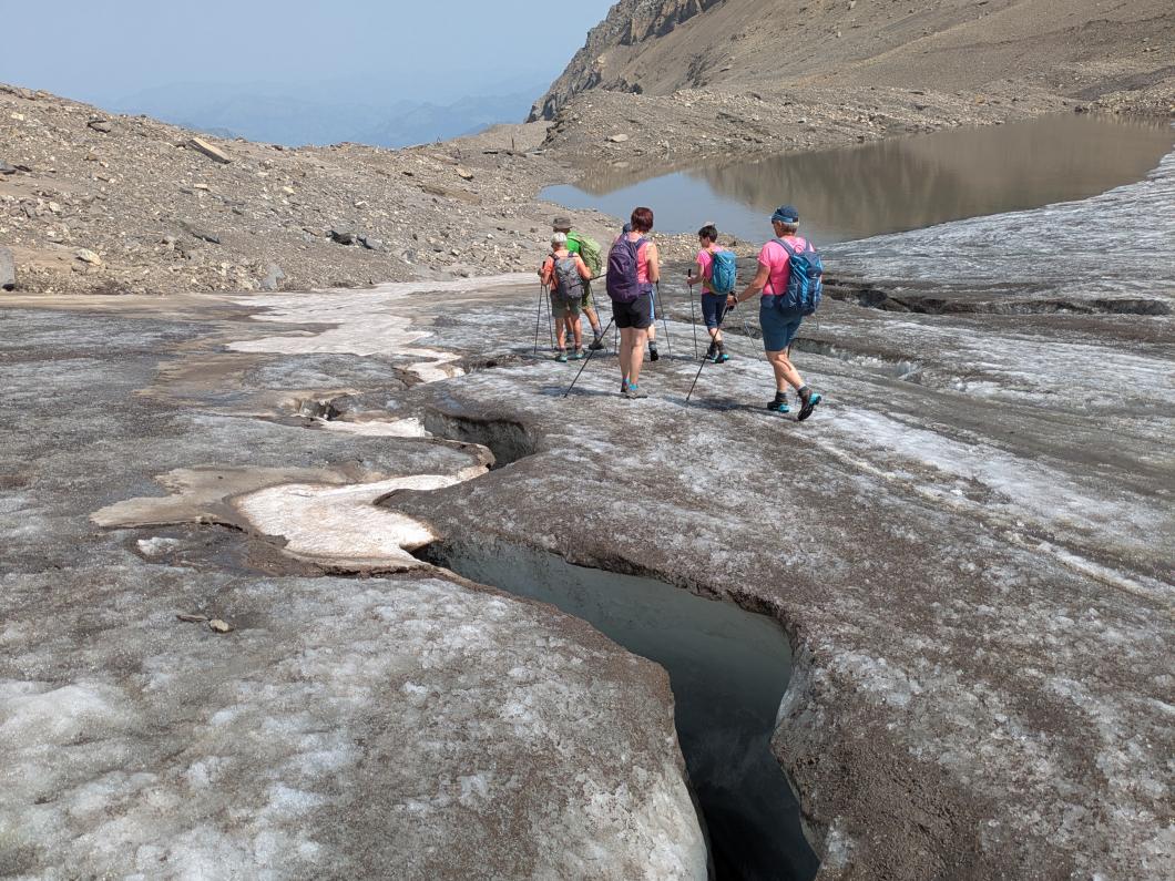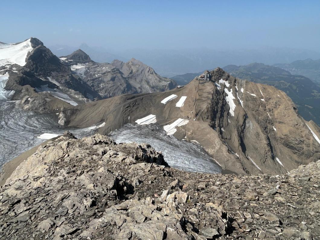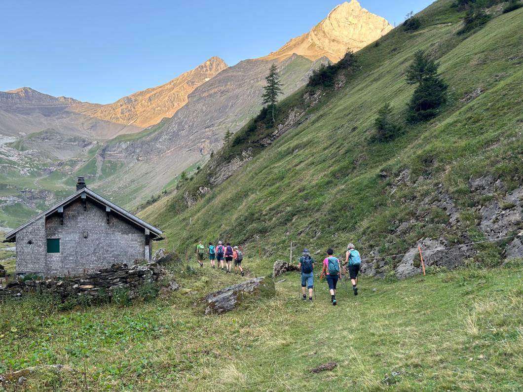 | Tourenbericht Unsere Tourenleiterin ist kurzfristig krankheitshalber ausgefallen, so übernahm Erwin die Leitung der Tour. Wegen der heissen Wetterprognose fuhren wir in Adelboden um 4 Uhr los, so konnten wir in morgendlicher Frische bereits um 6 Uhr bei der Talstation Reusch unseren Aufstieg Richtung Oldenhorn in Angriff nehmen. Zügig ging es stets Bergauf, ein abwechslungsreicher Weg lange noch im kühlen Schatten gings durchs Oldetäli zum Oldesattel, dann stiegen wir auf steinigem Rücken immer steiler durchs Geröll hinauf zum Gipfel. Leider ist heute die Sicht sehr trüb und wir konnten die Walliser Alpen im Dunst kaum erkennen. Nach einem feinen Picknick mit Beobachtung von einigen Gänsegeiern und einem Bartgeier machten wir uns an den Abstieg. Wir entschieden uns, anstatt hinauf zur Bergstation von Glacier 3000, hinunter zur Cabanne des Diablerets zu wandern. Entlang des von der Hitze geplagten, aber trotzdem kühlen Zanfleuron Gletscher gings über den Col de Zanfleuron hinunter zur Cabanne, wo wir noch Kaffee und Kuchen oder ein erfrischendes Getränk genossen. Danach liessen wir uns von der grossen Luftseilbahn bequem hinunter zum Col du Pillon, und mit dem Bus zurück zum Ausgangspunkt befördern. Danke Erwin für die kurzfristige Leitung der Tour, und allen für den wunderschönen Tag, den wir gemeinsam erleben durften. Bericht: Madeleine Lauber |
