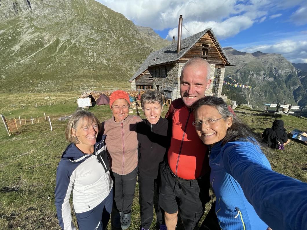 Wir marschieren denn auf dem Single Trail mit Höhenweg-Charakter entlang des Val Malvaglia-Tals. Dank der Verspätung sind wir nicht mehr der Sonne ausgesetzt, ein paar Wolken - wir sind dankbar - begleiten uns. Der Blick ins tiefe Tal, die Nadelwälder, dann - es geht um die Kurve - der Blick zur Hütte. Wir erzählen, tauschen uns aus, geniessen die Wanderung, und stehen im Nu vor der Hütte. Der zügige Nordwind hält uns davon ab, draussen sitzend den Durst zu löschen, so setzten wir uns, bestückt mit den durch das Hüttenteam selbstgebackenen feinen Kuchenstücken an unseren bereits reservierten Tisch, besprechen die morgige Tour. Ein kurzes und kühlwindiges Verweilen draussen, um den morgigen Start anzuschauen - dort hinauf, im Zickzack, führt der Weg. Spaghetti ist der Favorit für das Z'Nacht, doch es kommt anders: Polenta mit Kalbsragout (Markus Antiliebe zu Polenta ist offensichtlich...), gut gewürzt, das Fleisch fein. Beim Dessert kommen wir nicht aus dem Staunen, denn das hat noch keiner von uns erlebt: ein ofenwarmes, halbes Öpfeli mit einer Espressolöffeli-grossen (oder doch eher kleinen), undefinierbaren Creme - wir schmunzeln, und genissen die Apfelwärme. Ein Génépi rutscht noch die Kehle runter, dann geht's ab in unseren Privatschlag, welch ein Privileg: wir fünf in einem Fünferzimmer!