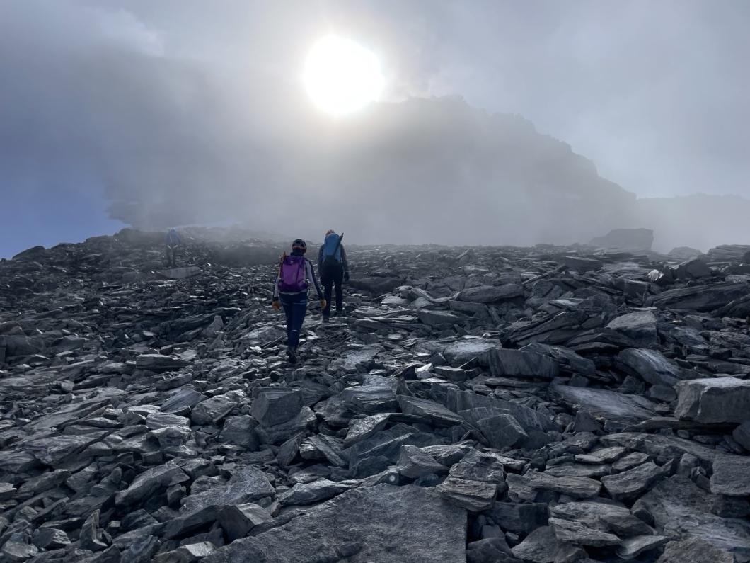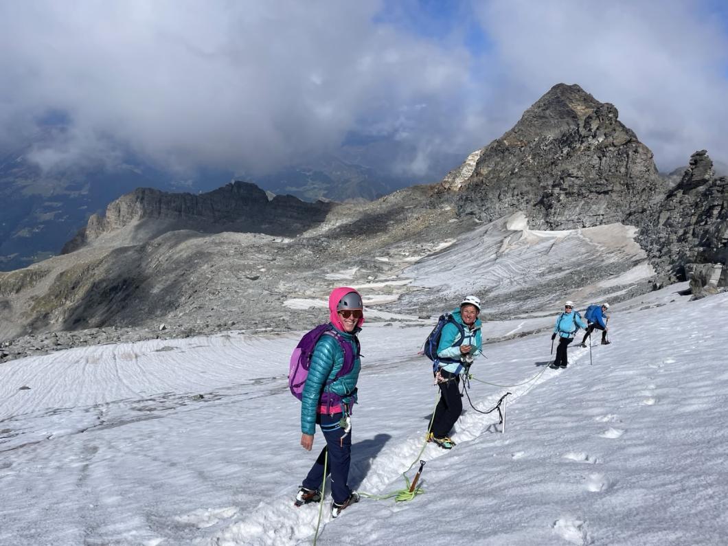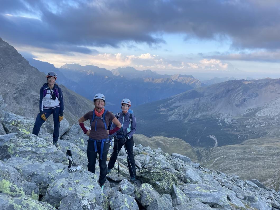Tagwacht um 04:45, Z'morge, und schon geht's 5:40 ab in die Dunkelheit, bestückt mit unseren Lampen, die uns den Weg weisen. Windstill, zum Glück. Beim Passo del Laghetto gehts rechterhand weiter, die blauen Punkte erspäht Markus, der mit Tempo vorangeht, perfekt - seine Fitness ist nicht von der Hand zu weisen. Bei den Drahtseilen schlüpfen wir in die Gstältli, beim Kamin mit den Ketten seilen wir uns an, und schon haben wir die Steilstufe überwunden. Vom folgenden Plateau aus zielen wir auf den Grat respektive zum Pilz. Dort gehts, weil der Felsen von den Nebelschaden teils glitschig ist, mit Seilsicherung um dieses Felststück herum, danach weiter zum nahen Gipfel. Eine grandiose Aussicht ist uns leider verwehrt, dennoch quasi «episch» mutet die Sicht mit den Nebelfetzen um das Gipfelgebiet; wir sehen nicht bis zum Monte Bianco, dennoch erspähen wir die Furkagegend, und werfen einen Blick ins tiefe Bleniotal. Nach kurzer Rast mit obligatem Gipfelselfie montieren wir die Steigeisen und steigen im Firn zum Adulajoch, und weiter über den mittlerweile Mini-Gletscher zu den Felsen hinunter, wo wir die Hochgebirgsausrüstung im Rucksack verstauen. In der Capanna Adula UTOE erhaschen wir die letzten Kuchenstücke, und entscheiden uns aus Zeitgründen - die Gruppe will ja noch bis nach Hause - für den Abstieg via Val Soi nach Dangio, was insgesamt 1700 Höhenmeter Abstieg bedeutet. Ein Getränk im Grotto Adula, ein Fussbad im Brunnen von Dangio, und schon kommt der Bus, der die 4 Richtung Auto und heimwärts führt, derweil die Schreibende ein kühles Bier im Grotto geniesst, bevor es da zum feinen Z’nacht geht – ein Privileg der Mehr-Zeit respektive des Noch-Verweilens im schönen Val des Sole (Bleniotal).