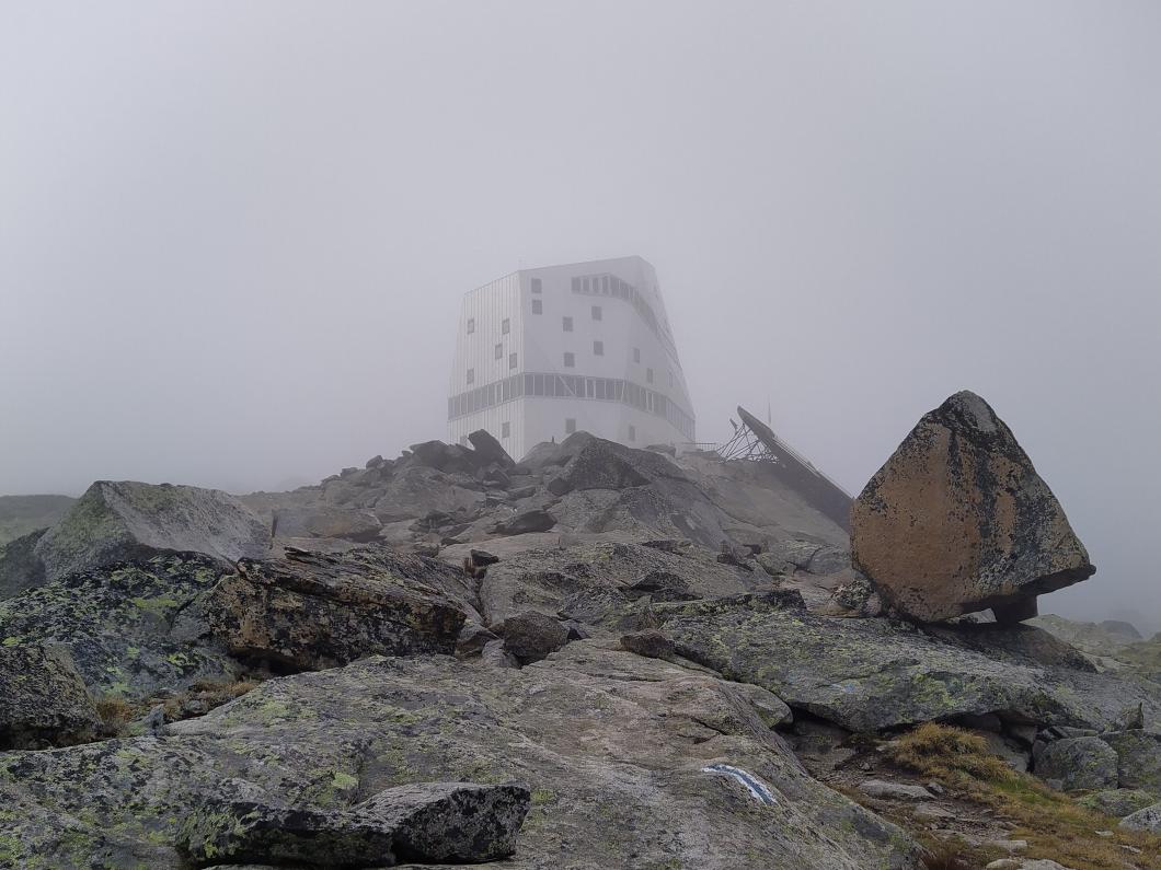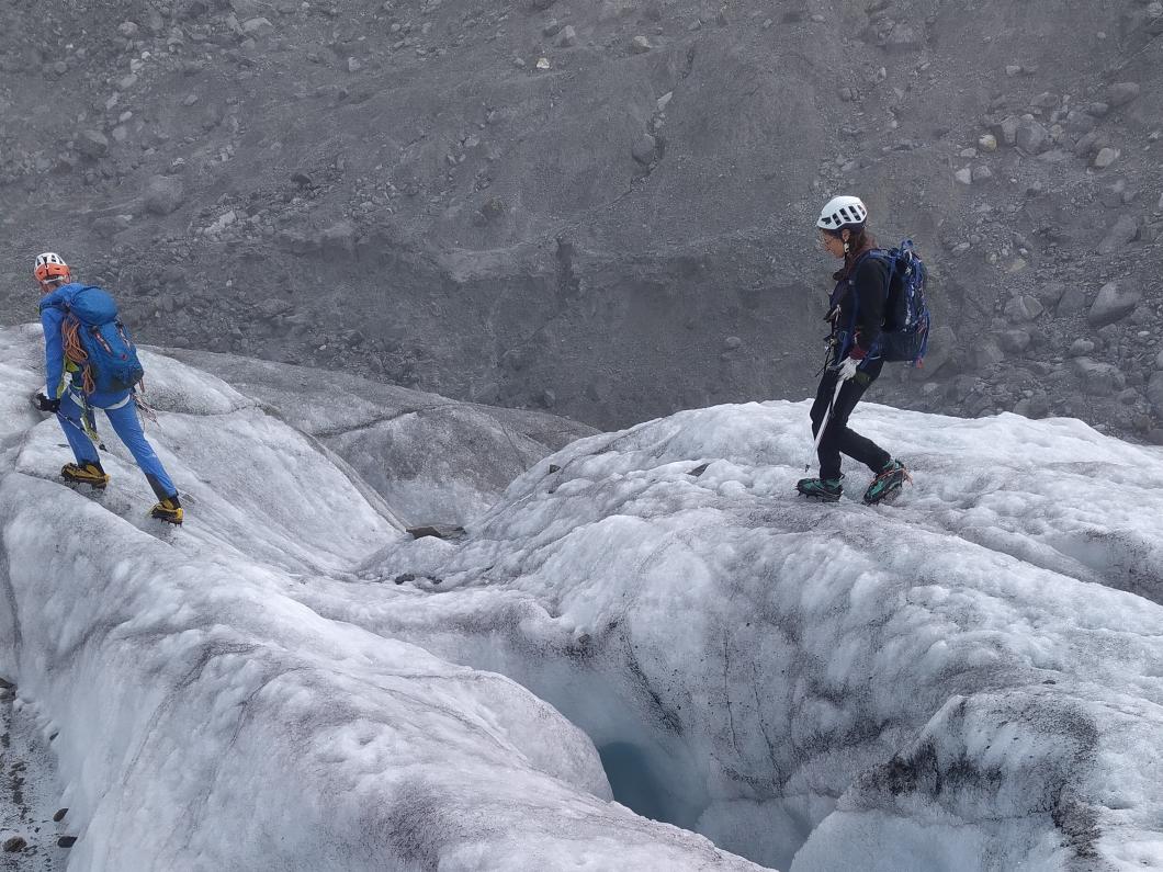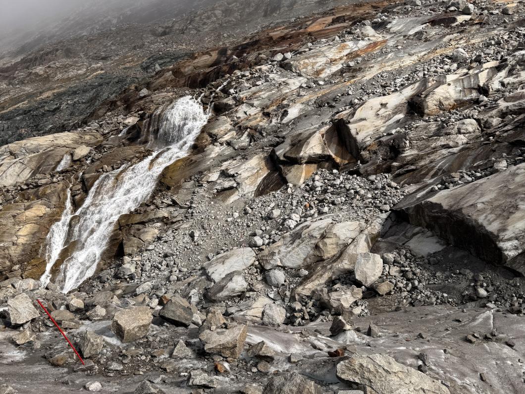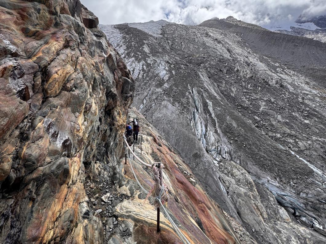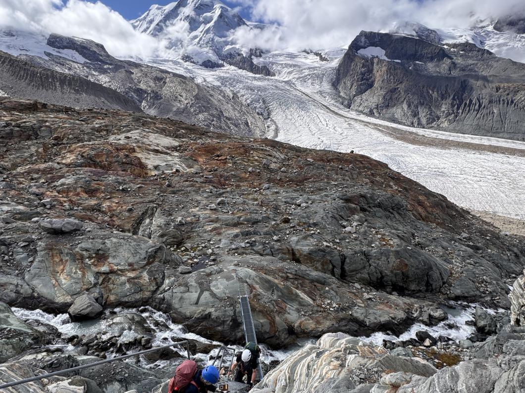 Bei schönstem Wetter, das «Horu» war aber an beiden Tagen in den Wolken, machten wir uns auf zum Gorner-Gletscher ‘hinunter’. Nach der Mittagsrast stiegen wir über den Gletscher hinauf bis knapp 2900m ü.M., dann leiteten die Markierungsstangen durch die Spaltenzone an den Gletscherrand. Nach knapp einer weiteren Stunden schon fertig und bald in der Hütte? Nein. Der gut blau-weiss-blau markierte Weg führte uns durch Blocksteinfelder, mit leichter Kletterei, einigen Treppen und Brücken unterhalb des Monte-Rosa-Gletschers weiter. Die Bewölkung nahm immer mehr zu, ein Wetterluft zog auf, über Zermatt gewitterte es seit bald einer Stunde. Vorwärtsmachen war angesagt. Nur wenige Minuten vor dem Graupel-Gewitter erreichten wir um 1600 nach 4h 30’ die Hütte. Wir waren am ‘Schärme’.