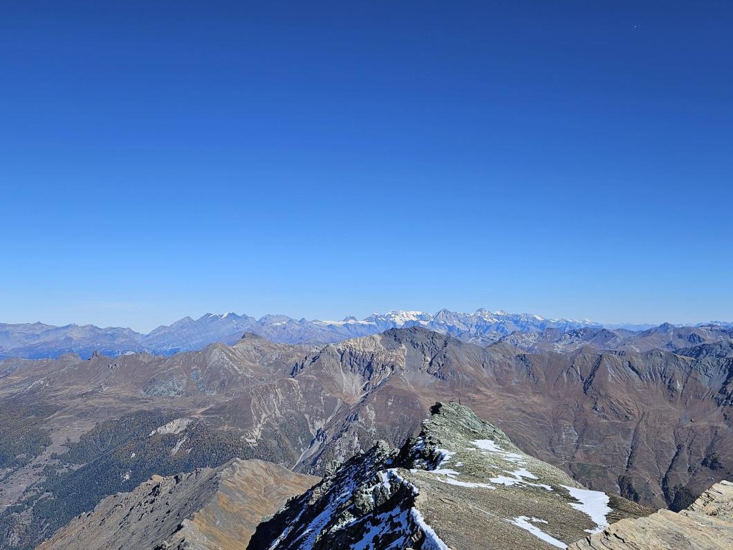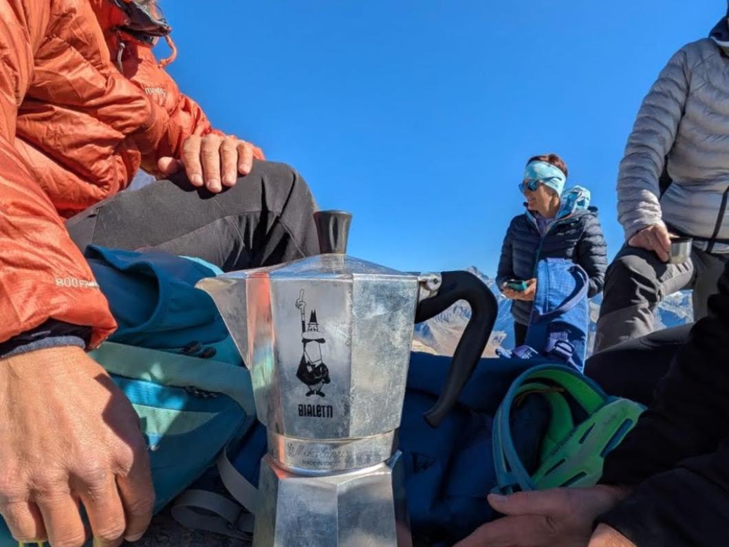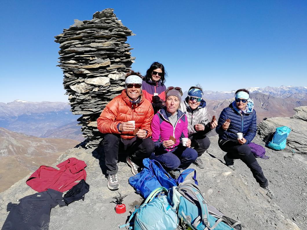 Der Höhepunkt der Wanderung war der Gipfel des Mont de l`Etoile, 3369 m. Kaum angekommen erwartete uns eine wahre Überraschung: Yvonne servierte uns frisch gekochten Kaffee aus ihrem mitgebrachten Bialetti-Kaffeekocher mit köstlichem Schoggi Cake nach Grossmutters Rezept. Der Genuss dieser Leckereien auf dem Gipfel, begleitet von einer atemberaubenden Rundsicht auf die schneebedeckten 4-Tausender Gipfel machten diesen Moment unvergesslich.