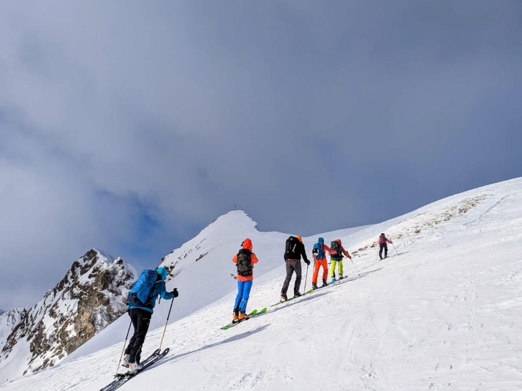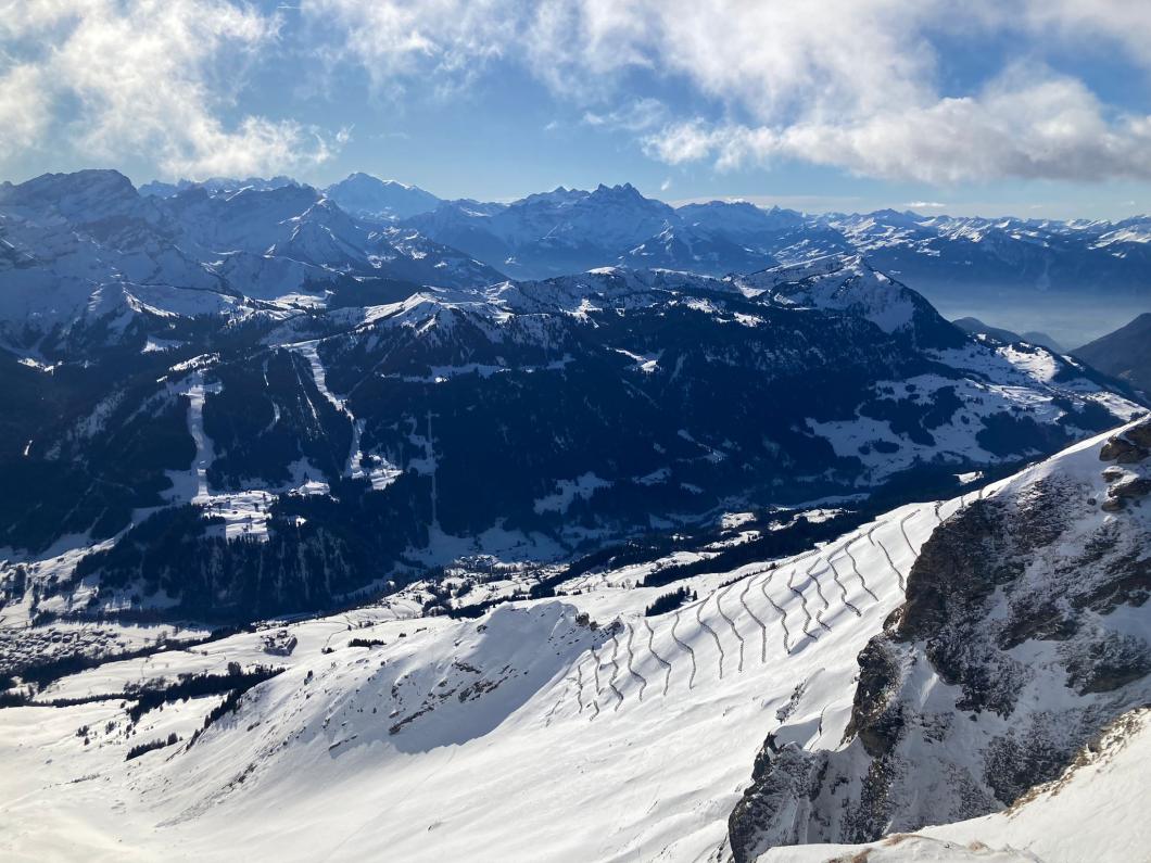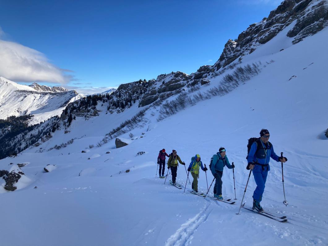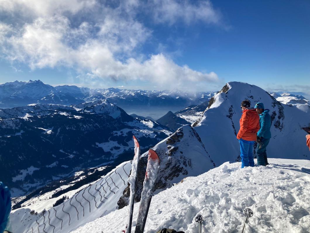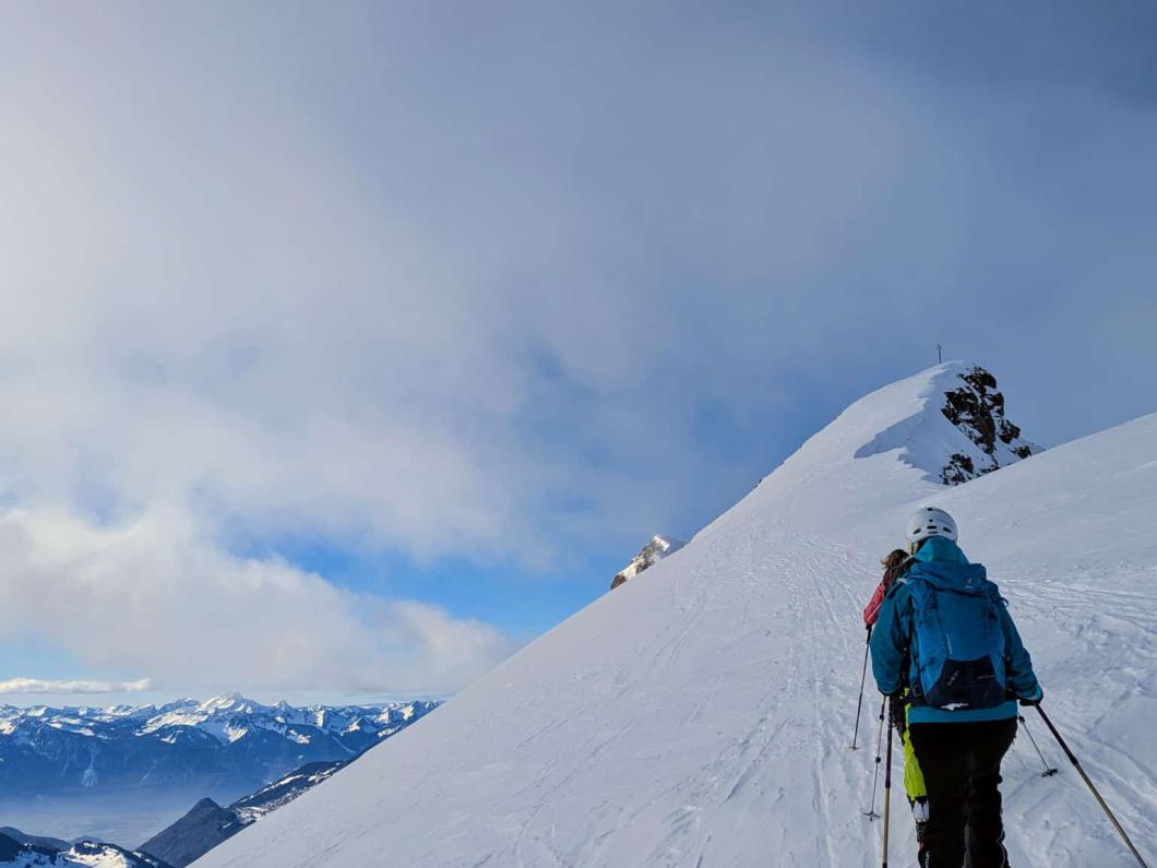 | Tourenbericht Bei frischen Temperaturen erreichen alle noch frischen Teilnehmer:innen den Treffpunkt beim Maison de l’Etivaz pünktlich. 17 an der Zahl, von der Jüngsten zur Ältesten besteht eine Differenz von 50 Jahren! Schön, dass wir in dieser Konstellation auf Tour gehen können. Ursula teilt die Menge in drei Gruppen ein. Taleinwärts geht es vorerst in gemächlicher Steigung dem Bach und der Strasse entlang. Auf 1800 Metern legen wir eine erste Pause ein. Stetig aufwärts in der schönen Waadtländer Landschaft ziehen wir uns kurz unter dem Col de Seron wärmere Kleidung an. Von nun an ist der Nordwind unser Begleiter. Der Gipfel ist bald sichtbar. Dass wir auf dem kleinen Gipfel-Plateau alle Platz haben und der Wind dort merklich nachlässt, hätten wir aus der Distanz nicht gedacht. Über unseren Köpfen begrüsst uns der Bartgeier, was für ein imposantes Tier. Nebst vielen kleinen und grossen Gipfeln können wir auch das berühmte Mont Blanc Massiv gleich uns gegenüber bestaunen. Was für ein Genuss! Die Abfahrt beginnt recht ruppig und erst nach dem Col de Seron finden wir schöne Hänge und wunderbaren Pulverschnee. Unterwegs erfahren wir Interessantes über die Luchs- und Hasenspuren, welche Christian im Schnee entdeckt. Zurück auf dem Parkplatz von l’Etivaz stürmen wir die Fromagerie. Nach unseren Einkäufen können sie wohl grad Feierabend machen 😊. Herzlichen Dank von allen Teilnehmenden der Organisatorin Ursula sowie ihren Helfern Ruedi und Christian für die flotte Tour enet der Kantons- und Sprachgrenze. À toute… Evelyne |