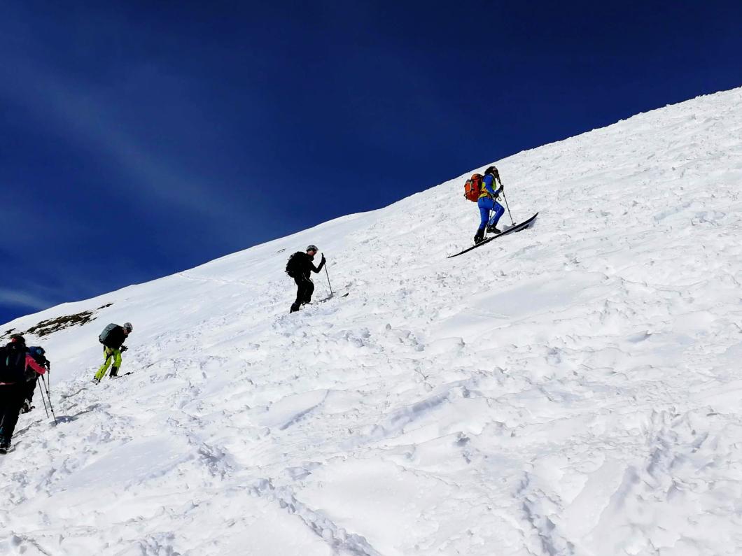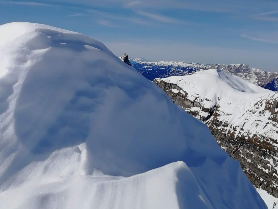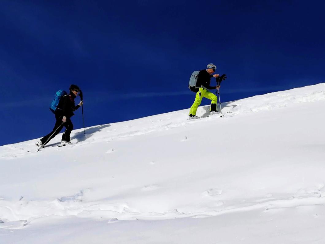 | Tourenbericht Kurz nach 8:00 Uhr erreichen wir mit zwei Autos den Treffpunkt an Falchern oberhalb von Meiringen. Den Nebel haben wir kurz vorher hinter uns gelassen, der wolkenlose Himmel ist vielversprechend. Gleich beim Parkplatz schnallen wir die Skier an, nun steigen wir gemütlich an der schneebedeckten Schattseite des Haslitals höher. Vorbei an abgeschiedenen Weid- und Alphütten, alten Ahornbäumen, zugefrorenen Bergbächen, eisigen Felsen und sanften Ebenen. Sich in dieser abwechslungsreichen, verträumten Winterlandschaft zu bewegen, ist ein Genuss! Der über 500 hm. lange Gipfelhang sieht beeindruckend steil aus, aber mit der guten Spur von Michèle und den vielen geübten Spitzkehren unserer Gruppe erklimmen wir auch diesen problemlos. Oben auf dem Gipfel geniessen wir den Weitblick auf das grosse Nebelmeer über dem Haslital und ennet dem Brünig und das herrliche Bergpanorama rundherum. Nach einer ausgiebigen Gipfelrast und dem obligaten Gruppenfoto, welches einer der zwei anderen Tourengänger, übrigens den einzigen auf gleicher Route, von uns knipst, machen wir uns auf die lange Abfahrt. Zuerst durch aufgeweichten Plüttersulz, danach durch immer besser werdenden Pulverschnee gehts rassig zurück zum Ausgangspunkt. In Meiringen löschen wir noch den Durst, und lassen bei einem Stück Haslichueche den Tag Revue passieren. Danke Michèle für die Organisation und Durchführung dieser wunderschönen Tour! Bericht: Madeleine Lauber |