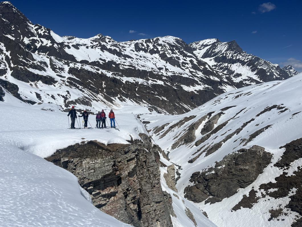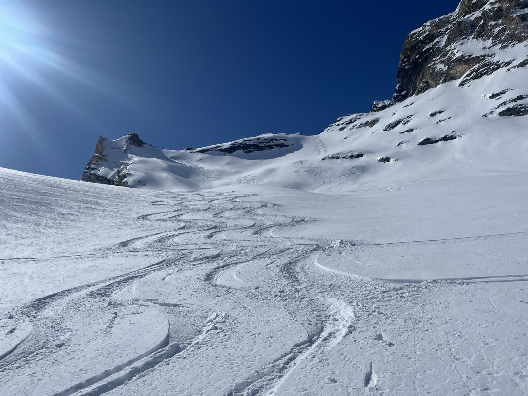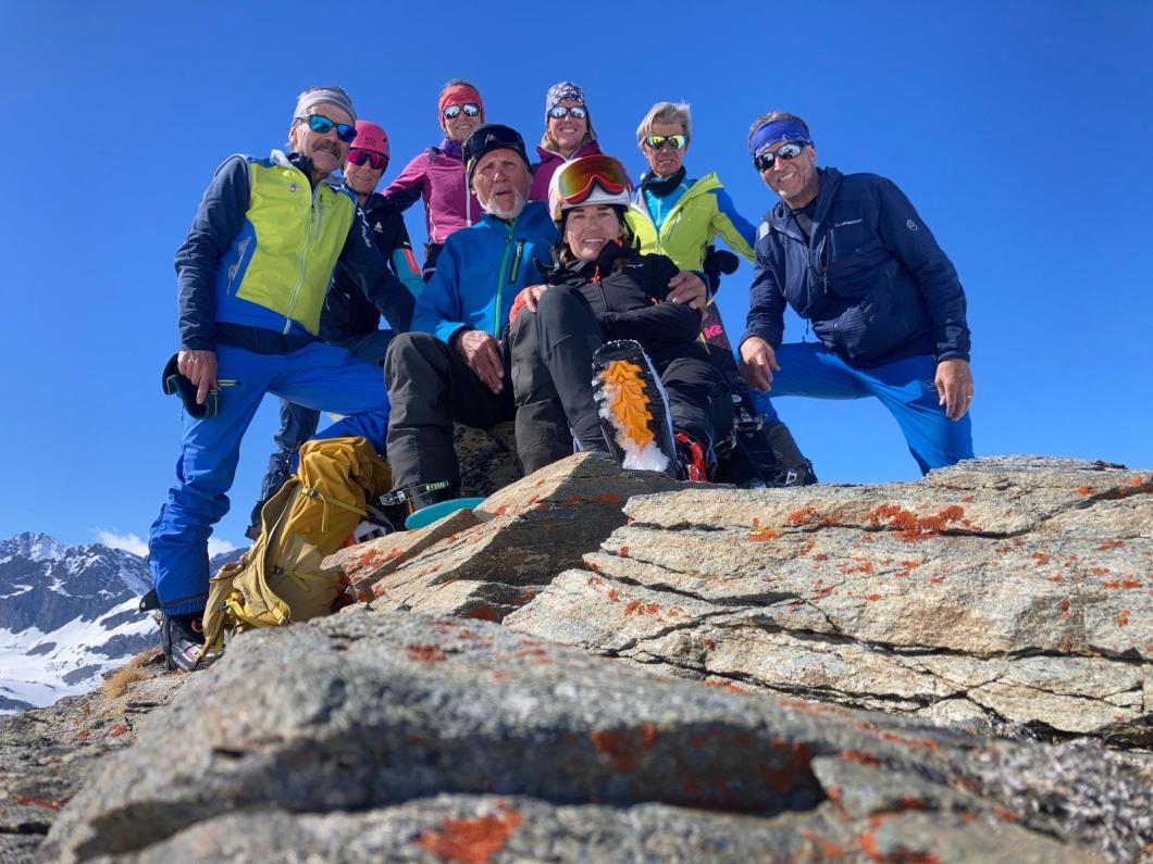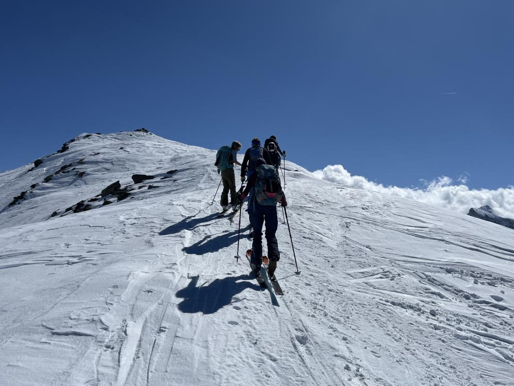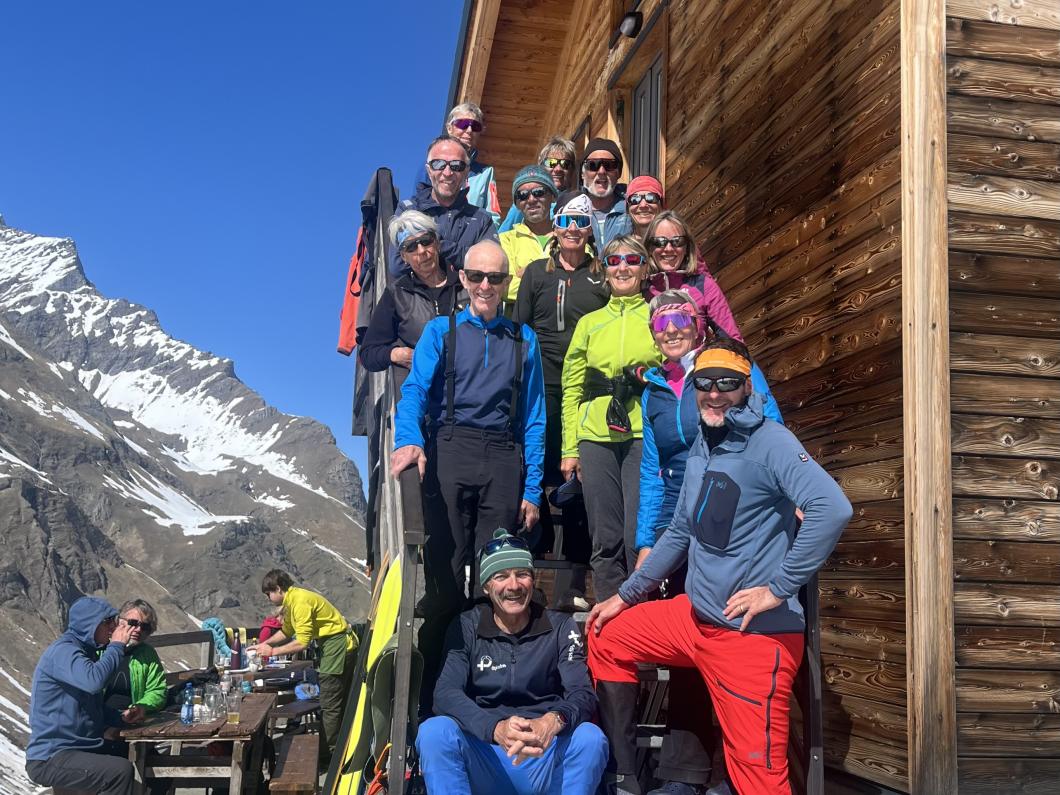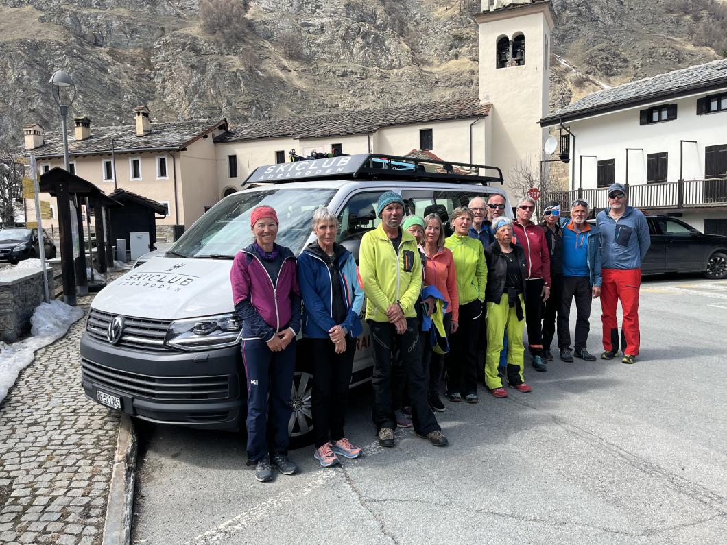 | Tourenbericht 1.Tag Früh und gut gelaunt fuhren wir in Adelboden los Richtung Val di Rhêmes. In Rhêmes Notre Dame parkierten wir und zogen Richtung Benevolo Hütte los. Nur ein einziges Mal mussten wir auf dem Hüttenweg wegen Schneemangel kurz die Skis tragen Nach einer kurzen Pause in der Hütte machten wir uns auf, um den Punta della Paletta zu besteigen. Es war sehr warm und der Aufstieg musste ein bisschen erkämpft werden. Aber es lohnte sich, die Aussicht war grandios und auf der Abfahrt hatten wir wunderbaren Sulzschnee. 2.Tag Zuerst stiegen wir alle auf den Punta Calabre. Erwin führte seine Gruppe noch auf den Roc Basagne. Um diesen Gipfel zu erreichen musste die Gruppe die Skis ein paarmal an- und abfellen. Die Route sah folgendermassen aus: Abfahrt nach Norden, Aufstieg zum Col di Rhême, Abfahrt nach Süden und Aufstieg zum Gipfel. Fritz fuhr mit seiner Gruppe direkt zurück zur Hütte. 3.Tag Heute war unser erstes Tagesziel Punta Galisia. Nach zwei Tagen mit Schwitzen, frierten wir beim Aufsteigen. Oben teilten wir uns in drei Gruppen. Fritz fuhr mit seiner Gruppe direkt zurück zur Hütte. Ruedi machte Einige gluschtig das Culoir zwischen Punte Galisia und Roc Basagne abzufahren. Erwin bot seiner Gruppe an den Punte Basei zu besteigen. Dazu wurde zuerst nordwärts abgefahren, nachher noch ein Stück traversiert und aufgestiegen zum Colle Basei und weiter den Spuren nach über den Grat bis zu den Gipfelfelsen. Wir nahmen an, dass hier der „Wintergipfel“ ist. Auf der Abfahrt hatten wir wunderbaren Pulver an den Nordhängen und Sulz an den Südhängen. 4.Tag Rund um den Granta Parei war für die Gruppe von Erwin der Tourenplan. Aufstieg zum Colle Tsantelleina, Abfahrt auf den Glacier de Rhêmes-Colette, Aufstieg zum Grat vom Ricco di Coletta (Punkt 3228m) und Abfahrt zurück zur Hütte. Fritz und Ruedi bestiegen mit ihrer Gruppe auf der gleichen Runde zusätzlich den anspruchsvollen Punta Tsanteleina. Ruedi machte eine super Spur. Herausfordernd waren die Spitzkehren, die letzten Meter vor dem Gipfel (40°) und auch beim Abfahren war Vorsicht die erste Priorität. Auf dem Rückweg gelang es Fritz die Gruppe zu überzeugen, den auf dem Weg liegenden Becca Traviersière auch noch zu erklimmen. 5.Tag Fritz führte seine Gruppe auf den Roc de Basagne. Ruedi und Erwin boten den Roc dal Fond mit alpinen Herausforderungen an. Zuerst wurde der Aufstieg gemacht wie gestern die Abfahrt und weiter zum Picco di Colletta. Dieser flache Hügel war anspruchsvoller als gedacht! Weiter gings mit der Abfahrt zum Colle Tsanteleina, dann wurde der Gletscher di Tsanteleina überquert und wieder aufgestiegen zum Col di Rhêhme. Nun war noch der herausfordernde Gipfelanstieg zum Roc dal Font an der Reihe. Auf dem Gipfel war es windstill und die Gruppe genoss nochmals die Rundsicht, bevor sie wieder voll konzentriert abfuhr. 6.Tag Alle zusammen stiegen wir auf zum Gran Vaudala und fuhren durchs Vallone della gran Vaudala zurück nach Rhêmes Notre Dame. Es war eindrücklich wie viel Schnee geschmolzen war. Die Skis mussten eine längere Strecke getragen werden. Am Morgen war das Wetter noch schön und im Laufe des Vormittags nahm die Bewölkung und der Wind zu. Als wir zurück bei den Autos waren gabs ein paar Regentropfen. Dankbar, dass wir die Tourentage ohne Unfälle, bei so schönem Wetter, idealen Schneeverhältnissen und guter Gemeinschaft verbringen durften, machten wir uns auf den Heimweg. Die vielen schönen Erinnerungen werden uns zurück in den Alltag begleiten. |