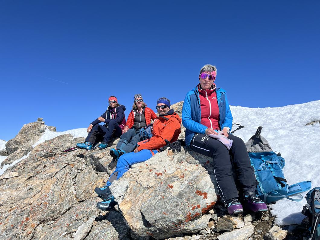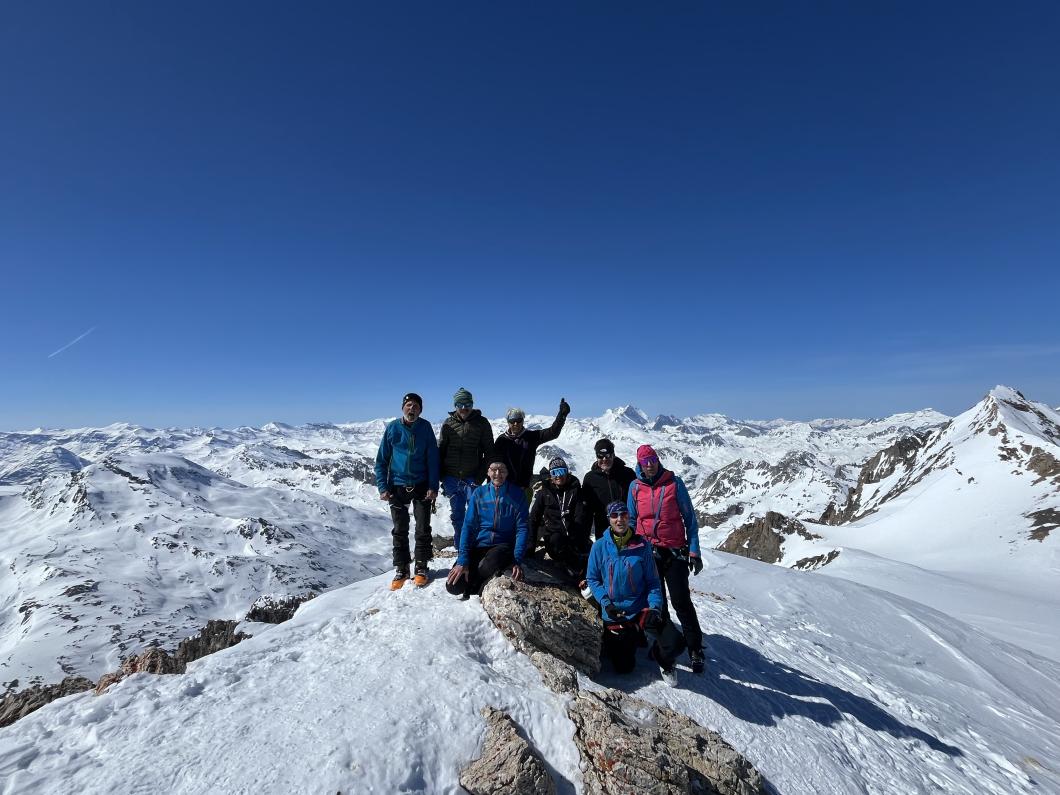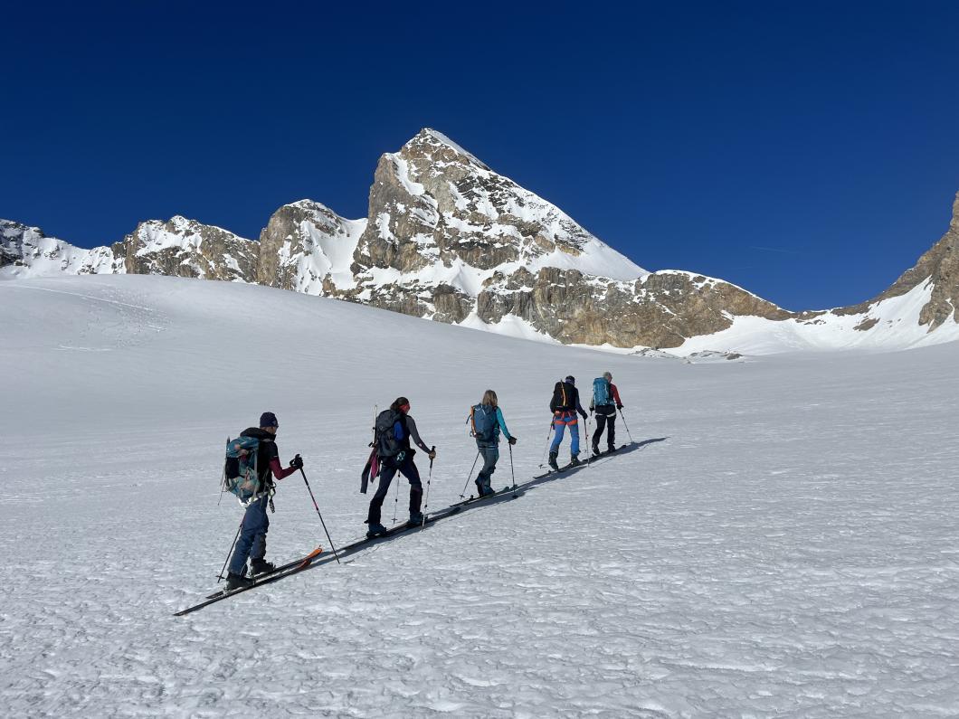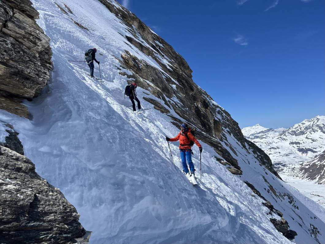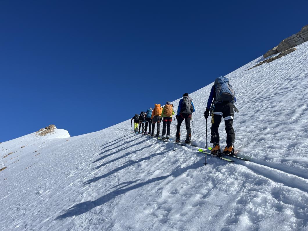 | Tourenbericht 1.Tag Früh und gut gelaunt fuhren wir in Adelboden los Richtung Val di Rhêmes. In Rhêmes Notre Dame parkierten wir und zogen Richtung Benevolo Hütte los. Nur ein einziges Mal mussten wir auf dem Hüttenweg wegen Schneemangel kurz die Skis tragen Nach einer kurzen Pause in der Hütte machten wir uns auf, um den Punta della Paletta zu besteigen. Es war sehr warm und der Aufstieg musste ein bisschen erkämpft werden. Aber es lohnte sich, die Aussicht war grandios und auf der Abfahrt hatten wir wunderbaren Sulzschnee. 2.Tag Zuerst stiegen wir alle auf den Punta Calabre. Erwin führte seine Gruppe noch auf den Roc Basagne. Um diesen Gipfel zu erreichen musste die Gruppe die Skis ein paarmal an- und abfellen. Die Route sah folgendermassen aus: Abfahrt nach Norden, Aufstieg zum Col di Rhême, Abfahrt nach Süden und Aufstieg zum Gipfel. Fritz fuhr mit seiner Gruppe direkt zurück zur Hütte. 3.Tag Heute war unser erstes Tagesziel Punta Galisia. Nach zwei Tagen mit Schwitzen, frierten wir beim Aufsteigen. Oben teilten wir uns in drei Gruppen. Fritz fuhr mit seiner Gruppe direkt zurück zur Hütte. Ruedi machte Einige gluschtig das Culoir zwischen Punte Galisia und Roc Basagne abzufahren. Erwin bot seiner Gruppe an den Punte Basei zu besteigen. Dazu wurde zuerst nordwärts abgefahren, nachher noch ein Stück traversiert und aufgestiegen zum Colle Basei und weiter den Spuren nach über den Grat bis zu den Gipfelfelsen. Wir nahmen an, dass hier der „Wintergipfel“ ist. Auf der Abfahrt hatten wir wunderbaren Pulver an den Nordhängen und Sulz an den Südhängen. 4.Tag Rund um den Granta Parei war für die Gruppe von Erwin der Tourenplan. Aufstieg zum Colle Tsantelleina, Abfahrt auf den Glacier de Rhêmes-Colette, Aufstieg zum Grat vom Ricco di Coletta (Punkt 3228m) und Abfahrt zurück zur Hütte. Fritz und Ruedi bestiegen mit ihrer Gruppe auf der gleichen Runde zusätzlich den anspruchsvollen Punta Tsanteleina. Ruedi machte eine super Spur. Herausfordernd waren die Spitzkehren, die letzten Meter vor dem Gipfel (40°) und auch beim Abfahren war Vorsicht die erste Priorität. Auf dem Rückweg gelang es Fritz die Gruppe zu überzeugen, den auf dem Weg liegenden Becca Traviersière auch noch zu erklimmen. 5.Tag Fritz führte seine Gruppe auf den Roc de Basagne. Ruedi und Erwin boten den Roc dal Fond mit alpinen Herausforderungen an. Zuerst wurde der Aufstieg gemacht wie gestern die Abfahrt und weiter zum Picco di Colletta. Dieser flache Hügel war anspruchsvoller als gedacht! Weiter gings mit der Abfahrt zum Colle Tsanteleina, dann wurde der Gletscher di Tsanteleina überquert und wieder aufgestiegen zum Col di Rhêhme. Nun war noch der herausfordernde Gipfelanstieg zum Roc dal Font an der Reihe. Auf dem Gipfel war es windstill und die Gruppe genoss nochmals die Rundsicht, bevor sie wieder voll konzentriert abfuhr. 6.Tag Alle zusammen stiegen wir auf zum Gran Vaudala und fuhren durchs Vallone della gran Vaudala zurück nach Rhêmes Notre Dame. Es war eindrücklich wie viel Schnee geschmolzen war. Die Skis mussten eine längere Strecke getragen werden. Am Morgen war das Wetter noch schön und im Laufe des Vormittags nahm die Bewölkung und der Wind zu. Als wir zurück bei den Autos waren gabs ein paar Regentropfen. Dankbar, dass wir die Tourentage ohne Unfälle, bei so schönem Wetter, idealen Schneeverhältnissen und guter Gemeinschaft verbringen durften, machten wir uns auf den Heimweg. Die vielen schönen Erinnerungen werden uns zurück in den Alltag begleiten. |