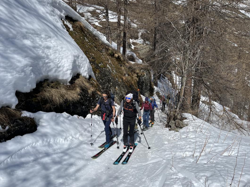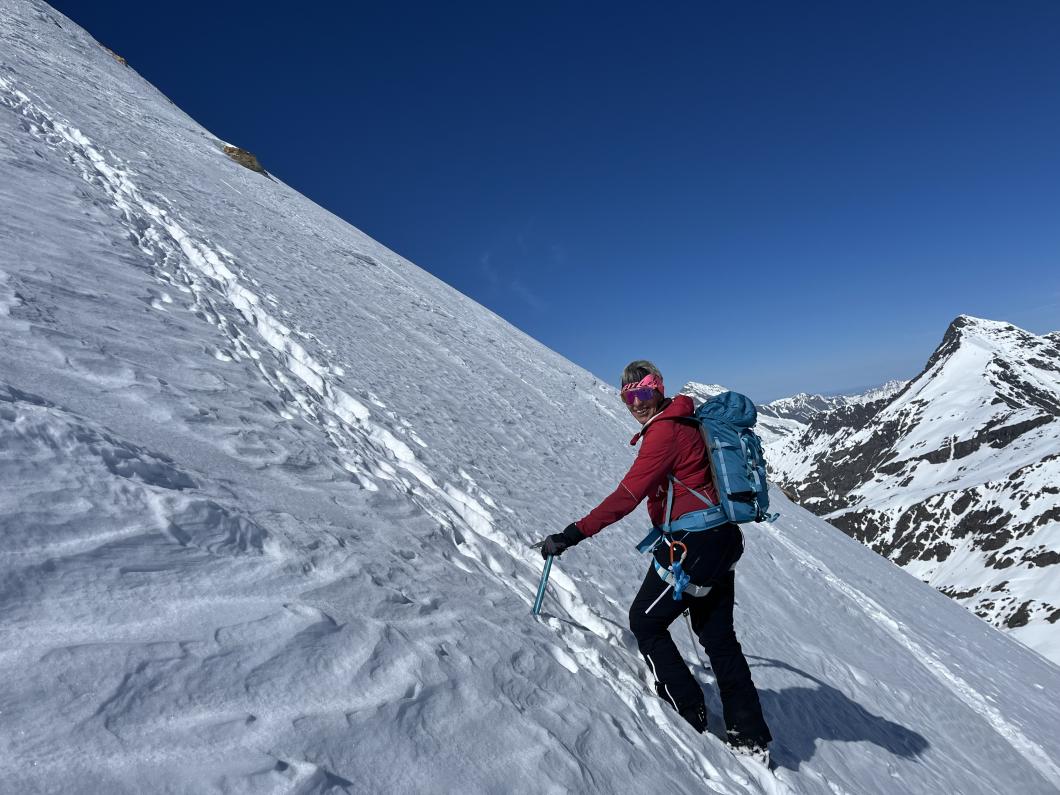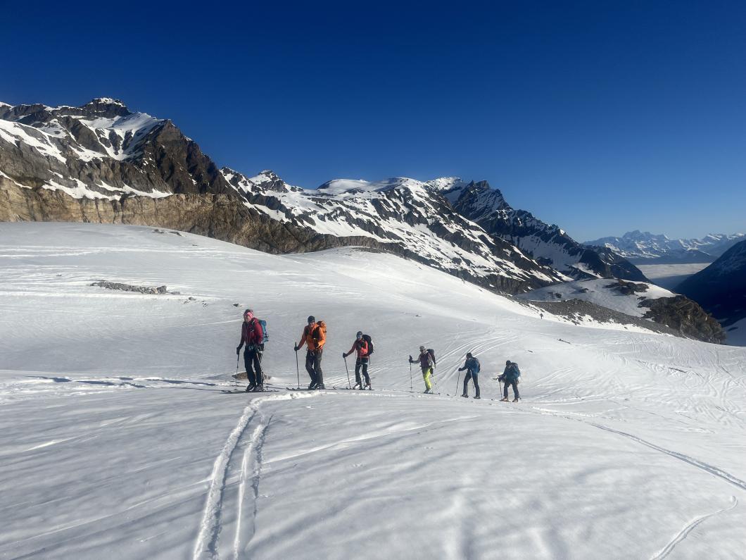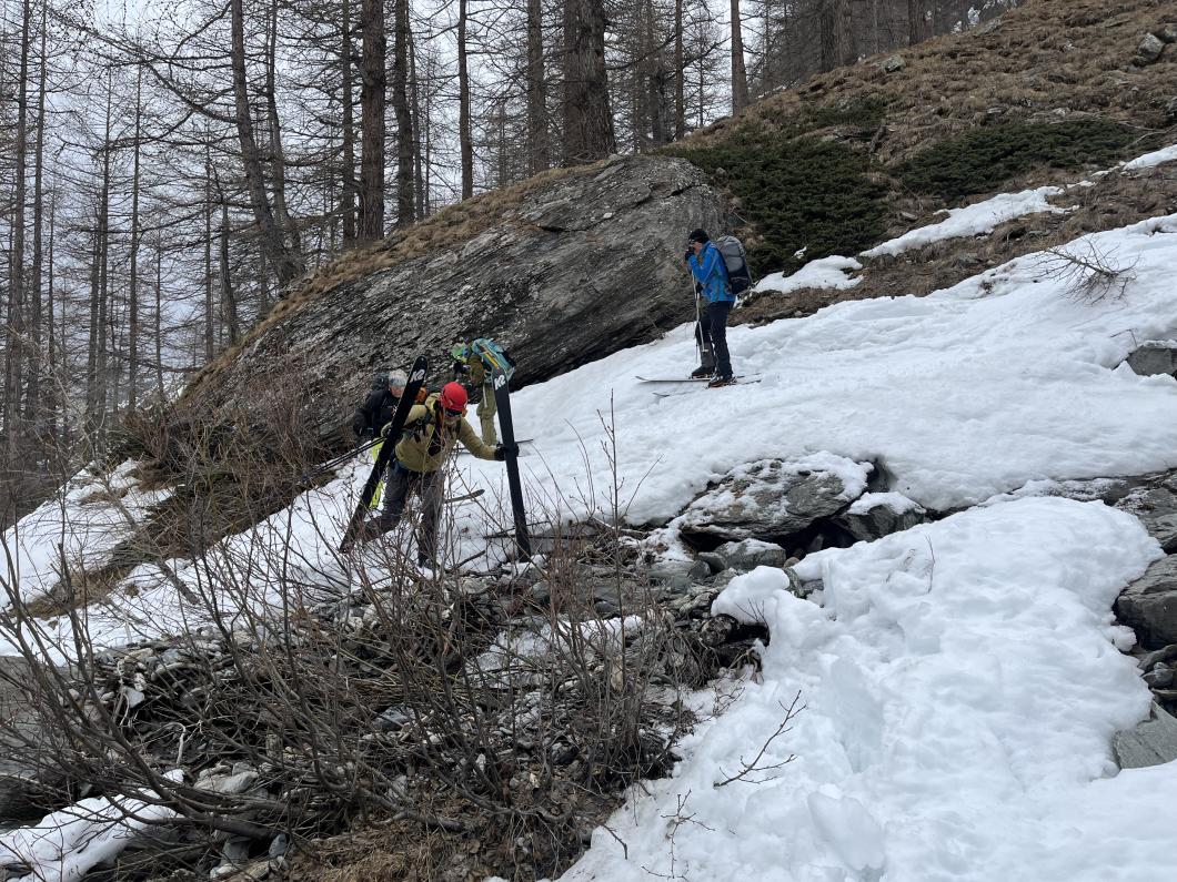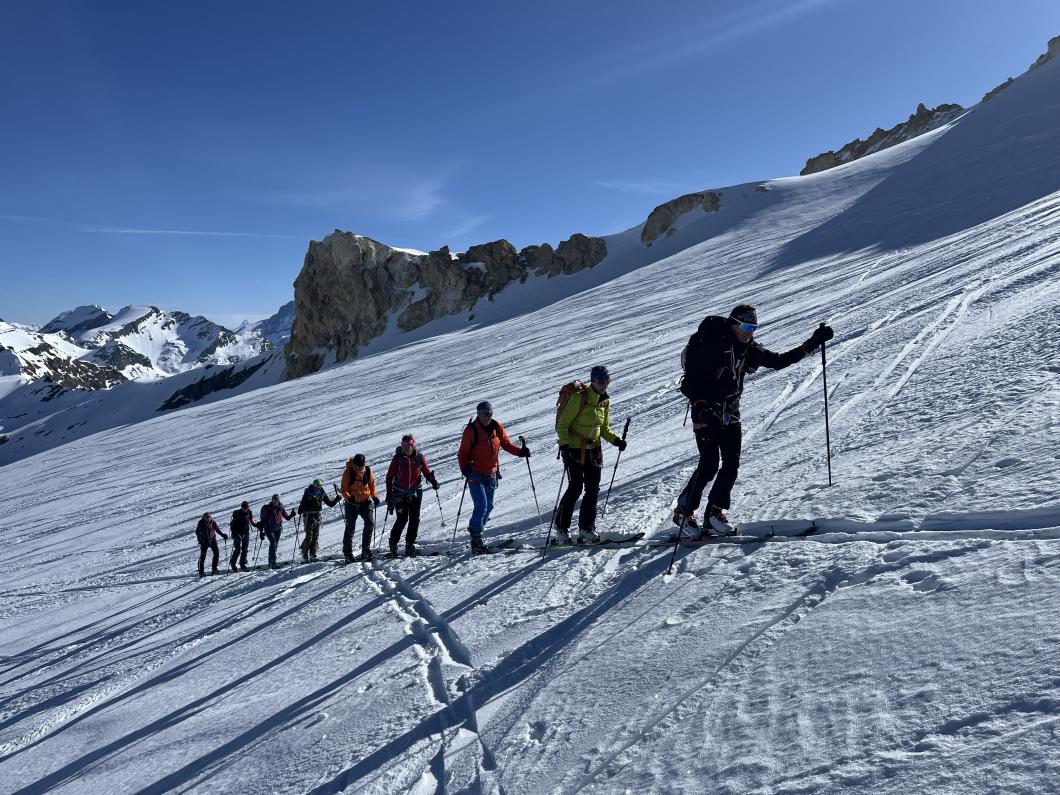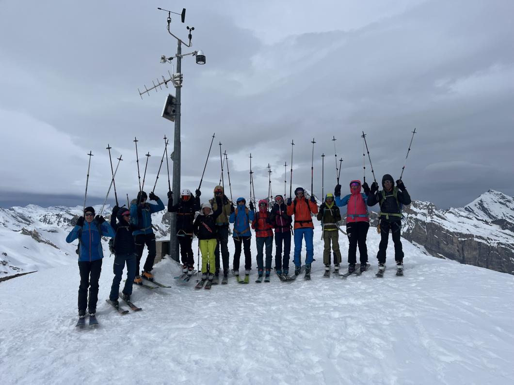 | Tourenbericht 1.Tag Früh und gut gelaunt fuhren wir in Adelboden los Richtung Val di Rhêmes. In Rhêmes Notre Dame parkierten wir und zogen Richtung Benevolo Hütte los. Nur ein einziges Mal mussten wir auf dem Hüttenweg wegen Schneemangel kurz die Skis tragen Nach einer kurzen Pause in der Hütte machten wir uns auf, um den Punta della Paletta zu besteigen. Es war sehr warm und der Aufstieg musste ein bisschen erkämpft werden. Aber es lohnte sich, die Aussicht war grandios und auf der Abfahrt hatten wir wunderbaren Sulzschnee. 2.Tag Zuerst stiegen wir alle auf den Punta Calabre. Erwin führte seine Gruppe noch auf den Roc Basagne. Um diesen Gipfel zu erreichen musste die Gruppe die Skis ein paarmal an- und abfellen. Die Route sah folgendermassen aus: Abfahrt nach Norden, Aufstieg zum Col di Rhême, Abfahrt nach Süden und Aufstieg zum Gipfel. Fritz fuhr mit seiner Gruppe direkt zurück zur Hütte. 3.Tag Heute war unser erstes Tagesziel Punta Galisia. Nach zwei Tagen mit Schwitzen, frierten wir beim Aufsteigen. Oben teilten wir uns in drei Gruppen. Fritz fuhr mit seiner Gruppe direkt zurück zur Hütte. Ruedi machte Einige gluschtig das Culoir zwischen Punte Galisia und Roc Basagne abzufahren. Erwin bot seiner Gruppe an den Punte Basei zu besteigen. Dazu wurde zuerst nordwärts abgefahren, nachher noch ein Stück traversiert und aufgestiegen zum Colle Basei und weiter den Spuren nach über den Grat bis zu den Gipfelfelsen. Wir nahmen an, dass hier der „Wintergipfel“ ist. Auf der Abfahrt hatten wir wunderbaren Pulver an den Nordhängen und Sulz an den Südhängen. 4.Tag Rund um den Granta Parei war für die Gruppe von Erwin der Tourenplan. Aufstieg zum Colle Tsantelleina, Abfahrt auf den Glacier de Rhêmes-Colette, Aufstieg zum Grat vom Ricco di Coletta (Punkt 3228m) und Abfahrt zurück zur Hütte. Fritz und Ruedi bestiegen mit ihrer Gruppe auf der gleichen Runde zusätzlich den anspruchsvollen Punta Tsanteleina. Ruedi machte eine super Spur. Herausfordernd waren die Spitzkehren, die letzten Meter vor dem Gipfel (40°) und auch beim Abfahren war Vorsicht die erste Priorität. Auf dem Rückweg gelang es Fritz die Gruppe zu überzeugen, den auf dem Weg liegenden Becca Traviersière auch noch zu erklimmen. 5.Tag Fritz führte seine Gruppe auf den Roc de Basagne. Ruedi und Erwin boten den Roc dal Fond mit alpinen Herausforderungen an. Zuerst wurde der Aufstieg gemacht wie gestern die Abfahrt und weiter zum Picco di Colletta. Dieser flache Hügel war anspruchsvoller als gedacht! Weiter gings mit der Abfahrt zum Colle Tsanteleina, dann wurde der Gletscher di Tsanteleina überquert und wieder aufgestiegen zum Col di Rhêhme. Nun war noch der herausfordernde Gipfelanstieg zum Roc dal Font an der Reihe. Auf dem Gipfel war es windstill und die Gruppe genoss nochmals die Rundsicht, bevor sie wieder voll konzentriert abfuhr. 6.Tag Alle zusammen stiegen wir auf zum Gran Vaudala und fuhren durchs Vallone della gran Vaudala zurück nach Rhêmes Notre Dame. Es war eindrücklich wie viel Schnee geschmolzen war. Die Skis mussten eine längere Strecke getragen werden. Am Morgen war das Wetter noch schön und im Laufe des Vormittags nahm die Bewölkung und der Wind zu. Als wir zurück bei den Autos waren gabs ein paar Regentropfen. Dankbar, dass wir die Tourentage ohne Unfälle, bei so schönem Wetter, idealen Schneeverhältnissen und guter Gemeinschaft verbringen durften, machten wir uns auf den Heimweg. Die vielen schönen Erinnerungen werden uns zurück in den Alltag begleiten. |