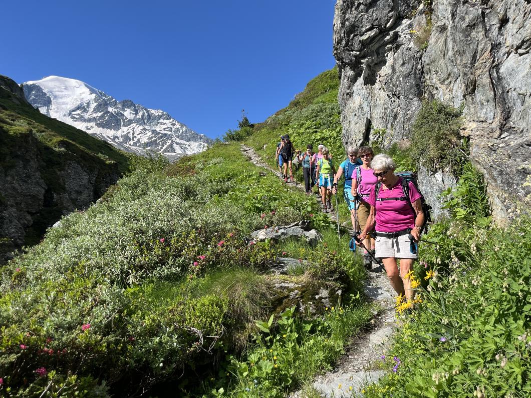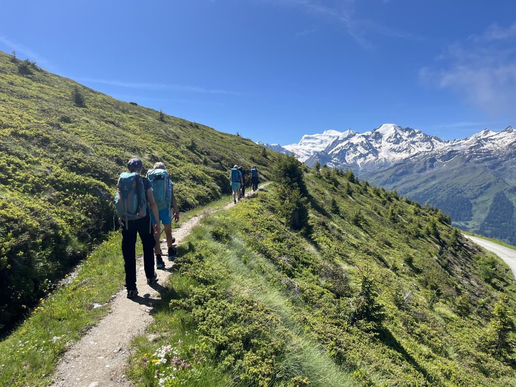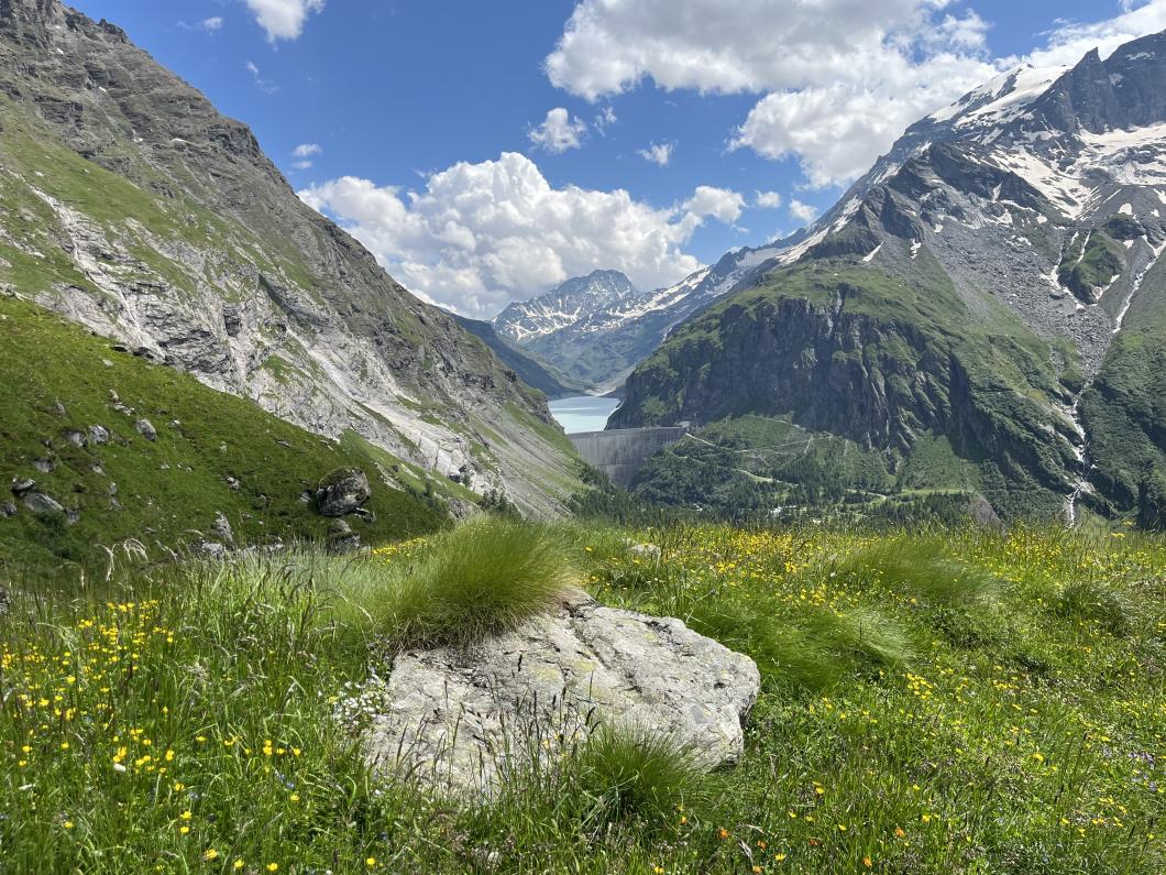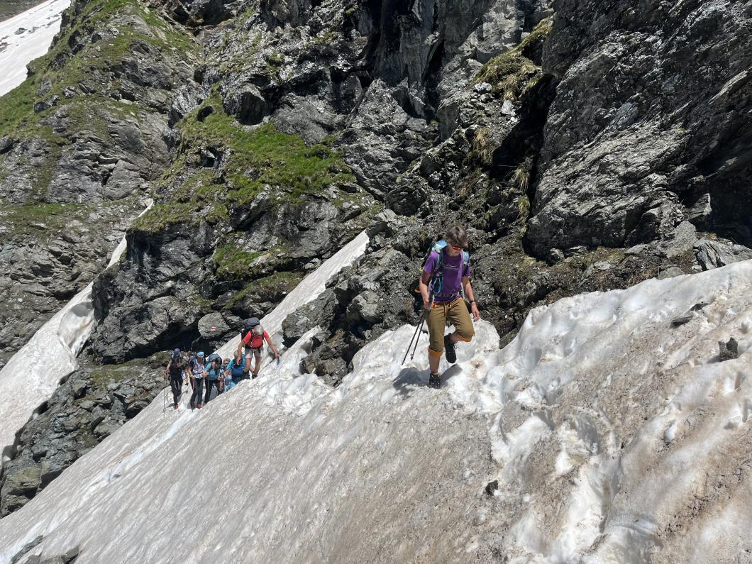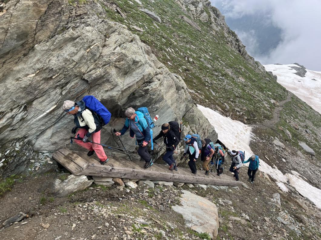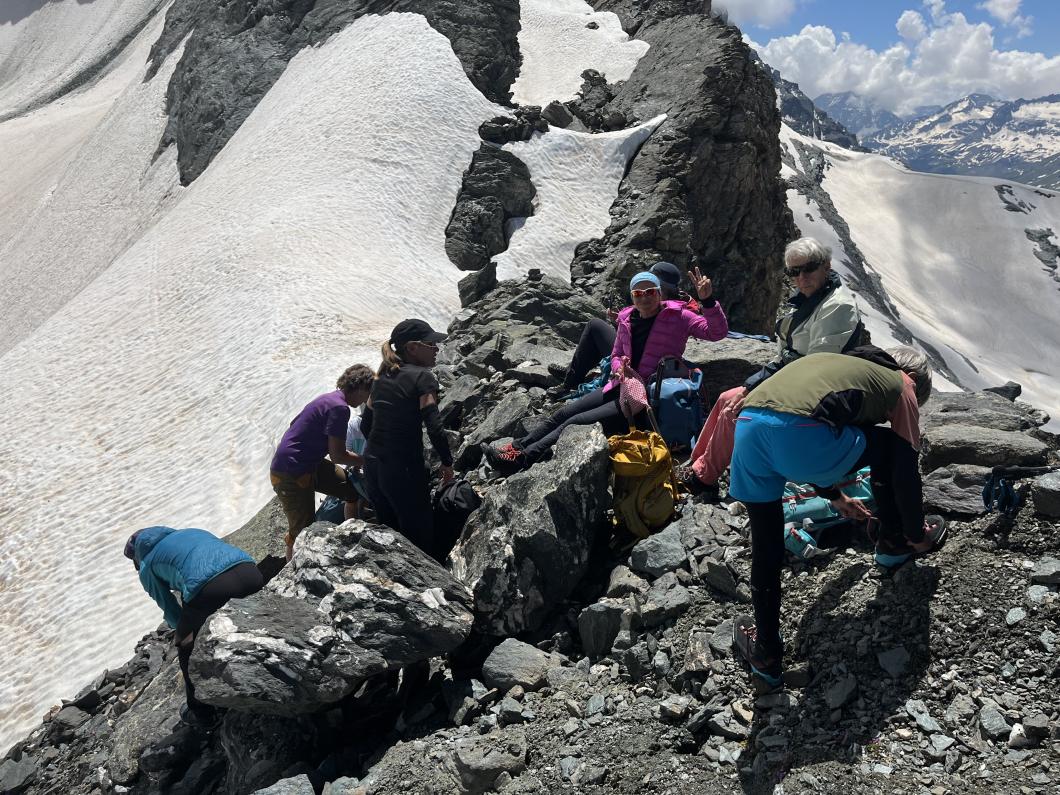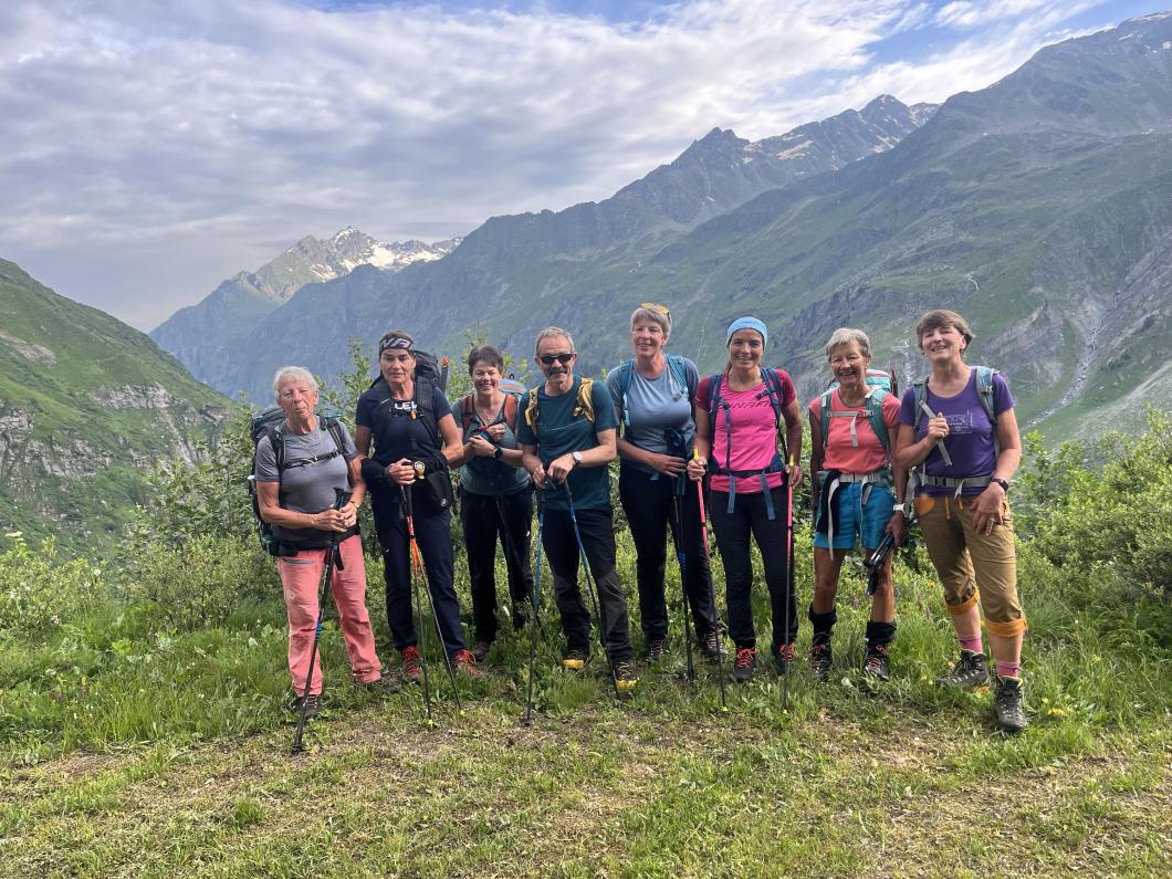 | Tourenbericht Gespannt verfolgten wir die Unwetterschäden und die Wetterprognose im Vorfeld. Mit der Nachricht, dass die Strasse nach Fionnay länger geschlossen bleibt, fingen wir an unsere Route umzuplanen, denn in einem Tag von Verbier die Cabane de Chanrion zu Fuss zu erreichen ist nicht möglich. Zudem waren die Wanderwege um den Lac de Mauvoisin zum Teil auch geschlossen. Wir entschieden uns im vorderen Teil vom Val de Bagne unsere Tour zu starten. Montag: von Verbier zur Cabane de Louvie Dienstag: Cabane de Louvie bis Mauvoisin mit einem Abstecher zum Col du Crêt. Ab Mittwoch konnten wir der geplanten Route nach wandern. Nach dem im Voraus regnerischen Wetter freuten wir uns am Montag bei Sonnenschein die Tour in Verbier zu starten. Zuerst gings stotzig über les Ruinette zur Cabane Mont Fort, wo wir unsere erste Kaffepause machten. Von hier aus sah man auch, dass wir den blau weissen Weg oben durch zum Col Termin nehmen konnten. Es hatte noch ein paar Schneefelder welche gut begehbar waren. In der Louvie Hütte erfrischten wir uns mit kalten Getränken. Voll motiviert nahmen wir am Dienstag unsere längste Etappe in Angriff. Bei der wunderbaren Aussicht und der Blumenpracht ging das Wandern leicht. Auf dem Abstecher zum Col du Crêt (3148m) kamen unsere Pickel zum ersten Mal zum Einsatz. Beim Abstieg nutzen wir die Schneefelder zum Rutschen und «schwups» waren wir wieder auf unserer Route. Nun wurde unsere Ausdauer auf die Probe gestellt, zuerst mit langem runter laufen und zum Dessert die letzten Höhenmeter wieder hinauf zum Hotel Mauvoisin. Umso mehr genossen wir die Dousche und später das mit Liebe schön zubereitete, ausgiebige Nachtessen. Am Mittwoch legten wir vorsorglich die Regenjacke zuoberst in den Rucksack da der Wetterbericht Regen ansagte. Am Morgen sah es noch nicht danach aus. Kurz vor dem Col des Otanes kam der Nebel und es nieselte leicht. Unsere Sorge den Grand Tavé (3158m) nicht besteigen zu können verflog als die Sonne den Nebel wieder verdrängte. Wir waren erfreut, dass wir sogar bei Sonnenschein und angenehmer Temperatur den Gipfelrast geniessen konnten. Beim Abstieg nutzten wir wieder die Schneefelder, dieses Mal jedoch nicht zum Rutschen, sondern ordentlich Tritt für Tritt mit Pickel in der Hand, da es doch recht steil war. Zeitig erreichten wir die Cabane Panossier. Bei Suppe, Kaffee und Kuchen bestaunten wir von der Terasse aus, das Massiv vom Grand Combin das in voller Pracht vor uns lag. Am Donnerstag führte unsere erste Etappe zur Cabane Brunet, eigentlich war von dort der Abstieg nach Champsec geplant und weiter mit dem Postauto nach le Châble wo unsere Autos parkiert waren. Der Hüttenwart empfahl uns den Höhenweg nach Moay zu nehmen und mit der Bahn hinab nach le Châble. Da wir zeitig dran waren und wir uns alle fit genug fühlten die 4 ½ Std in Angriff zu nehmen entschieden wir uns einstimmig für den Höhenweg. Auf diesem Weg bleiben uns sicher die vielen Alpenrosen und die Sicht auf die verschüttete Strasse unten im Tal in Erinnerung. Glücklich und dankbar, dass wir alle gesund und zwäg unser Ziel erreichten, mit vielen schönen Fotos auf dem Handy und «Blumen- und Stimmungsbildern im Herzen», machten wir uns auf den Heimweg. |