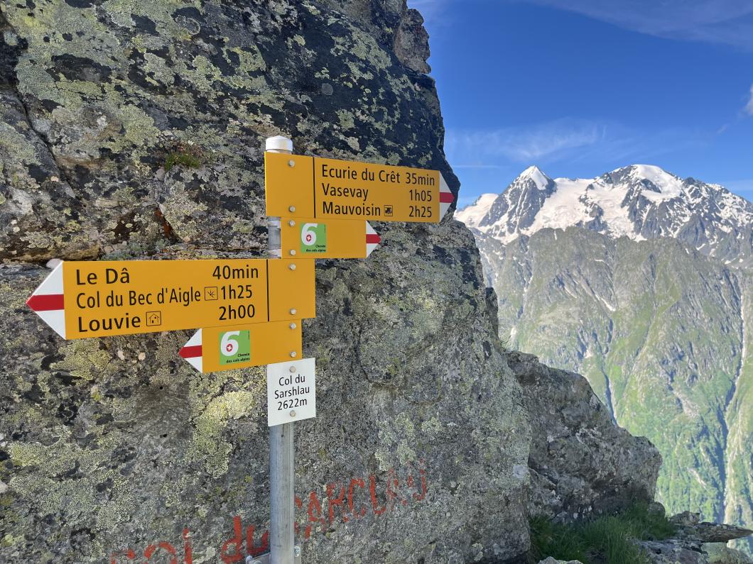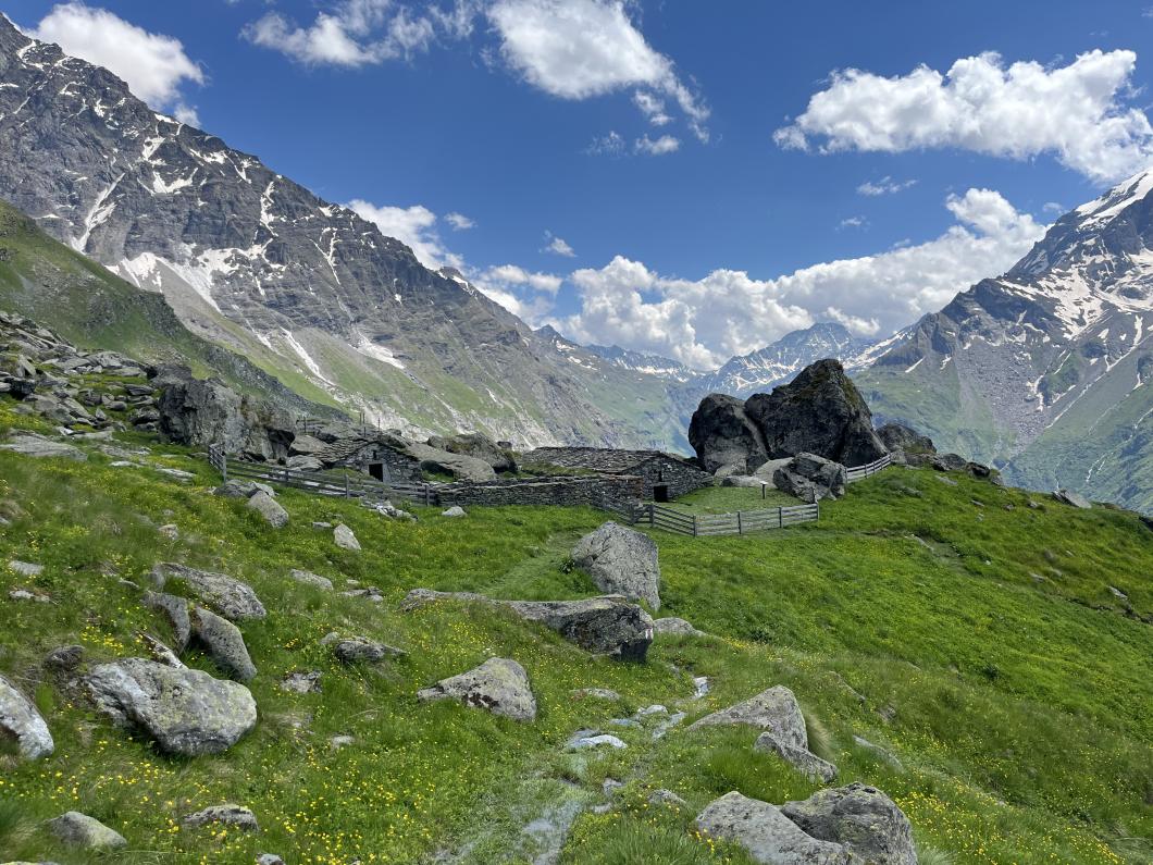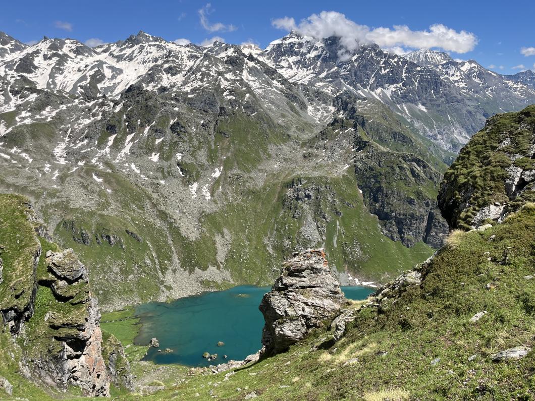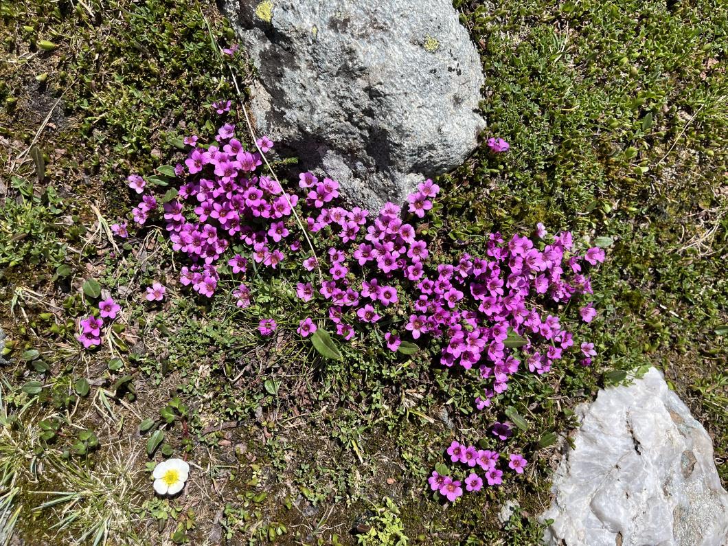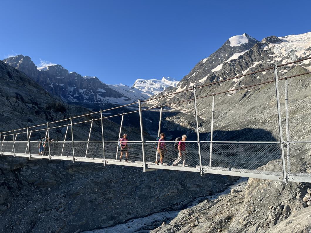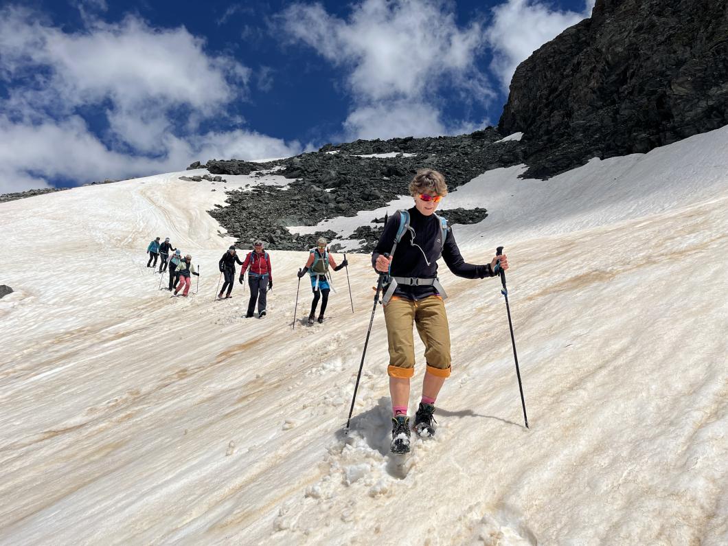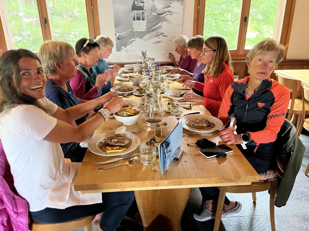 | Tourenbericht Gespannt verfolgten wir die Unwetterschäden und die Wetterprognose im Vorfeld. Mit der Nachricht, dass die Strasse nach Fionnay länger geschlossen bleibt, fingen wir an unsere Route umzuplanen, denn in einem Tag von Verbier die Cabane de Chanrion zu Fuss zu erreichen ist nicht möglich. Zudem waren die Wanderwege um den Lac de Mauvoisin zum Teil auch geschlossen. Wir entschieden uns im vorderen Teil vom Val de Bagne unsere Tour zu starten. Montag: von Verbier zur Cabane de Louvie Dienstag: Cabane de Louvie bis Mauvoisin mit einem Abstecher zum Col du Crêt. Ab Mittwoch konnten wir der geplanten Route nach wandern. Nach dem im Voraus regnerischen Wetter freuten wir uns am Montag bei Sonnenschein die Tour in Verbier zu starten. Zuerst gings stotzig über les Ruinette zur Cabane Mont Fort, wo wir unsere erste Kaffepause machten. Von hier aus sah man auch, dass wir den blau weissen Weg oben durch zum Col Termin nehmen konnten. Es hatte noch ein paar Schneefelder welche gut begehbar waren. In der Louvie Hütte erfrischten wir uns mit kalten Getränken. Voll motiviert nahmen wir am Dienstag unsere längste Etappe in Angriff. Bei der wunderbaren Aussicht und der Blumenpracht ging das Wandern leicht. Auf dem Abstecher zum Col du Crêt (3148m) kamen unsere Pickel zum ersten Mal zum Einsatz. Beim Abstieg nutzen wir die Schneefelder zum Rutschen und «schwups» waren wir wieder auf unserer Route. Nun wurde unsere Ausdauer auf die Probe gestellt, zuerst mit langem runter laufen und zum Dessert die letzten Höhenmeter wieder hinauf zum Hotel Mauvoisin. Umso mehr genossen wir die Dousche und später das mit Liebe schön zubereitete, ausgiebige Nachtessen. Am Mittwoch legten wir vorsorglich die Regenjacke zuoberst in den Rucksack da der Wetterbericht Regen ansagte. Am Morgen sah es noch nicht danach aus. Kurz vor dem Col des Otanes kam der Nebel und es nieselte leicht. Unsere Sorge den Grand Tavé (3158m) nicht besteigen zu können verflog als die Sonne den Nebel wieder verdrängte. Wir waren erfreut, dass wir sogar bei Sonnenschein und angenehmer Temperatur den Gipfelrast geniessen konnten. Beim Abstieg nutzten wir wieder die Schneefelder, dieses Mal jedoch nicht zum Rutschen, sondern ordentlich Tritt für Tritt mit Pickel in der Hand, da es doch recht steil war. Zeitig erreichten wir die Cabane Panossier. Bei Suppe, Kaffee und Kuchen bestaunten wir von der Terasse aus, das Massiv vom Grand Combin das in voller Pracht vor uns lag. Am Donnerstag führte unsere erste Etappe zur Cabane Brunet, eigentlich war von dort der Abstieg nach Champsec geplant und weiter mit dem Postauto nach le Châble wo unsere Autos parkiert waren. Der Hüttenwart empfahl uns den Höhenweg nach Moay zu nehmen und mit der Bahn hinab nach le Châble. Da wir zeitig dran waren und wir uns alle fit genug fühlten die 4 ½ Std in Angriff zu nehmen entschieden wir uns einstimmig für den Höhenweg. Auf diesem Weg bleiben uns sicher die vielen Alpenrosen und die Sicht auf die verschüttete Strasse unten im Tal in Erinnerung. Glücklich und dankbar, dass wir alle gesund und zwäg unser Ziel erreichten, mit vielen schönen Fotos auf dem Handy und «Blumen- und Stimmungsbildern im Herzen», machten wir uns auf den Heimweg. |