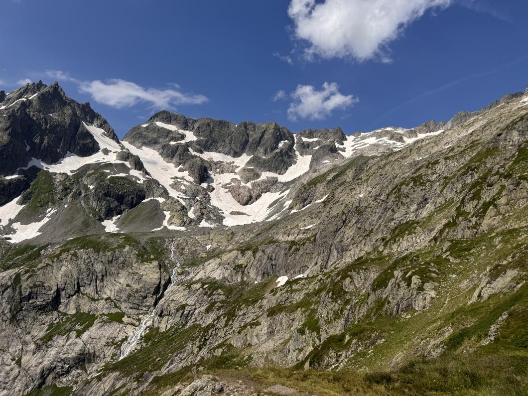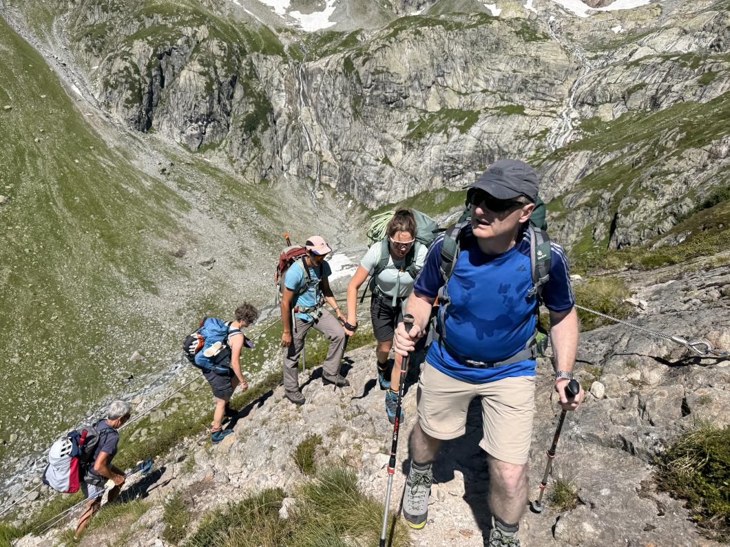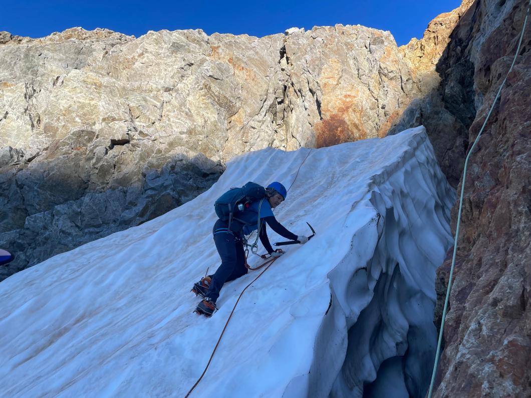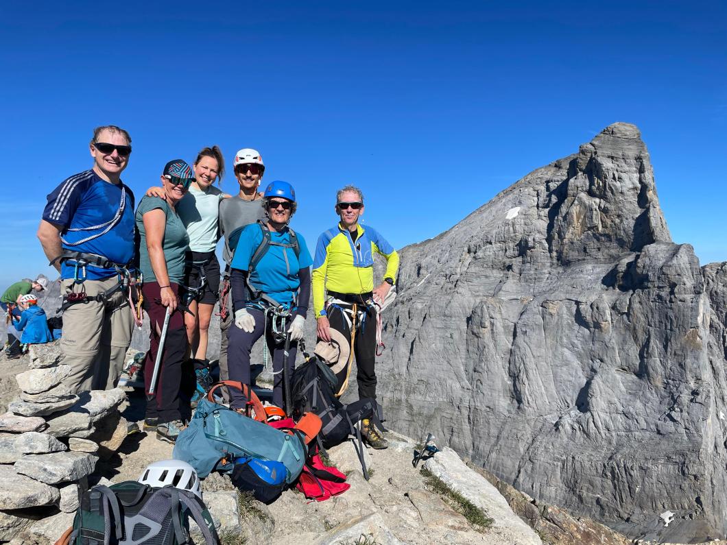 Am nächsten Morgen ging es früh los: Tagwache um 5 Uhr, kurzes Frühstück und dann Abmarsch über den Nordostgrat auf den Grassen. Nach einer Überquerung des Gletschers und einigen Kraxeleien erreichten wir gegen 9:30 den Gipfel und wurden mit einem wunderbaren Panorama belohnt. Der Abstieg erfolgte über den gleichen Weg, wobei es hier kurz vor dem Gletscher nochmals spannend wurde: Beim Abseilen verklemmte sich das eine Seilende in einer fiesen Spalte zwischen Fels und Firn ein. Es brauchte einige Manöver und Improvisation von Bänz um das Seil aus der Spalte zu befreien. Nun ging es jedoch ohne weitere Zwischenfälle wieder zurück zur Hütte wo wir ein kaltes Getränk und feines Stück Kuchen genossen. Als die Südwand Gruppe eintraf, machten wir uns gemeinsam auf den Weg zurück zu unseren Autos.