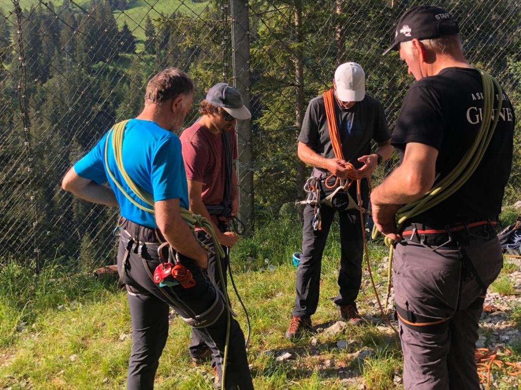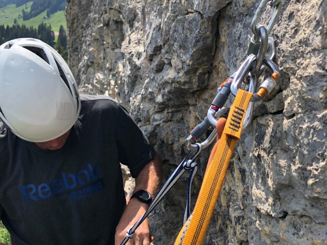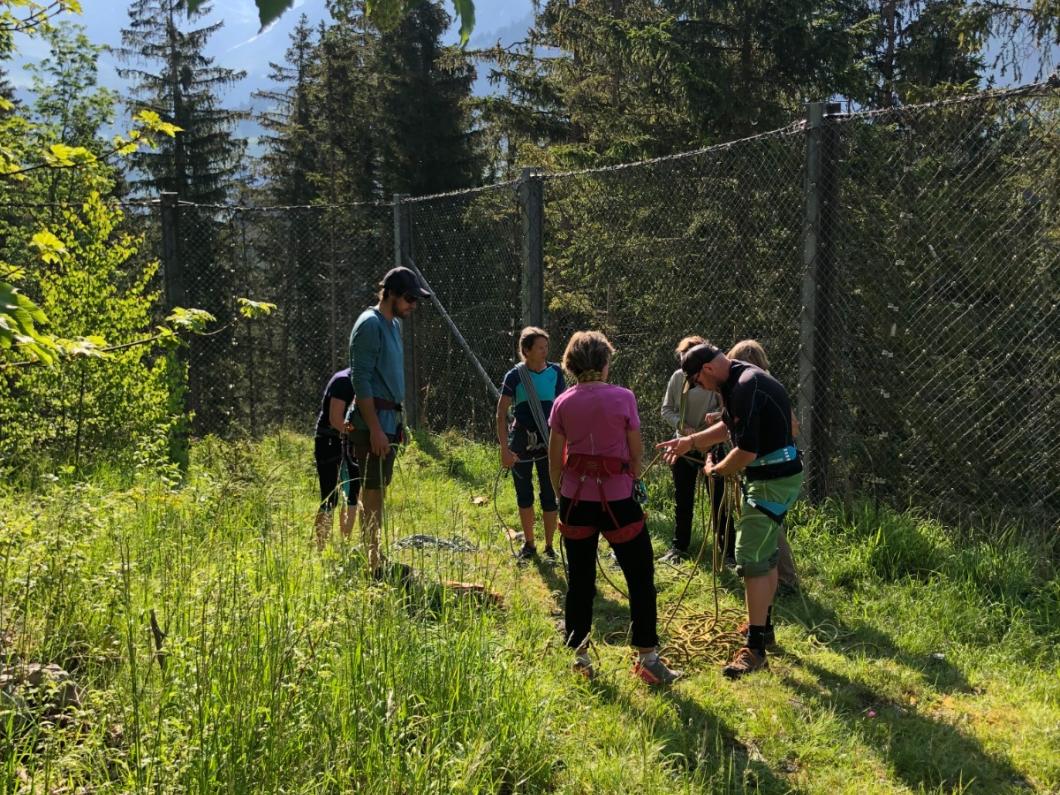 | Tourenbericht Exakt um 8 Uhr begrüsste Adi Büschlen mit Unterstützung von Matthias Bettschen uns 5 Frauen und 5 Männer (Zufall) an der Stiegelfluh. Bei wunderbarem Wetter erläuterte er sein Tagesziel, fragte aber auch die Teilnehmer was von diesem Kurs erwartet wird. Das Grundwissen wieder mal auffrischen, neues dazulernen und auch einige Kletterzüge tun, tönte es unisono. Zwei Gruppen wurden gebildet und sogleich ging es ans Tageswerk. Im zweier Team übten wir gehen am kurzen Seil, Reststeil aufnehmen, Spierenstich. Unser Hirn wurde bereits strapaziert. Doppelter Spierenstich und dann erzählt Adi auch noch was von einem Pistolengriff... nun, wir sind hartnäckig und üben bis es sitzt. Wie weit sind die Abstände, wenn ein Gletscher überquert wird? Kommt natürlich auf die Grösse der Seilschaft an. 36 (wird als Wert definiert) durch Anzahl Personen, so einfach ist das. Beim Üben dann doch nicht, ein Rechnungsfehler ist schnell gemacht. Und die Definition von einem Meter ist auch nicht für alle gleich… 😊 Wir kommen zum Materialcheck und bereits ist der Vormittag vorbei. Wir freuen uns auf das Pic Nic. Vor allem diejenige, die noch haben. Das Ehöri war doch ganz schön frech und gar nicht scheu. Nach dem Lunch fahren wir mit der Knotenlehre Halbmast, Mastwurf, Führerknoten etc. weiter. Dies wird sogleich am Felsen mit Standplatz-sicherung angewendet. Selber Abseilen und einige Seillängen klettern und schon ist der Nachmittag vorbei. Unser Kopf ist voll, Regen kommt auf. Besten Dank an Adrian und Matthias für den interessanten, spannenden und lehrreichen Tag. Bericht: Evelyne Allenbach |