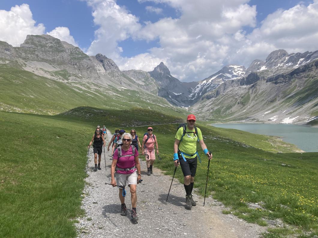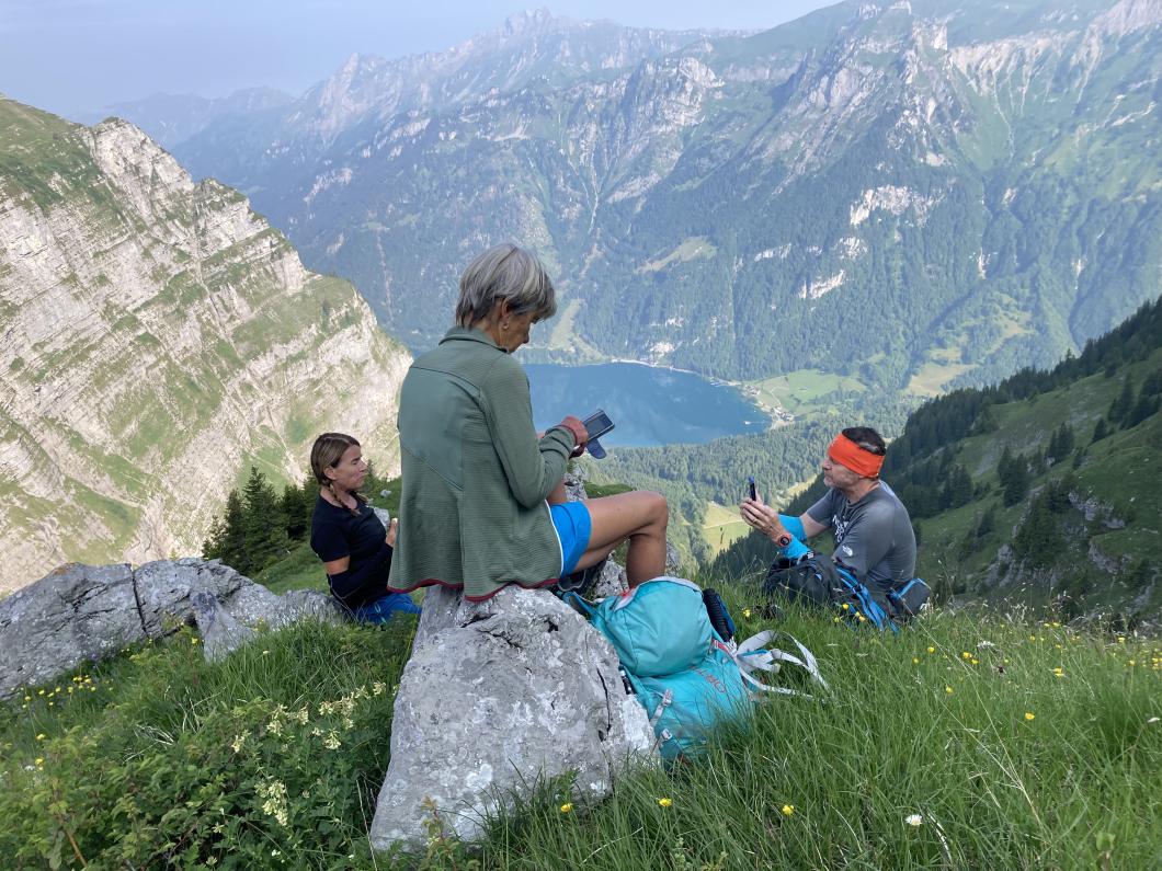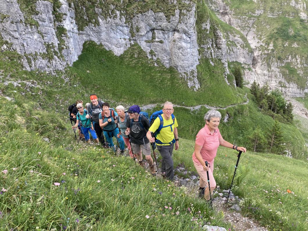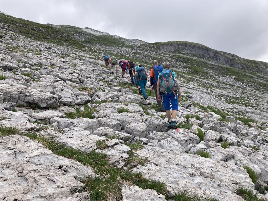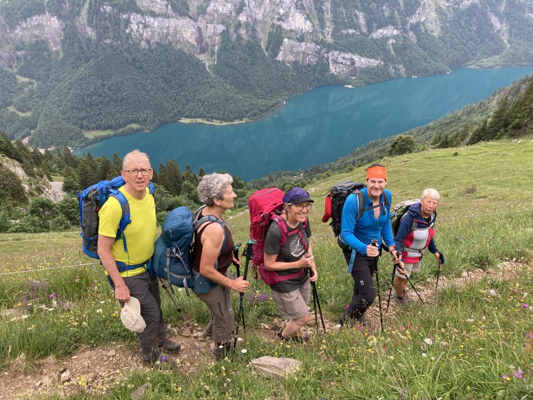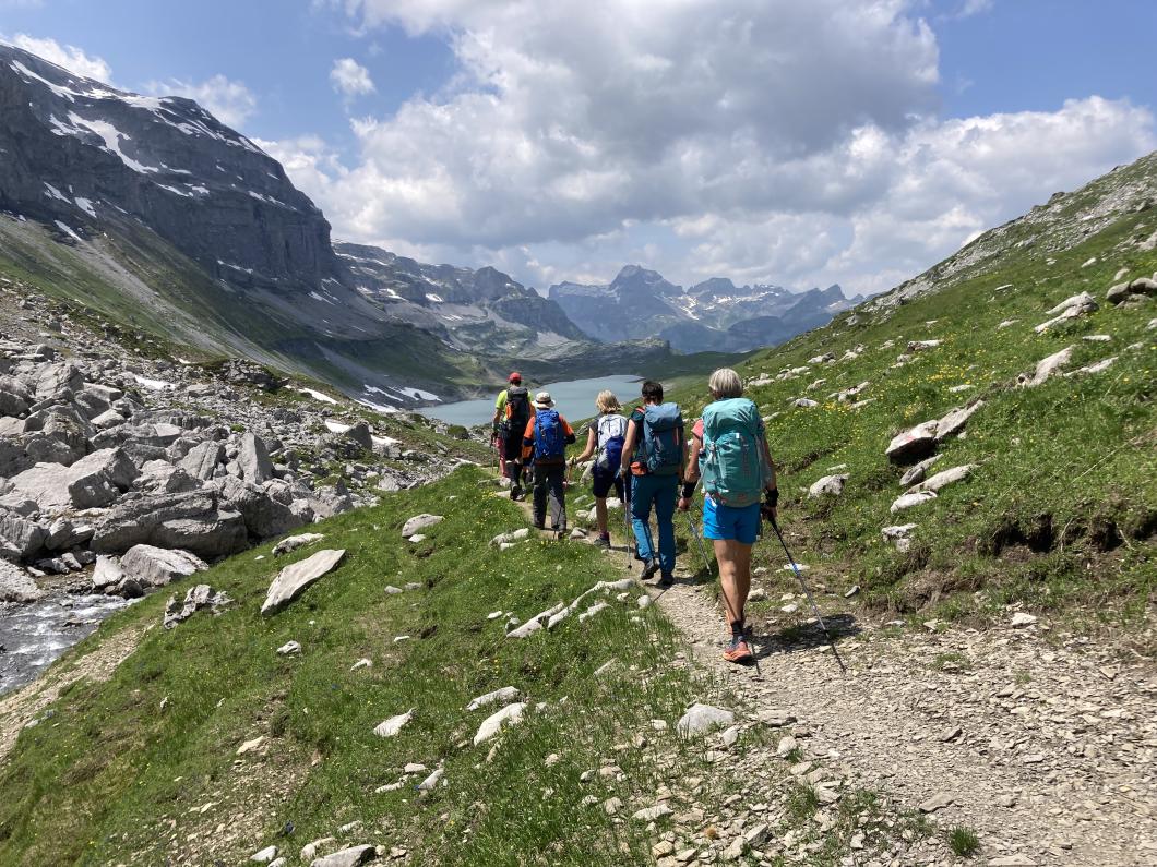 Pünktlich um 05:30 Uhr fuhren zwei Personenwagen beim Beck Aellig los. Bis zum Steg in Achseten wurden beide Autos mit je fünf Personen befüllt und so konnte dem ökologischen Fussabdruck leicht entgegen gewirkt werden. Eine Person fuhr mit dem öffentlichen Verkehr an und stiess erst am Ausgangspunkt zu uns. Über Brünig und Hirzel gelangen wir bei schönstem Wetter bald einmal in den Zigerschlitz und die beiden Fahrer verabreteten sich im Glarnerland. Für die eine Person war dies die Autoraststätte auf der A3 für die andere Person der Ausgangspunkt, eben im Glarnerland. So kam es, dass die beiden Gruppen ihren Kaffe an verschiedenen Stätten einnahmen. Es sollte das einzige und letzte Missverständnis dieser Wanderwoche sein. Um 09:00 Uhr schulterten die elf TeilnehmerInnen Sack und Pack und die Tourenleiter Rosina und Fritz Inniger gaben einige Informationen zur Wanderwoche rund um den Glärnisch als solches und spezielle Angaben zur bevorstehenden Tour des "Sonntags" bekannt. Wir verliessen Schwändi und die Wanderwege führten uns bei warmen Temperaturen durch Wiesen und Wälder bald hinauf zum Oberblegisee. Dort angekommen, sprangen acht von elf TeilnehmerInnen in den mässig kalten See. Die Erfrischung war sehr willkommen und das erste Sandwich schmeckte köstlich. Die Gruppe wanderte weiter und es ergaben sich kurzum interessante Gespräche unter allen Teilnehmenden. Ziel heute war das Berggasthaus Oberstockhaus auf 1772 Meter über Meer oberhalb Braunwald. Ursprünglich war geplant, in Braunwald zu übernachten. Chrigel Oester`s Ueli, welcher in Glarus Geschäftsführer des Fachgeschäftes Tödisport ist, gab dem Organisationskommittee den guten Tipp, besser im Oberstockhaus zu übernachten. Dieser Wink sollte sich als Glücksfall erweisen, fanden wir doch nach den Wanderstunden ausserordentlich freundliche Gastgeber an äusserst aussichtsreicher Lage vor. Auf der Terrasse wurde das köstliche Abendessen eingenommen und der Sonnenuntergang war wunderschön. Bald schon hörten wir dem Innenleben eines Kopfkissens zu und entglitten in die sternenklare Nacht. Dass wir früher Morgenessen einnehmen konnten, war ein weiterer Service des Hüttenteams. Im Frühtau zu Berge verliessen wir das Gasthaus und unser Ziel heute war die Glattalphütte. Es wurde der Bärentritt überwunden und einer der Engstligenalp ähnelnden Mini-Hochebene folgend, sahen wir dem Uebergang "Furggele" entgegen. Dass dieser durch Schneefelder verlief, erfreute Freis Inniger, denn so konnte er seinen mitgeführten Führerpickel sinnvoll einsetzen. Er schlug Hick um Hick in den harten Schnee und die nachfolgende männliche Person mit Schuhgrösse 46 ebnete die Tritte aus, um allen einen angenehmen Aufstieg zu ermöglichen. Auf dem Pass angekommen, trennten sich zwei Gruppen auf und die einen nahmen bereits den Abstieg zum Glattalpsee unter die Füsse, während die anderen im Eilzugtempo noch auf den Ortstock (2716 MüM) hikten. Der glückliche Fund des beim Aufstieg in den Schneefeldern verlorenen Handys verleitete der Schreiberin des zweiten Teils Flügel und sie schwebte buchstäblich auf den Ortstock hoch. Das Sandwich zurück auf dem Furggele schmeckte herrlich und Fritz erkundete für den "Abstieg" ein laaaaanges Schneefeld, welches wenig später mit viel Freude und Abwechslung abgerutscht wurde. Die beiden Gruppen trafen sich am Ufer des Bergsees. Es muss festgelhalten werden, dass mit abnehmender Wassertemperatur von 4° Grad die Quote der Badenden um über 60% zurückging. Zusammen wanderten wir der Glattalphütte entgegen, welche prominent auf einer Anhöhe gebaut und im 2019 umgebaut wurde. Das Hüttenteam verköstigte uns mit mit einem feinen Viergänger (Suppe, Salat, Lasagne, Dessert) und schon bald verkrochen wir uns in die Betten auf verschiedensten Etagen. Tag drei begann bei nebelverhangenem aber trockenem Wetter. Es kam einen fast ein wenig mystisch vor, durch die weitläufige Karstlandschaft nach der Charetalp zu laufen. Die Brunalpelihöchi war der höchste Punkt der heutigen Ettappe und nach einer Stärkung aus dem Znünisäckli der Glattalphütte ging es abwärts und später talauswärts. Vom Dräggloch aus war die Zeltstätte rund um die Glärnischhütte auszumachen. Während des diesjährigen Umbaus der SAC-Hütte wird der Betrieb dezentral in Aufmachung eines Base-Camps sichergestellt. Von der Alp Chäseren aus nahmen wir den knapp zweistündigen Weg nach Richisau noch unter die Füsse. Versteckt zwischen Bäumen an der Pragelpass-Strasse konnten wir unser Logis für diese Nacht ausmachen. Auch hier wiederum wurden wir herrlich bewirtet und im geschichtsträchtigen Gebäude konnte die eine oder andere Kunst bewundert werden.