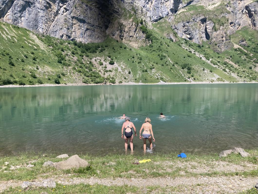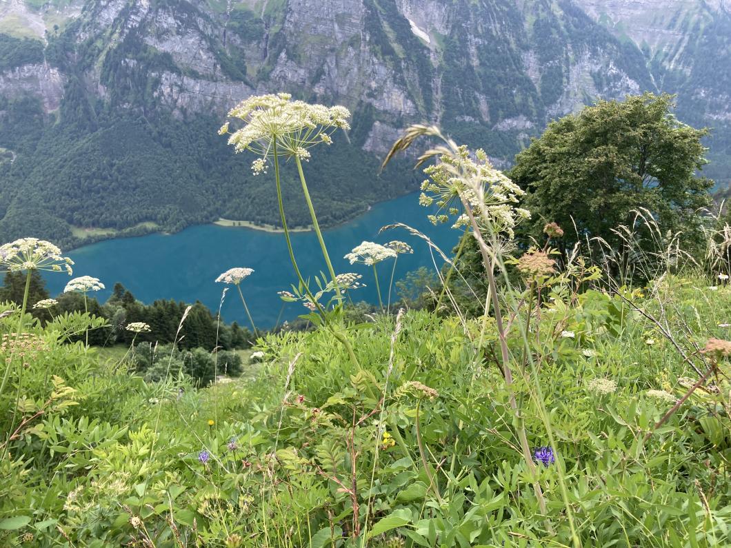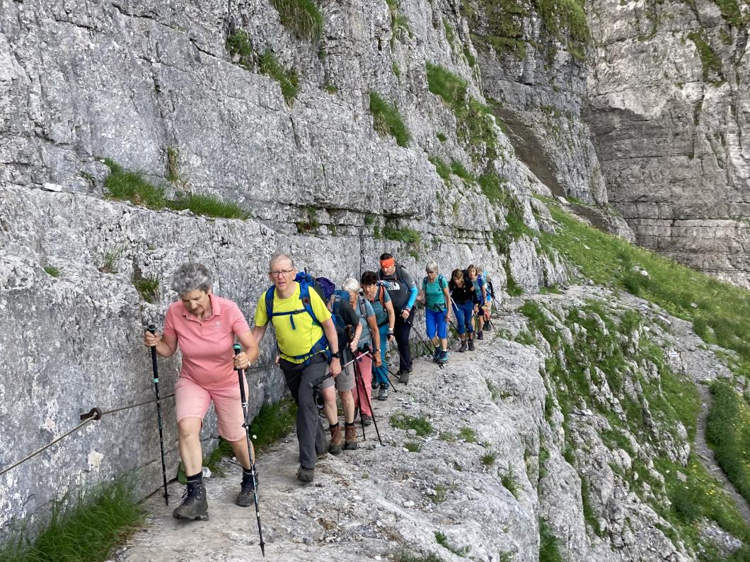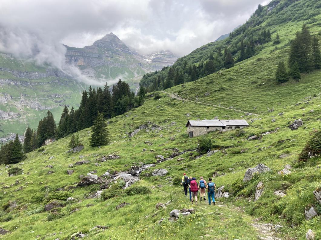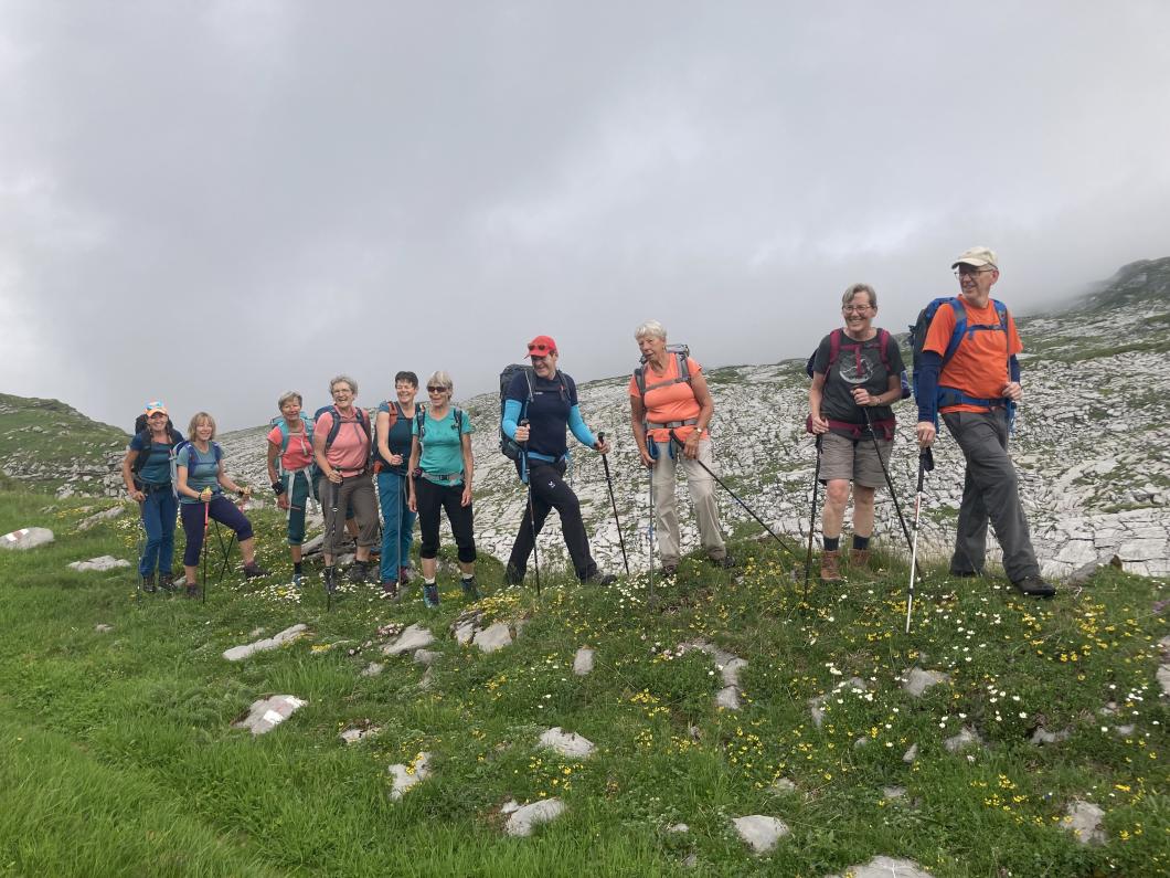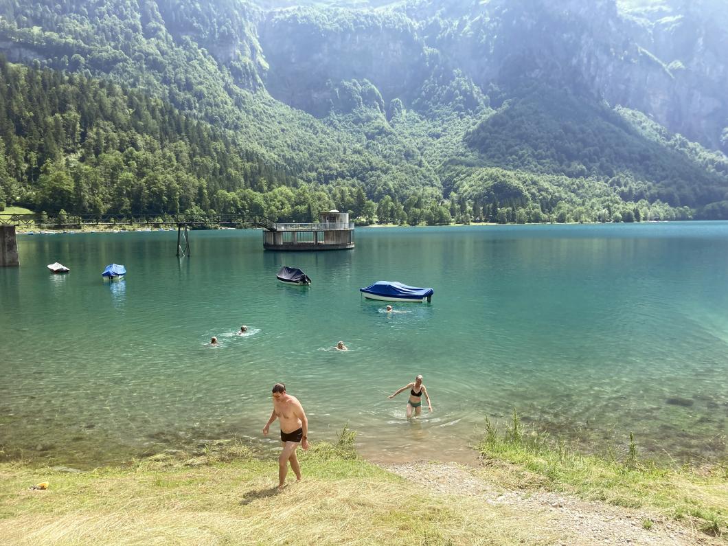 Pünktlich um 05:30 Uhr fuhren zwei Personenwagen beim Beck Aellig los. Bis zum Steg in Achseten wurden beide Autos mit je fünf Personen befüllt und so konnte dem ökologischen Fussabdruck leicht entgegen gewirkt werden. Eine Person fuhr mit dem öffentlichen Verkehr an und stiess erst am Ausgangspunkt zu uns. Über Brünig und Hirzel gelangen wir bei schönstem Wetter bald einmal in den Zigerschlitz und die beiden Fahrer verabreteten sich im Glarnerland. Für die eine Person war dies die Autoraststätte auf der A3 für die andere Person der Ausgangspunkt, eben im Glarnerland. So kam es, dass die beiden Gruppen ihren Kaffe an verschiedenen Stätten einnahmen. Es sollte das einzige und letzte Missverständnis dieser Wanderwoche sein. Um 09:00 Uhr schulterten die elf TeilnehmerInnen Sack und Pack und die Tourenleiter Rosina und Fritz Inniger gaben einige Informationen zur Wanderwoche rund um den Glärnisch als solches und spezielle Angaben zur bevorstehenden Tour des "Sonntags" bekannt. Wir verliessen Schwändi und die Wanderwege führten uns bei warmen Temperaturen durch Wiesen und Wälder bald hinauf zum Oberblegisee. Dort angekommen, sprangen acht von elf TeilnehmerInnen in den mässig kalten See. Die Erfrischung war sehr willkommen und das erste Sandwich schmeckte köstlich. Die Gruppe wanderte weiter und es ergaben sich kurzum interessante Gespräche unter allen Teilnehmenden. Ziel heute war das Berggasthaus Oberstockhaus auf 1772 Meter über Meer oberhalb Braunwald. Ursprünglich war geplant, in Braunwald zu übernachten. Chrigel Oester`s Ueli, welcher in Glarus Geschäftsführer des Fachgeschäftes Tödisport ist, gab dem Organisationskommittee den guten Tipp, besser im Oberstockhaus zu übernachten. Dieser Wink sollte sich als Glücksfall erweisen, fanden wir doch nach den Wanderstunden ausserordentlich freundliche Gastgeber an äusserst aussichtsreicher Lage vor. Auf der Terrasse wurde das köstliche Abendessen eingenommen und der Sonnenuntergang war wunderschön. Bald schon hörten wir dem Innenleben eines Kopfkissens zu und entglitten in die sternenklare Nacht. Dass wir früher Morgenessen einnehmen konnten, war ein weiterer Service des Hüttenteams. Im Frühtau zu Berge verliessen wir das Gasthaus und unser Ziel heute war die Glattalphütte. Es wurde der Bärentritt überwunden und einer der Engstligenalp ähnelnden Mini-Hochebene folgend, sahen wir dem Uebergang "Furggele" entgegen. Dass dieser durch Schneefelder verlief, erfreute Freis Inniger, denn so konnte er seinen mitgeführten Führerpickel sinnvoll einsetzen. Er schlug Hick um Hick in den harten Schnee und die nachfolgende männliche Person mit Schuhgrösse 46 ebnete die Tritte aus, um allen einen angenehmen Aufstieg zu ermöglichen. Auf dem Pass angekommen, trennten sich zwei Gruppen auf und die einen nahmen bereits den Abstieg zum Glattalpsee unter die Füsse, während die anderen im Eilzugtempo noch auf den Ortstock (2716 MüM) hikten. Der glückliche Fund des beim Aufstieg in den Schneefeldern verlorenen Handys verleitete der Schreiberin des zweiten Teils Flügel und sie schwebte buchstäblich auf den Ortstock hoch. Das Sandwich zurück auf dem Furggele schmeckte herrlich und Fritz erkundete für den "Abstieg" ein laaaaanges Schneefeld, welches wenig später mit viel Freude und Abwechslung abgerutscht wurde. Die beiden Gruppen trafen sich am Ufer des Bergsees. Es muss festgelhalten werden, dass mit abnehmender Wassertemperatur von 4° Grad die Quote der Badenden um über 60% zurückging. Zusammen wanderten wir der Glattalphütte entgegen, welche prominent auf einer Anhöhe gebaut und im 2019 umgebaut wurde. Das Hüttenteam verköstigte uns mit mit einem feinen Viergänger (Suppe, Salat, Lasagne, Dessert) und schon bald verkrochen wir uns in die Betten auf verschiedensten Etagen. Tag drei begann bei nebelverhangenem aber trockenem Wetter. Es kam einen fast ein wenig mystisch vor, durch die weitläufige Karstlandschaft nach der Charetalp zu laufen. Die Brunalpelihöchi war der höchste Punkt der heutigen Ettappe und nach einer Stärkung aus dem Znünisäckli der Glattalphütte ging es abwärts und später talauswärts. Vom Dräggloch aus war die Zeltstätte rund um die Glärnischhütte auszumachen. Während des diesjährigen Umbaus der SAC-Hütte wird der Betrieb dezentral in Aufmachung eines Base-Camps sichergestellt. Von der Alp Chäseren aus nahmen wir den knapp zweistündigen Weg nach Richisau noch unter die Füsse. Versteckt zwischen Bäumen an der Pragelpass-Strasse konnten wir unser Logis für diese Nacht ausmachen. Auch hier wiederum wurden wir herrlich bewirtet und im geschichtsträchtigen Gebäude konnte die eine oder andere Kunst bewundert werden.