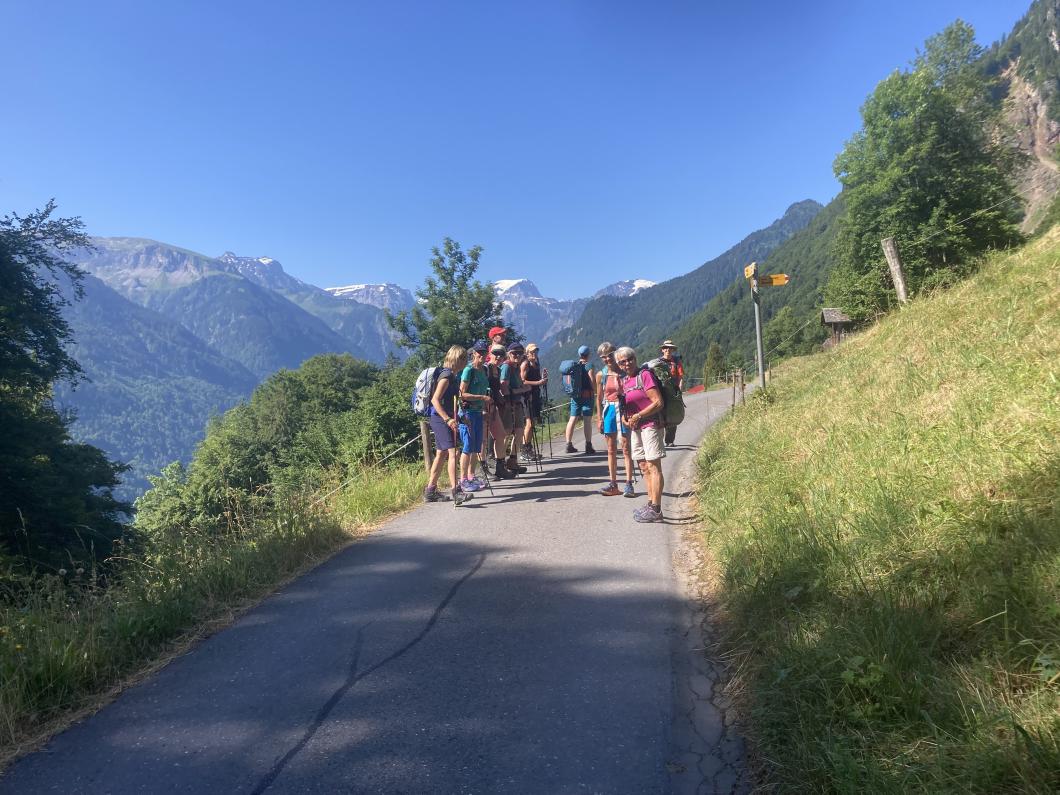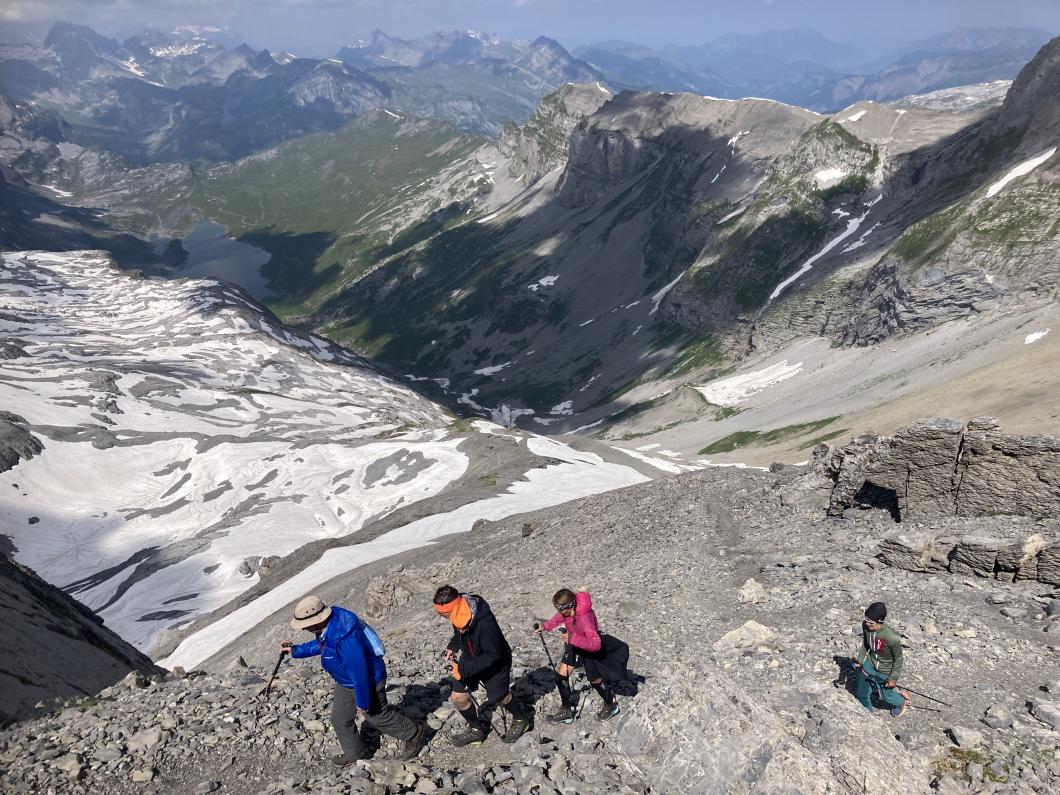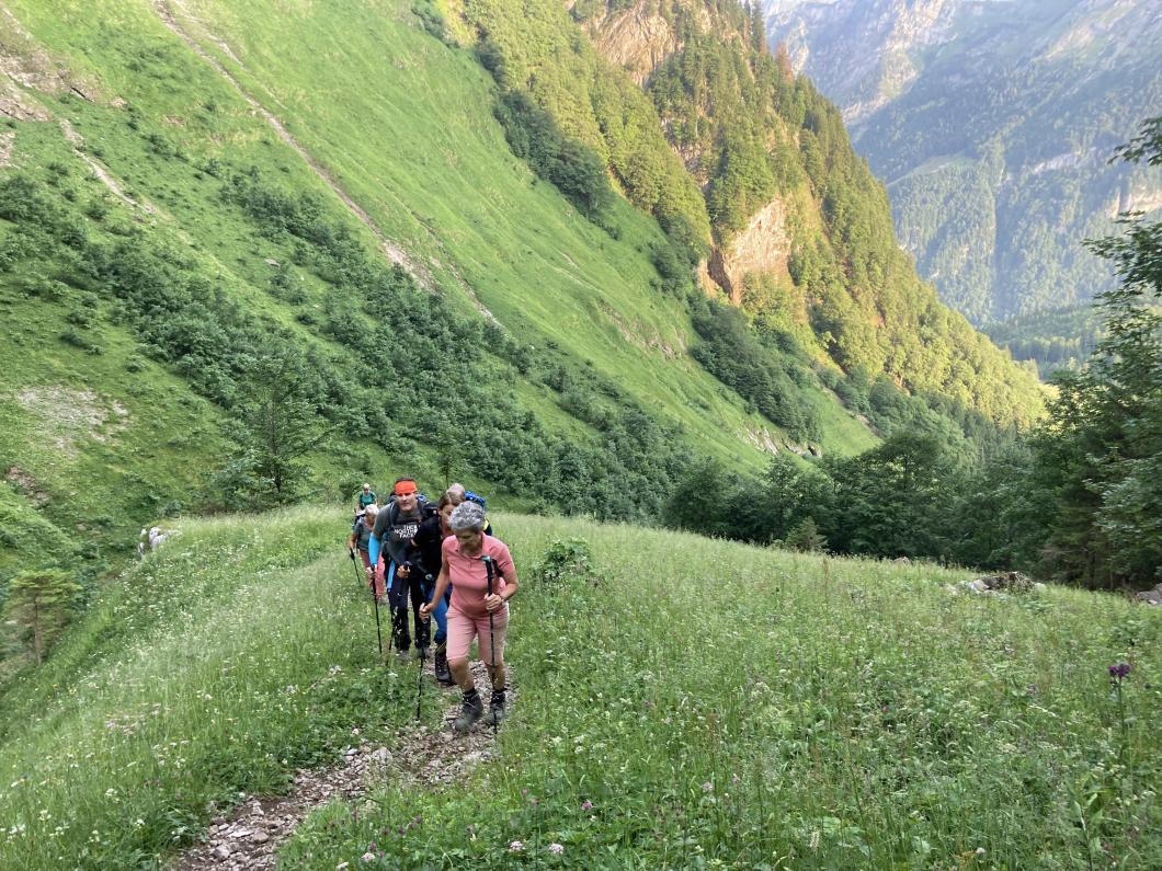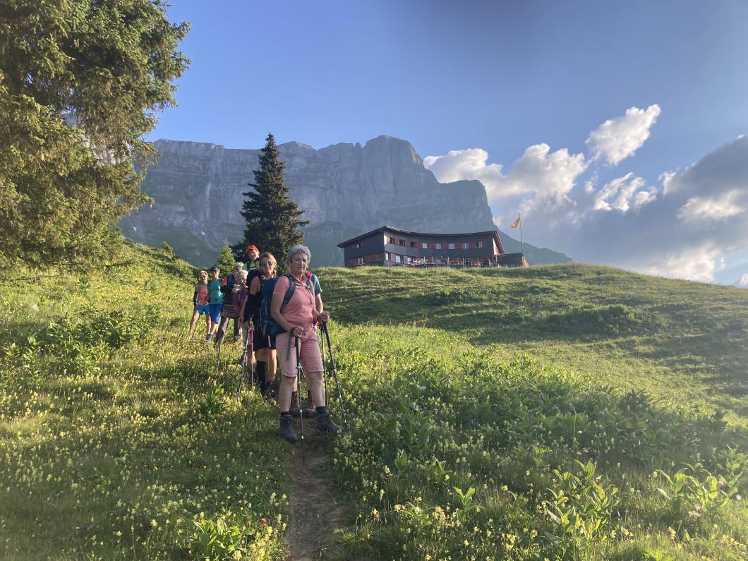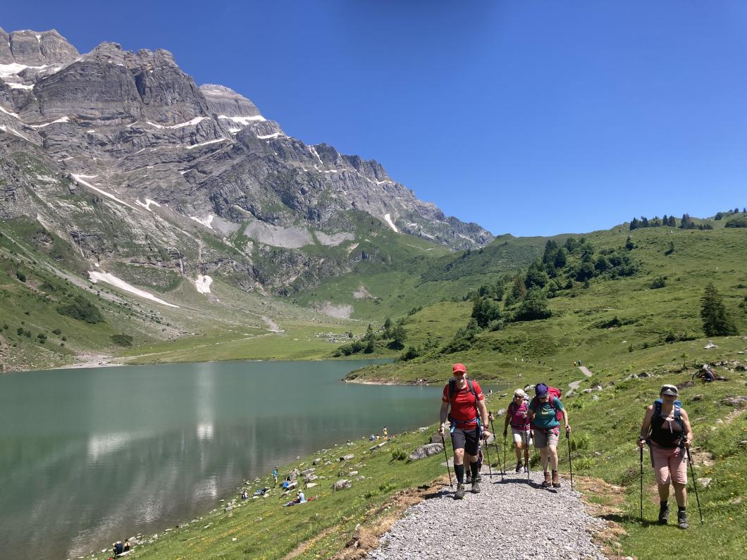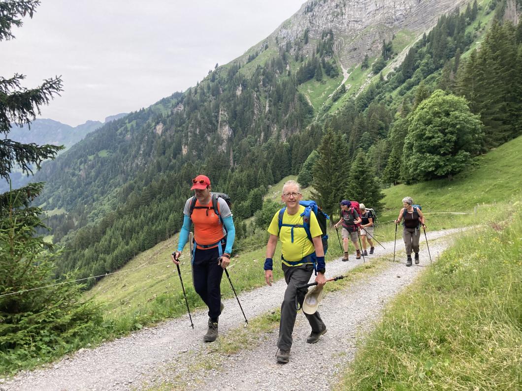 Pünktlich um 05:30 Uhr fuhren zwei Personenwagen beim Beck Aellig los. Bis zum Steg in Achseten wurden beide Autos mit je fünf Personen befüllt und so konnte dem ökologischen Fussabdruck leicht entgegen gewirkt werden. Eine Person fuhr mit dem öffentlichen Verkehr an und stiess erst am Ausgangspunkt zu uns. Über Brünig und Hirzel gelangen wir bei schönstem Wetter bald einmal in den Zigerschlitz und die beiden Fahrer verabreteten sich im Glarnerland. Für die eine Person war dies die Autoraststätte auf der A3 für die andere Person der Ausgangspunkt, eben im Glarnerland. So kam es, dass die beiden Gruppen ihren Kaffe an verschiedenen Stätten einnahmen. Es sollte das einzige und letzte Missverständnis dieser Wanderwoche sein. Um 09:00 Uhr schulterten die elf TeilnehmerInnen Sack und Pack und die Tourenleiter Rosina und Fritz Inniger gaben einige Informationen zur Wanderwoche rund um den Glärnisch als solches und spezielle Angaben zur bevorstehenden Tour des "Sonntags" bekannt. Wir verliessen Schwändi und die Wanderwege führten uns bei warmen Temperaturen durch Wiesen und Wälder bald hinauf zum Oberblegisee. Dort angekommen, sprangen acht von elf TeilnehmerInnen in den mässig kalten See. Die Erfrischung war sehr willkommen und das erste Sandwich schmeckte köstlich. Die Gruppe wanderte weiter und es ergaben sich kurzum interessante Gespräche unter allen Teilnehmenden. Ziel heute war das Berggasthaus Oberstockhaus auf 1772 Meter über Meer oberhalb Braunwald. Ursprünglich war geplant, in Braunwald zu übernachten. Chrigel Oester`s Ueli, welcher in Glarus Geschäftsführer des Fachgeschäftes Tödisport ist, gab dem Organisationskommittee den guten Tipp, besser im Oberstockhaus zu übernachten. Dieser Wink sollte sich als Glücksfall erweisen, fanden wir doch nach den Wanderstunden ausserordentlich freundliche Gastgeber an äusserst aussichtsreicher Lage vor. Auf der Terrasse wurde das köstliche Abendessen eingenommen und der Sonnenuntergang war wunderschön. Bald schon hörten wir dem Innenleben eines Kopfkissens zu und entglitten in die sternenklare Nacht. Dass wir früher Morgenessen einnehmen konnten, war ein weiterer Service des Hüttenteams. Im Frühtau zu Berge verliessen wir das Gasthaus und unser Ziel heute war die Glattalphütte. Es wurde der Bärentritt überwunden und einer der Engstligenalp ähnelnden Mini-Hochebene folgend, sahen wir dem Uebergang "Furggele" entgegen. Dass dieser durch Schneefelder verlief, erfreute Freis Inniger, denn so konnte er seinen mitgeführten Führerpickel sinnvoll einsetzen. Er schlug Hick um Hick in den harten Schnee und die nachfolgende männliche Person mit Schuhgrösse 46 ebnete die Tritte aus, um allen einen angenehmen Aufstieg zu ermöglichen. Auf dem Pass angekommen, trennten sich zwei Gruppen auf und die einen nahmen bereits den Abstieg zum Glattalpsee unter die Füsse, während die anderen im Eilzugtempo noch auf den Ortstock (2716 MüM) hikten. Der glückliche Fund des beim Aufstieg in den Schneefeldern verlorenen Handys verleitete der Schreiberin des zweiten Teils Flügel und sie schwebte buchstäblich auf den Ortstock hoch. Das Sandwich zurück auf dem Furggele schmeckte herrlich und Fritz erkundete für den "Abstieg" ein laaaaanges Schneefeld, welches wenig später mit viel Freude und Abwechslung abgerutscht wurde. Die beiden Gruppen trafen sich am Ufer des Bergsees. Es muss festgelhalten werden, dass mit abnehmender Wassertemperatur von 4° Grad die Quote der Badenden um über 60% zurückging. Zusammen wanderten wir der Glattalphütte entgegen, welche prominent auf einer Anhöhe gebaut und im 2019 umgebaut wurde. Das Hüttenteam verköstigte uns mit mit einem feinen Viergänger (Suppe, Salat, Lasagne, Dessert) und schon bald verkrochen wir uns in die Betten auf verschiedensten Etagen. Tag drei begann bei nebelverhangenem aber trockenem Wetter. Es kam einen fast ein wenig mystisch vor, durch die weitläufige Karstlandschaft nach der Charetalp zu laufen. Die Brunalpelihöchi war der höchste Punkt der heutigen Ettappe und nach einer Stärkung aus dem Znünisäckli der Glattalphütte ging es abwärts und später talauswärts. Vom Dräggloch aus war die Zeltstätte rund um die Glärnischhütte auszumachen. Während des diesjährigen Umbaus der SAC-Hütte wird der Betrieb dezentral in Aufmachung eines Base-Camps sichergestellt. Von der Alp Chäseren aus nahmen wir den knapp zweistündigen Weg nach Richisau noch unter die Füsse. Versteckt zwischen Bäumen an der Pragelpass-Strasse konnten wir unser Logis für diese Nacht ausmachen. Auch hier wiederum wurden wir herrlich bewirtet und im geschichtsträchtigen Gebäude konnte die eine oder andere Kunst bewundert werden.