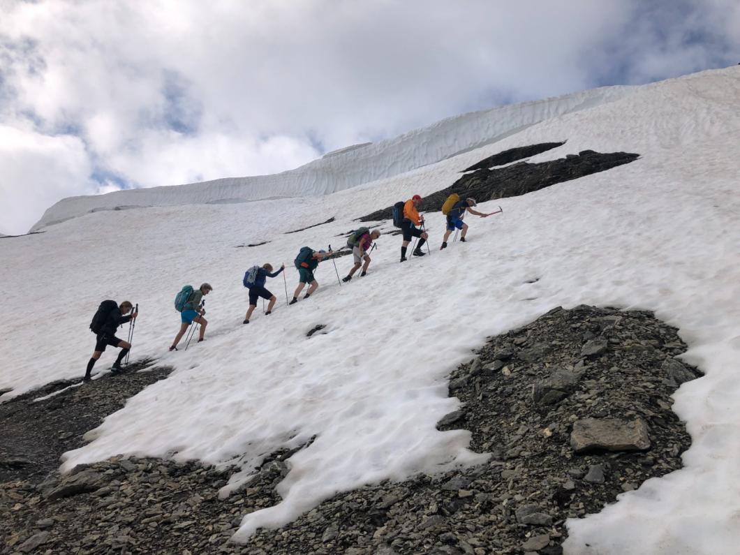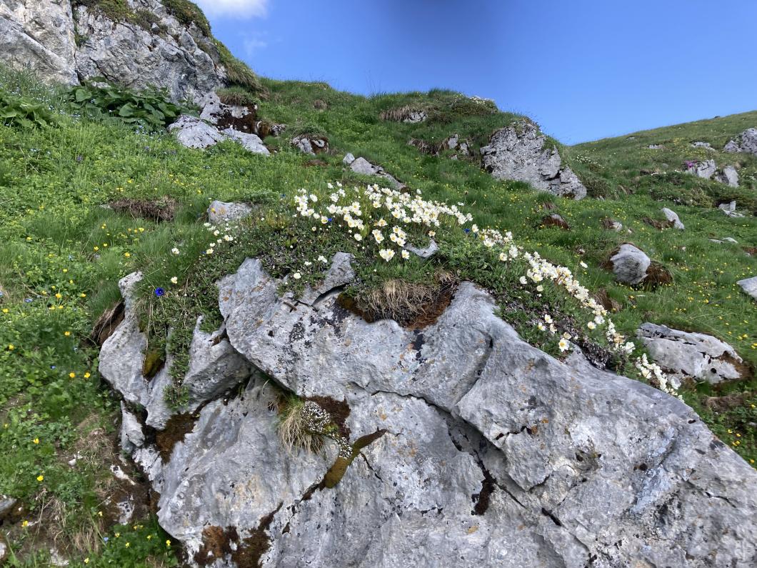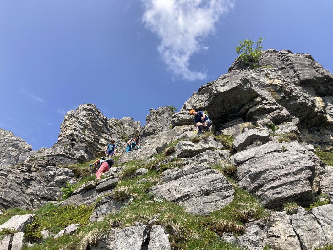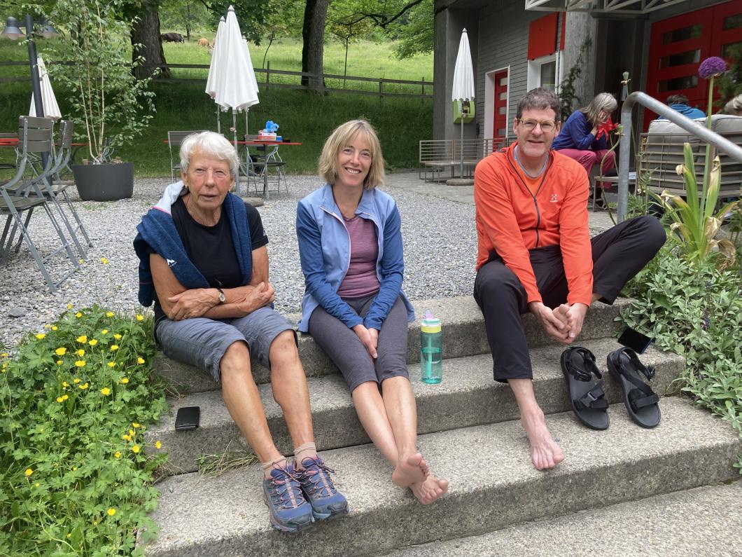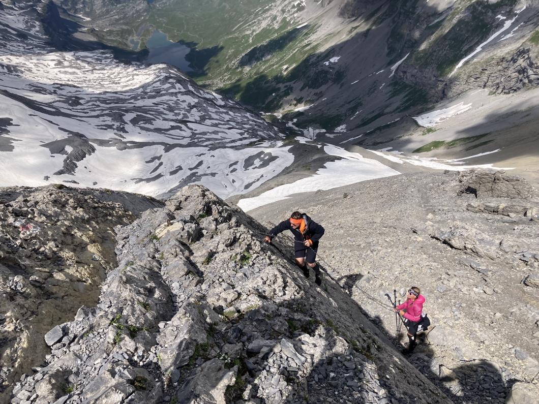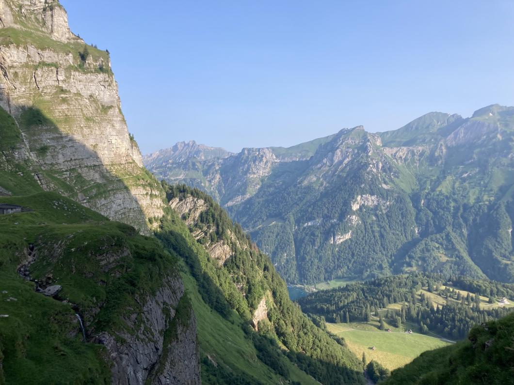 Pünktlich um 05:30 Uhr fuhren zwei Personenwagen beim Beck Aellig los. Bis zum Steg in Achseten wurden beide Autos mit je fünf Personen befüllt und so konnte dem ökologischen Fussabdruck leicht entgegen gewirkt werden. Eine Person fuhr mit dem öffentlichen Verkehr an und stiess erst am Ausgangspunkt zu uns. Über Brünig und Hirzel gelangen wir bei schönstem Wetter bald einmal in den Zigerschlitz und die beiden Fahrer verabreteten sich im Glarnerland. Für die eine Person war dies die Autoraststätte auf der A3 für die andere Person der Ausgangspunkt, eben im Glarnerland. So kam es, dass die beiden Gruppen ihren Kaffe an verschiedenen Stätten einnahmen. Es sollte das einzige und letzte Missverständnis dieser Wanderwoche sein. Um 09:00 Uhr schulterten die elf TeilnehmerInnen Sack und Pack und die Tourenleiter Rosina und Fritz Inniger gaben einige Informationen zur Wanderwoche rund um den Glärnisch als solches und spezielle Angaben zur bevorstehenden Tour des "Sonntags" bekannt. Wir verliessen Schwändi und die Wanderwege führten uns bei warmen Temperaturen durch Wiesen und Wälder bald hinauf zum Oberblegisee. Dort angekommen, sprangen acht von elf TeilnehmerInnen in den mässig kalten See. Die Erfrischung war sehr willkommen und das erste Sandwich schmeckte köstlich. Die Gruppe wanderte weiter und es ergaben sich kurzum interessante Gespräche unter allen Teilnehmenden. Ziel heute war das Berggasthaus Oberstockhaus auf 1772 Meter über Meer oberhalb Braunwald. Ursprünglich war geplant, in Braunwald zu übernachten. Chrigel Oester`s Ueli, welcher in Glarus Geschäftsführer des Fachgeschäftes Tödisport ist, gab dem Organisationskommittee den guten Tipp, besser im Oberstockhaus zu übernachten. Dieser Wink sollte sich als Glücksfall erweisen, fanden wir doch nach den Wanderstunden ausserordentlich freundliche Gastgeber an äusserst aussichtsreicher Lage vor. Auf der Terrasse wurde das köstliche Abendessen eingenommen und der Sonnenuntergang war wunderschön. Bald schon hörten wir dem Innenleben eines Kopfkissens zu und entglitten in die sternenklare Nacht. Dass wir früher Morgenessen einnehmen konnten, war ein weiterer Service des Hüttenteams. Im Frühtau zu Berge verliessen wir das Gasthaus und unser Ziel heute war die Glattalphütte. Es wurde der Bärentritt überwunden und einer der Engstligenalp ähnelnden Mini-Hochebene folgend, sahen wir dem Uebergang "Furggele" entgegen. Dass dieser durch Schneefelder verlief, erfreute Freis Inniger, denn so konnte er seinen mitgeführten Führerpickel sinnvoll einsetzen. Er schlug Hick um Hick in den harten Schnee und die nachfolgende männliche Person mit Schuhgrösse 46 ebnete die Tritte aus, um allen einen angenehmen Aufstieg zu ermöglichen. Auf dem Pass angekommen, trennten sich zwei Gruppen auf und die einen nahmen bereits den Abstieg zum Glattalpsee unter die Füsse, während die anderen im Eilzugtempo noch auf den Ortstock (2716 MüM) hikten. Der glückliche Fund des beim Aufstieg in den Schneefeldern verlorenen Handys verleitete der Schreiberin des zweiten Teils Flügel und sie schwebte buchstäblich auf den Ortstock hoch. Das Sandwich zurück auf dem Furggele schmeckte herrlich und Fritz erkundete für den "Abstieg" ein laaaaanges Schneefeld, welches wenig später mit viel Freude und Abwechslung abgerutscht wurde. Die beiden Gruppen trafen sich am Ufer des Bergsees. Es muss festgelhalten werden, dass mit abnehmender Wassertemperatur von 4° Grad die Quote der Badenden um über 60% zurückging. Zusammen wanderten wir der Glattalphütte entgegen, welche prominent auf einer Anhöhe gebaut und im 2019 umgebaut wurde. Das Hüttenteam verköstigte uns mit mit einem feinen Viergänger (Suppe, Salat, Lasagne, Dessert) und schon bald verkrochen wir uns in die Betten auf verschiedensten Etagen. Tag drei begann bei nebelverhangenem aber trockenem Wetter. Es kam einen fast ein wenig mystisch vor, durch die weitläufige Karstlandschaft nach der Charetalp zu laufen. Die Brunalpelihöchi war der höchste Punkt der heutigen Ettappe und nach einer Stärkung aus dem Znünisäckli der Glattalphütte ging es abwärts und später talauswärts. Vom Dräggloch aus war die Zeltstätte rund um die Glärnischhütte auszumachen. Während des diesjährigen Umbaus der SAC-Hütte wird der Betrieb dezentral in Aufmachung eines Base-Camps sichergestellt. Von der Alp Chäseren aus nahmen wir den knapp zweistündigen Weg nach Richisau noch unter die Füsse. Versteckt zwischen Bäumen an der Pragelpass-Strasse konnten wir unser Logis für diese Nacht ausmachen. Auch hier wiederum wurden wir herrlich bewirtet und im geschichtsträchtigen Gebäude konnte die eine oder andere Kunst bewundert werden.