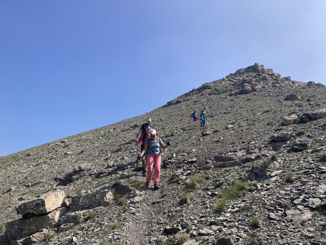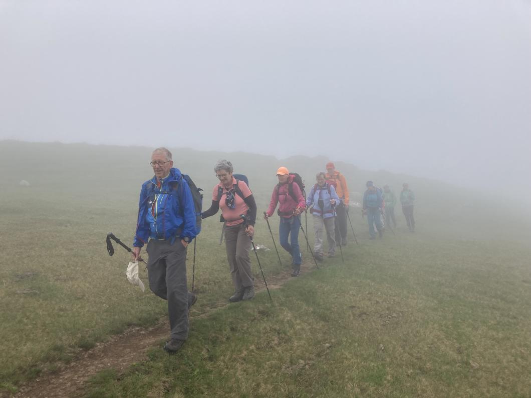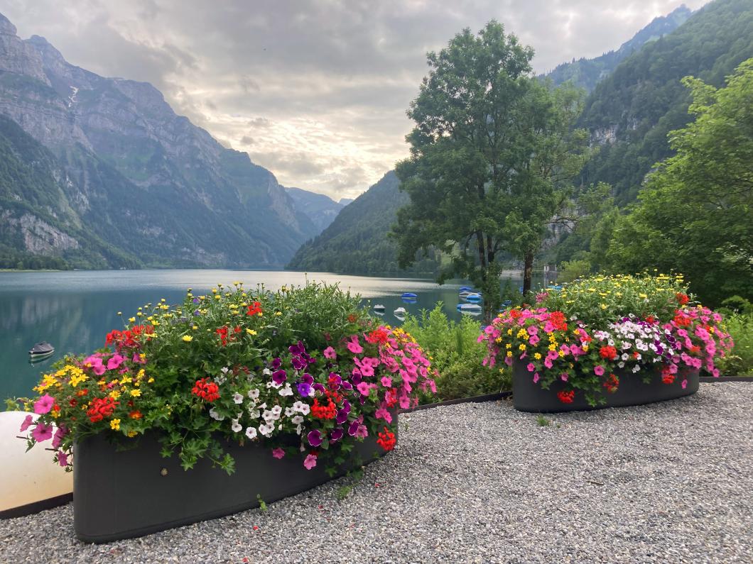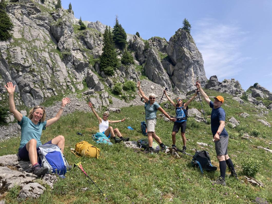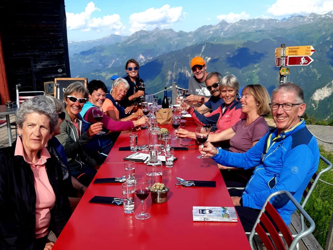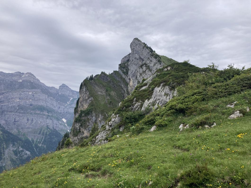 Am nächste Morgä gits früej Tagwach, hi wir doch e lengi Wanderig vor nus. Nach emne ifache zmorgä im Ufenthaltsrum vom Hotel si wir scho am viertel vor 6i bi schönschtem Wätter am Seeufer parat für e Ufstig ufe vorder Glärnisch. Wir luufä bi agnähm frische Temperature ring dür Wald u Wiid, ging wi stotziger, uber Graspörter mit schönä Blueme, uber Felsstufe, wo mit Chötteni guet abgsicheret si. Ab u zue mache wir e trinkpausä, gniesse d Ussicht uf e Klöntalersee u ufds Gärnischmassiv. Witer u witer stige wir uf em wiss-blau-wisse Wanderwägli im ne guete Tempo uf. Scho nach knapp vier Stund stah wir uf em Gipfel vom vorder Glärnisch uf 2328 meter. D Fernsicht isch hüt nät grad guet, es isch dunschtig. Aber das trüebt üsi Früüd nüt, drum stime wir nu das Lied a: Grosser Gott wir loben dich. Nach em obligate Gipfelfoto trenä wir üs umi i zwo Gruppe uf. Die intä näme der Abstieg uf der gliche Route i Agriff, die anderi Gruppe stigt ufem usgsetztä, schott erigä Felswägli ab, richtig Schwändi zrugg, wo wir vor 5 Tag gstartet si. Voll konzentriert miischtere wir aller der Abstig, ds Siili u der Pickel, wo Fritz die ganzi Wuche mittrage het, chunnt o nu zum Iisatz, dass wir di schwirigschtä Stelli sicher chöne abchlättere. Wir chöme froh u dankbar zrugg zu de Autos. Iz fahre wir zum Klöntalersee, wo die inti Gruppe o grad glichzitig achunt vom Gipfelabstieg. Wir näme nu inisch aller es erfrischends Bad im See, bevor wir üsa durscht nu löschä u üs entgültig ufe Hiimwäg mache. Danke vilmal Fritz u Rosina für die schöni, guet organisierti Wanderwucha rund ume Glärnisch. Es isch uhh schöö u gmüetlich gsi. DANKE