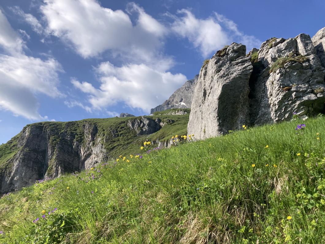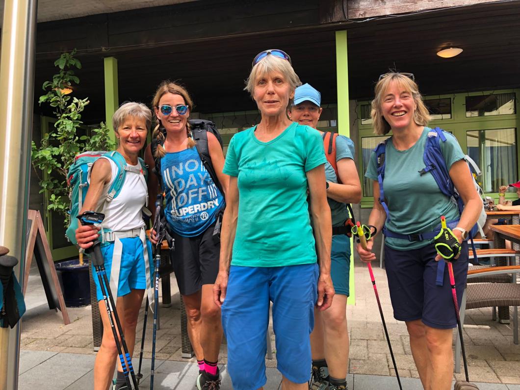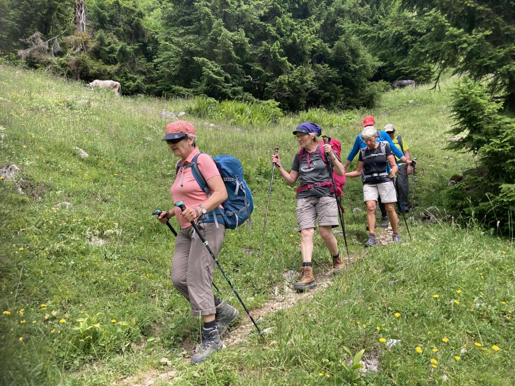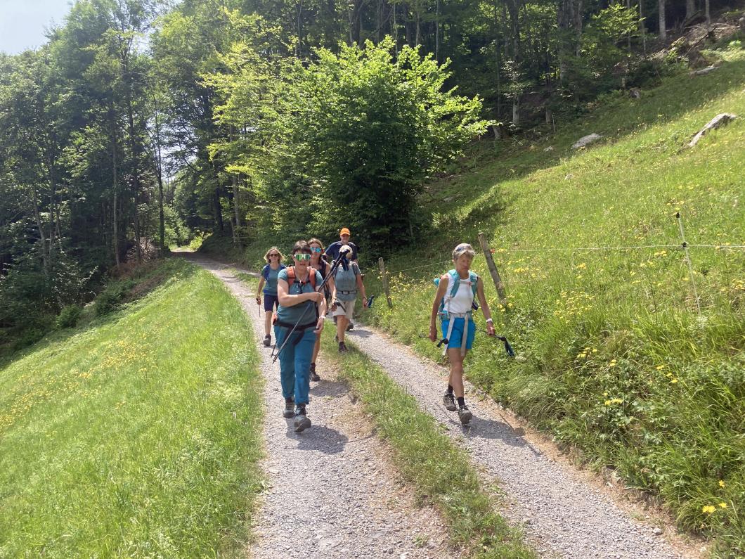 Im Gasthof Richisau, 1102m.ü.M. umgäh vo grossä, alte Ahore, hi wir herrlig gschlafe. Um di 6i dörfe wir endlig uf, imel i üsem Zimmer si scho lang aller wach. Nachemne riichhaltige Zmorge mache wir üs i zwo Gruppe ufe Wäg. Der Himel isch bewölkt, agnähmi Temperature zum luufä. Die erschti Gruppe, füf schnäli Froui, stüüre der Wäg richtig Wiggis Gipfel a. D Rosina nimmt di zwo schwechere grad hinder sig, u di zwo sterchere möge grad knapp nachi. So giits zügig desuehi, bis uf d Alp Dejen uf 1730. Das isch dä Ort, wo sig de speter die zweiti Gruppe mitem Fritz, wo hüt chli gmüetliger underwägs wott si, ufe Abstiig richtig Klöntaler See würd mache. Wir füf Froui wandere witer uf un ab, bis ob d Auerenalp. Vo da ewägg isch blau-wiss markiert. Iz giits 300hm dür nes stotzigs, grasigs Couloir desuehi, bis zu de Felsä, wo ma quer dür z Gröll, när nu es gäbigs Stück dür d Ankebäleni uf e Gipfel vom Wiggis uf 2282m chunnt. Während der Mittagsrascht gniess e wir d Ussicht uf die umligende Bärge u grediahi ids Tal uf d Ortschafte vo Glarus. Angens is mache wir üs umhi ufe Wäg, wir hi nu fascht 2000hm Abstig vor nus. Stotzig giits nitzig, es isch sunnig u warm. Wir stuunä ab der Bluemepracht; Füürlilie, Türkebund, gälbe Fingerhuet u viles meh. Am Ziel aglangt, bim Hotel Rhodannerberg, stosse wir uf die zweiti Gruppe, wo scho badet u duschet im Apero ischt. Wir gniesse der erfrischend schwumm im herrlige See, u la dä Tag uf der Terasse, wo wir nu ar Suna chöne Znacht äässe, la usklinge. När giits zytlig ids Bett.