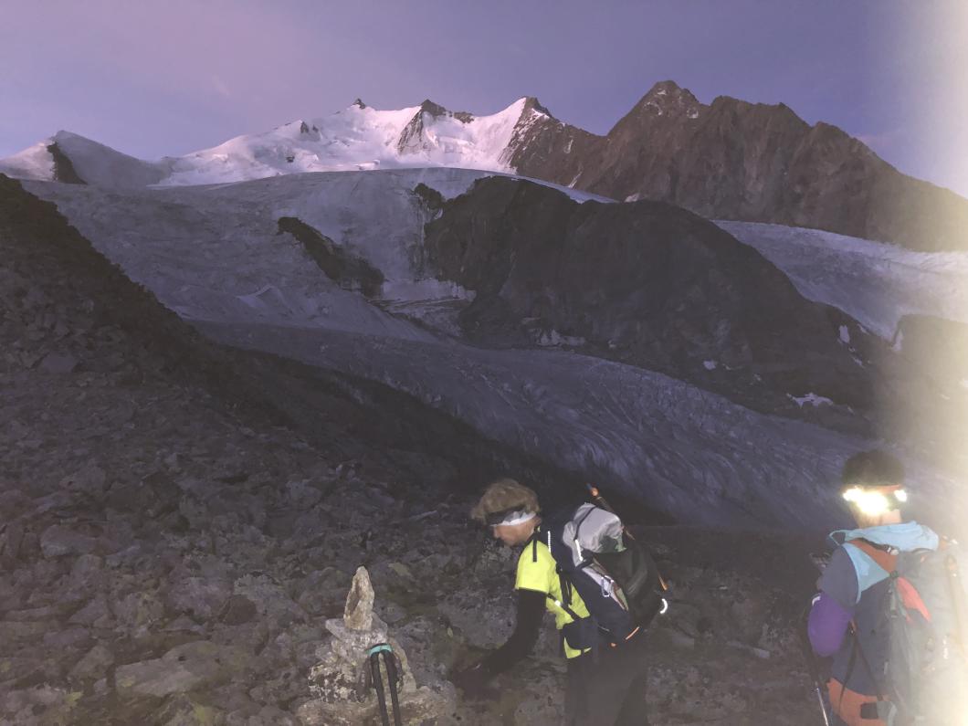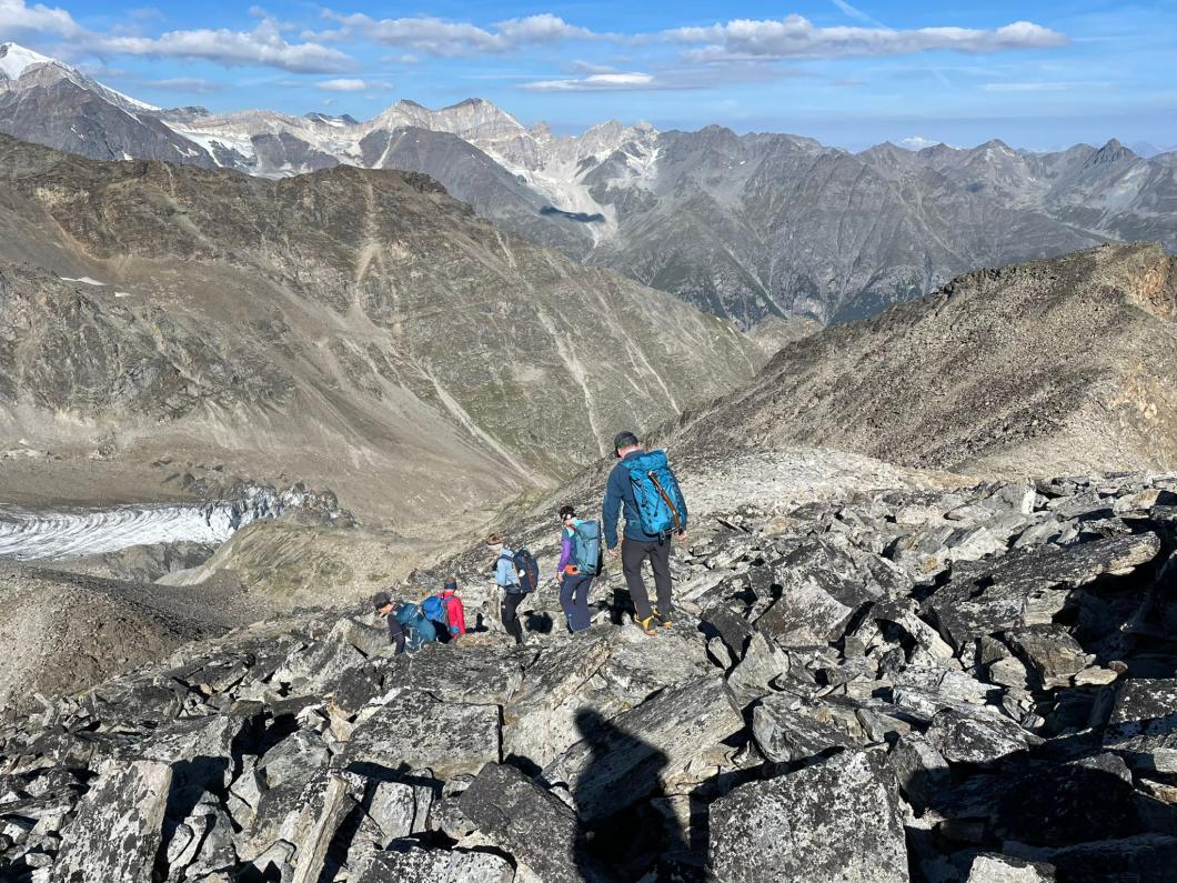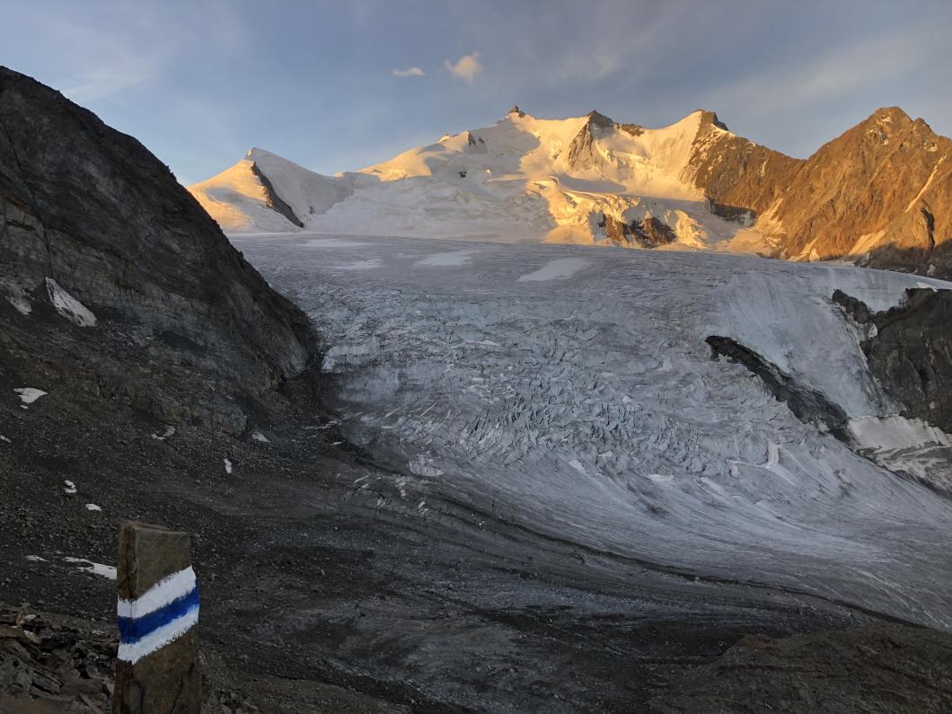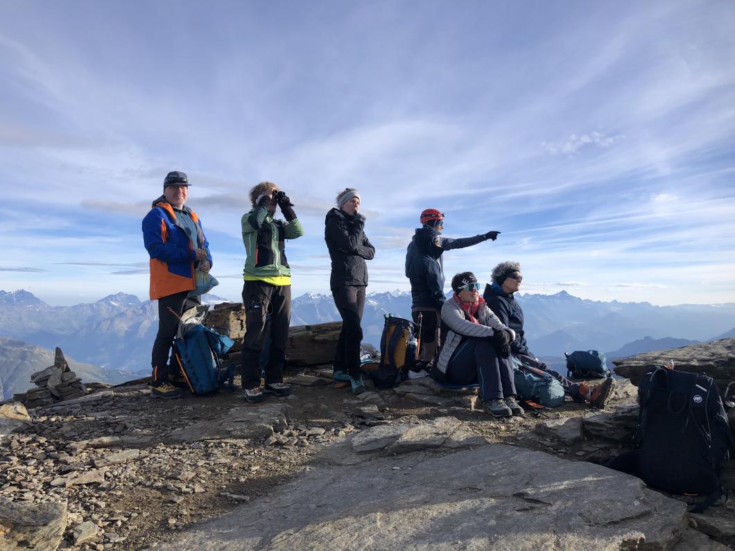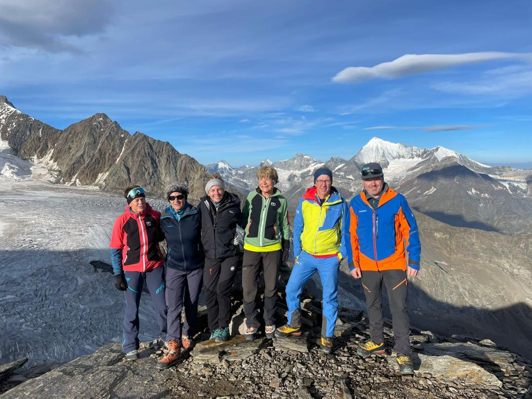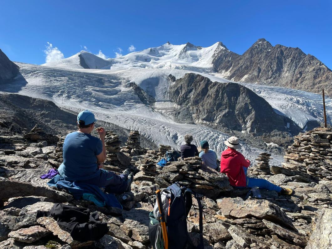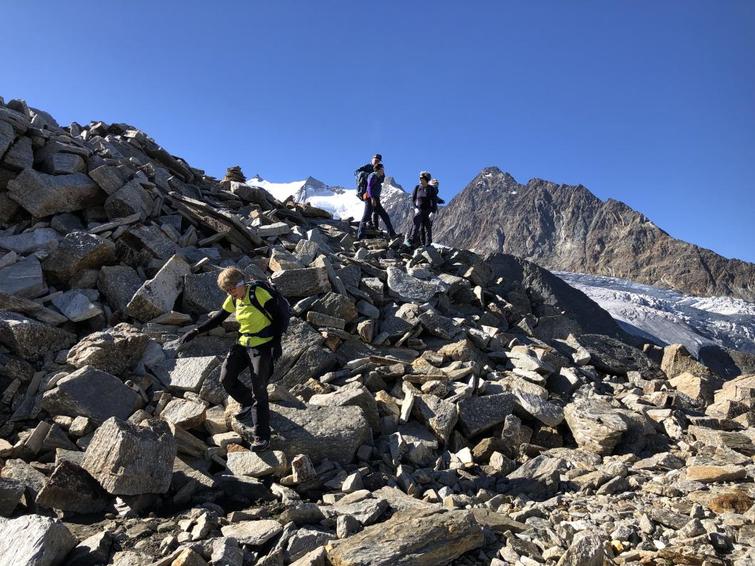 | Tourenbericht Gross Bigerhorn (statt Balfrin) Hoch gesteckt war unser Ziel den Balfrin via Gross Bigerhorn zu besteigen. Um 0450 marschierten wir in der Bordierhütte mit Stirnlampe ab. Während die Bergwelt erachte, stiegen wir über Schutt- und Blocksteinfelder und erreichten um 0745 das Gross Bigerhorn. Wir genossen die imposante Kulisse des Nadelgrates und die mehrere Quadratkilometer grosse Ebene des Riedgletscher. Mit Respekt schauten wir auf den Nordgrat des Balfrin hinüber - noch mindestens 2 Stunden Aufstieg. Bald waren wir uns einig, wir begnügen uns mit dem erreichten Ziel. Unser Blick schweifte während unserer über einstündigen Gipfelrast nicht nur in die Walliser (Weiss-, Bishorn und Barhörner), sondern in der Ferne auch in die Waadtländer, Berner, Urner und Tessiner Alpen. Dazwischen das Tierhöri und dahinter guckte das Gsür hervor sowie weit, weit unten Visp. Dann ging es 2000 Höhenmeter ins Tal hinunter. Ein kurzer Abstecher auf das Kleine Bigerhorn gab uns den Blick frei auf den ganzen Riedgletscher, die Bordierhütte und den Abstieg nach Gasenried, wo das Auto wartete. Um 1445 trafen wir in der Hütte ein und teilten uns eine Walliser Rösti mit Spiegelei. Um 13 Uhr (fuhr kein Bähnli) begannen wir den Abstieg. Nach einer Stunde erreichten wir das Gletschertor, eine Stunde später die romantische Alpja und wieder eine Stunde später entlang der Suonen und durch Lärchenwälder glücklich Gasenried. Vor 12 Stunden war Tagwache! Ein eindrücklicher Tag in der herrlichen Bergwelt, eine Schramme an einer Nase und brennende Füsse sowie die Erfahrung «Schuster bleib bei deinen Leisten» bleiben uns in Erinnerung. Ob schon die ersten Regentropfen fielen, träumten wir schon von unserer nächsten gemeinsamen Tour. Bänz |