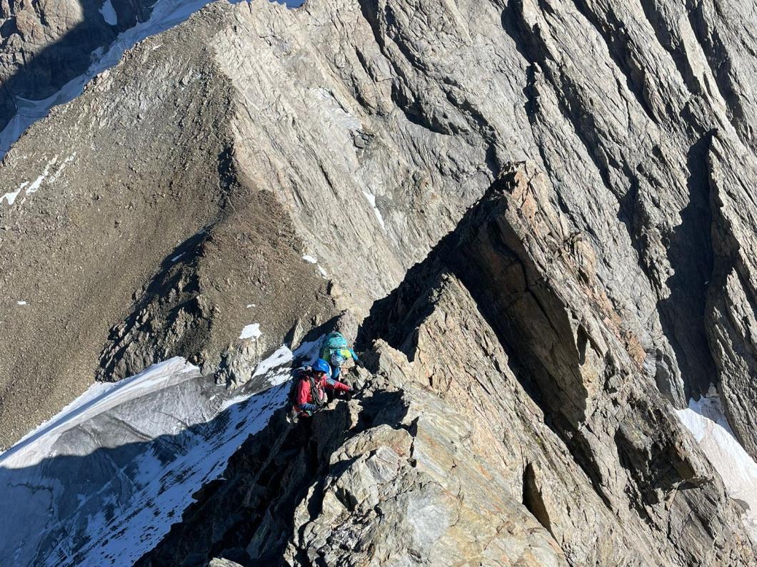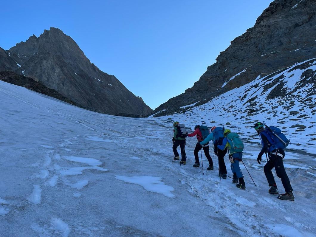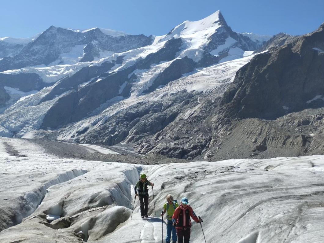 | Tourenbericht Samstag, 9.September Gut gelaunt starten wir von der Pfingstegg aus, via Bäregg, zur Schreckhornhütte. Unterwegs lassen wir uns 'verzaubern' von der Schönheit der Bergwelt mit den Gletschern. Bei der Hütte geniessen wir das gemütliche 'Miteinander' an der Sonne. Anschliessend werden wir verwöhnt mit einem feinen Znacht. Sonntag, 10.September Start um 5 Uhr... wie herrlich, den Tag zu begrüssen! Die Berggipfel werden schon bald von der Sonne beschienen. Via Gaagg erreichen wir den Strahleggpass. In Zweierseilschaften aufgeteilt, führt uns Yvonne sicher - mit ihrer ruhigen, ermutigender Art - über den Grat zum Gipfel des Strahlegghorns. Es ist eine imposante Kletterei, die Konzentration erfordert und grosse Freude bereitet! Der Abstieg erfolgt über den Südwestgrat, über viel Geröll, zurück zur Hütte. Hier stärken wir uns für den laaaaaaaaaangen Abstieg zurück zur Pfingstegg. Müde, aber alle sehr glücklich, fahren wir mit der Bahn nach Grindelwald. DANKE Yvonne für die gut organisierte, wunderschöne Tour! Bericht: Brigitte Schwabe |