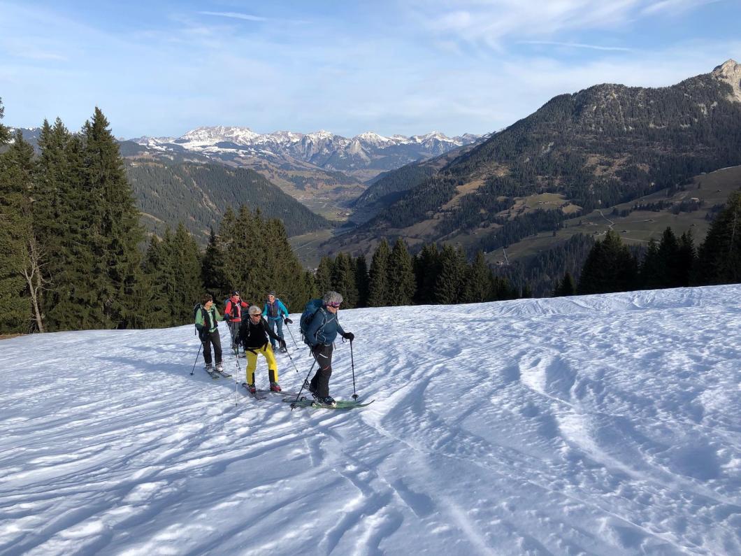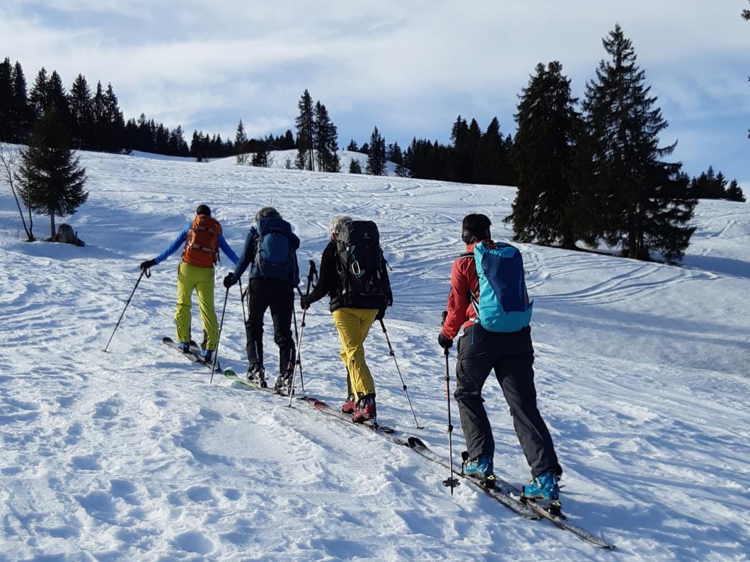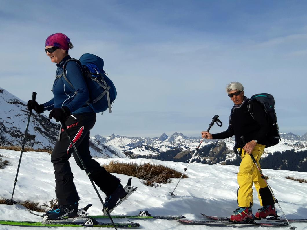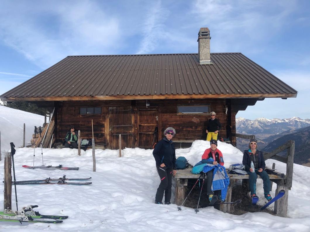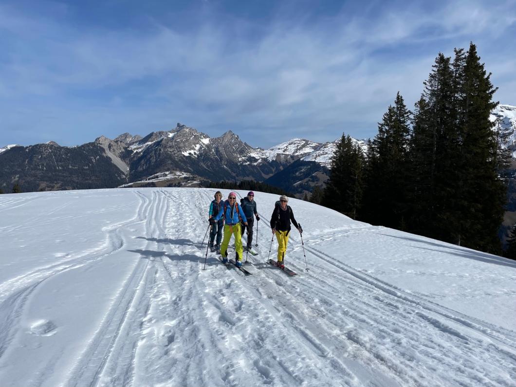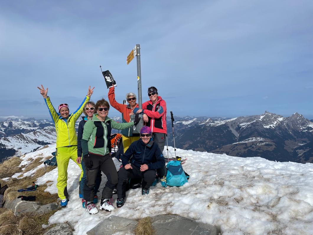 | Tourenbericht Ah, d Michèle hetti o nu e Mittwuchtour am 22.Februar… i mälde mi doch mal a… Schön, chunnsch ou, isch d Antwort… aber wohäre wott si ächt, nehmi mig Wunder, bi däre Schneelaag... Am Mentig chunnt d Antwort per SMS: Tourenziel Wistätthorn ab St. Stephan… OK… der Talbode isch uf 998m u ds Horä uf 2362… hets äch da nu Schnee, i so tüüfä Lagä?... Mir si gspannt, u fahre am Mittwuch morgä mit em grosse Auto vor Brigitt z füft nach St.Stephan. Bim Bahnhof träffe wir üs mit üser ufgstelltä Toureliiteri, u fahre nu es Stück ds Strässli uehi, bis zum Gräbli uf der Flueh. Die erstä 50 hm luufä wir nu der Wanderwäg uf, u scho chöne wir d Ski alegä… wär hetti das denkt, witer giits alls im Schnee... gmüetlich stigä wir bi bestem Wätter bis ufds Wistätthorä… obna gniesse wir d Ussicht u der Blick ids grüene Simmetal. D Abfahrt isch besser als erwartet, gwüss nu chli Sulz, u gar nüt uweg. Z fride cherä wir nu im ne Gasthuus i, u la dä schöö Tag revue passierä. Dankä allnä für die flotti Kameradschaft, u e bsundera Dank ar Michèle für die herrligi Tour, wo sie da usgsuecht het. Es isch schöö gsii! Bericht: Mädi Lauber |