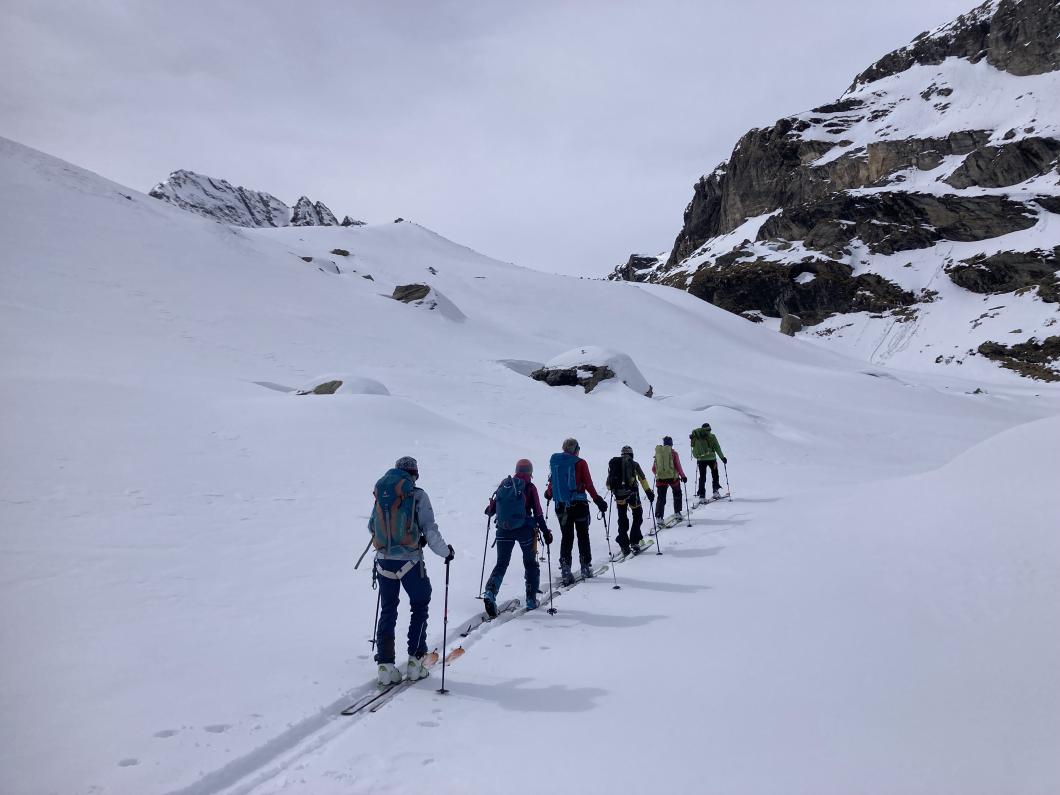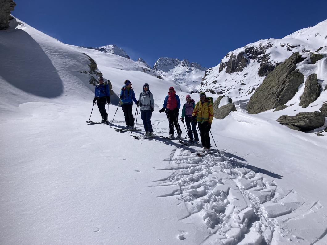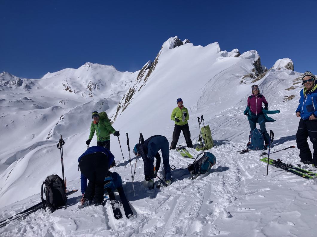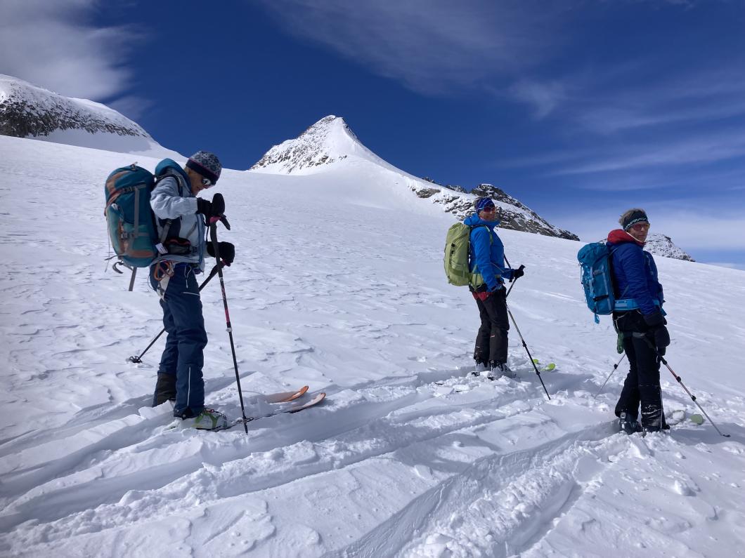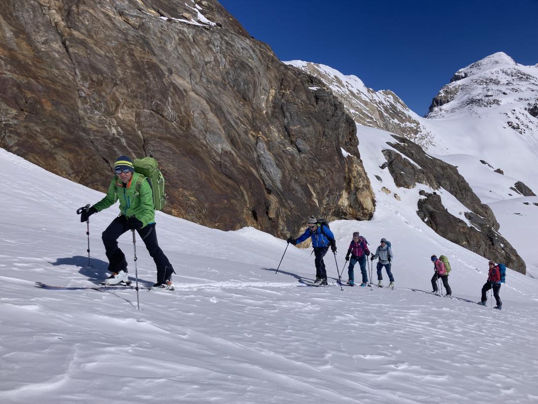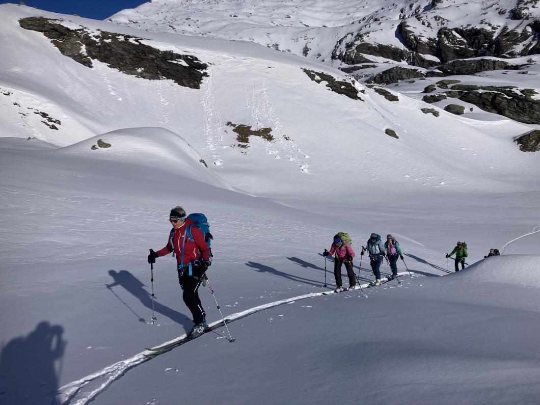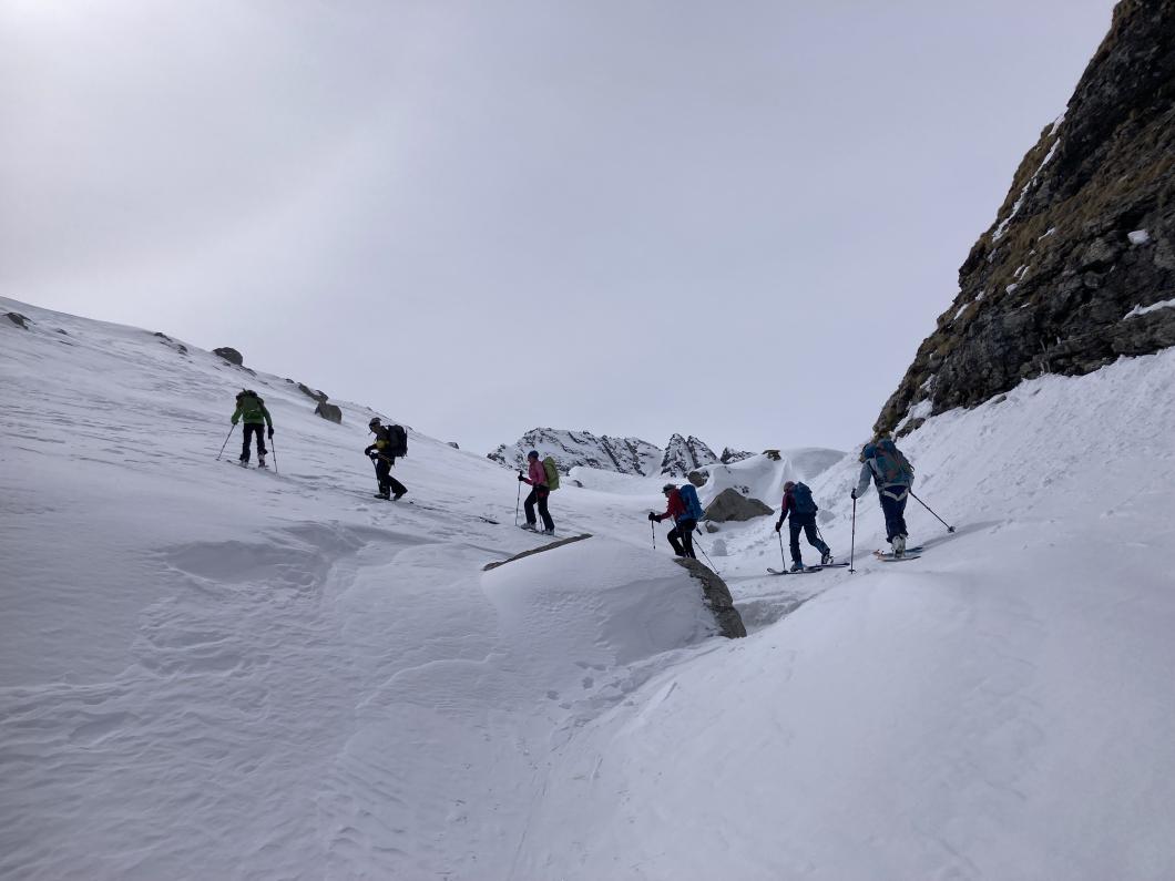 | Tourenbericht Tourenbericht Oberalpstock/ Basodino Da an den vorgesehenen Daten für die Touren Basodino und Oberalpstock das Wetter nicht mitspielte, haben Erwin und ich, in Absprache mit den angemeldeten Teilnehmern entschlossen, die Tour zusammen im Tessin zu unternehmen. Somit reisten wir Dienstag 4. April nach All Acqua ins Bedrettotal und stiegen von dort mit einigen Startschwierigkeiten hoch zur Bocchetta di Formazzora. Der letzte Hang war steil, durch die aktuelle Lawinensitation musste dieser Vorsichtig begangen werden. Alle gut oben angekommen, erfolgte eine kurze Abfahrt, um anschliessend wieder aufzusteigen Richtung Marchhorn. Da kurz vor dem Gipfel der Wind zu stark war verzichteten wir auf die Besteigung. Wir benutzten den Übergang unterhalb des Pizzo Fiorina und gelangten hinunter zu unserem Tagesziel der Basodino Hütte. Diese war nicht bewartet, somit wurde in der gut eingerichteten Küche Wasser gekocht, um Tee und Suppe zu machen. Die Zimmer wurden bezogen, etwas ausgeruht, und um 18.30 Uhr gabs zum Nachtessen Spa ghetti Bolognese. (Sauce von Erwin vorgekocht mit Hirschfleisch in Adelboden) Zur Geburtstagsfeier von Erwin, gabs noch ein Stück Nusstorte die von Rita gebacken wurde. Am nächsten Tag starteten wir bei schönem Wetter Richtung Basodino. Nach ca 200 Höhenmetern kam ich etwas von der Originalroute ab, was sich aber im Nachhinein als vorteilhaft erwies, da eine Steilstufe auf der Originalstrecke wegen der Lawinengefahr sehr gefährlich gewesen wäre zu passieren. Nach einem langen Aufstieg über den Basodino-Gletscher erreichten wir das Skidepot. Da in den Tagen zuvor niemand auf dem Gipfel war, kämpften wir uns im teils tiefen Schnee über den Grat zum Gipfel. Oben angelangt genossen wir die schöne Aussicht und stiegen zurück zum Skidepot. Mit den Skiern erfolgte eine schöne Abfahrt über den mit wenig Schnee bedecktem Gletscher bis hinunter auf ca 2200. Unten angelangt, hiess es wieder Felle montieren, um die ca 450 Höhenmeter hinauf zur Bocchetta di Val Maggio aufzusteigen. Oben angelangt, mussten wir einige Meter zu Fuss absteigen und genossen anschliessend auf der anderen Seite nochmals einen schönen Pulverhang hinunter zur Alpe Regina. Nochmals folgte ein Aufstieg hinauf zum Passo San Giacomo und einer weiteren Abfahrt hinunter nach All Acqua. Auf der Rückreise durch den Gotthard-Tunel machten wir Halt in der Raststätte Gotthard Nord, löschten unseren Durst und stillten unseren Hunger und fuhren zurück nach Adelboden. Alle waren sich einig, es waren zwei gelungene Tourentage im Nord-Tessin. Fritz |