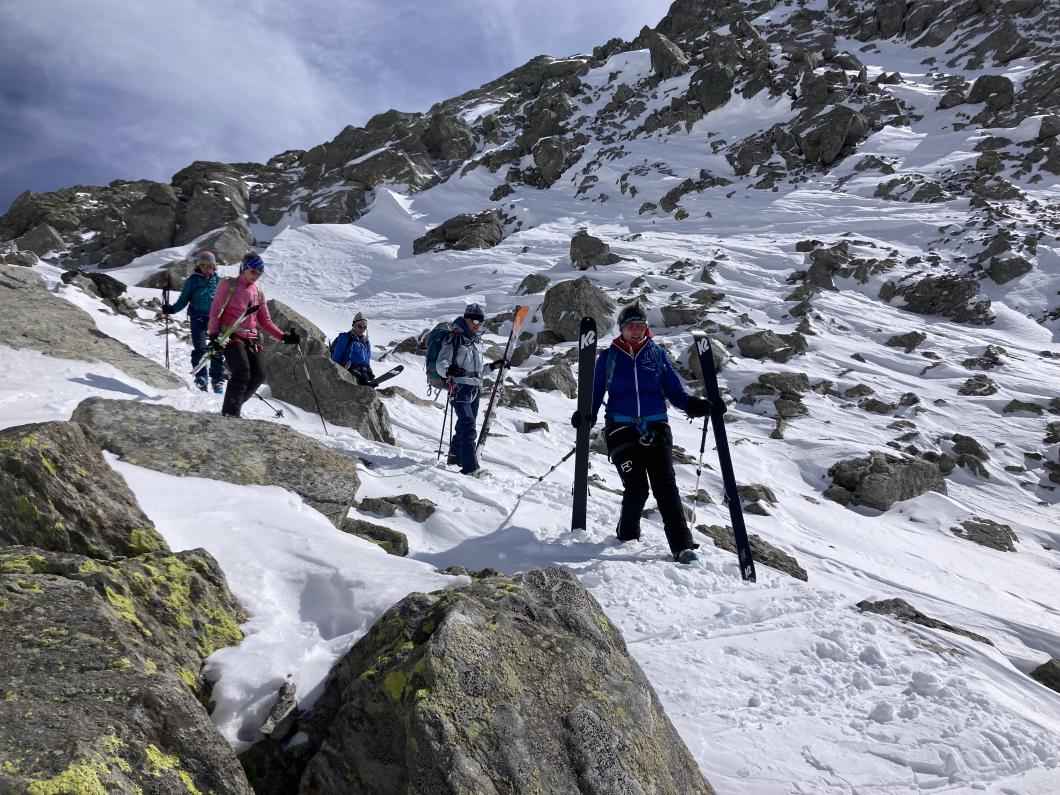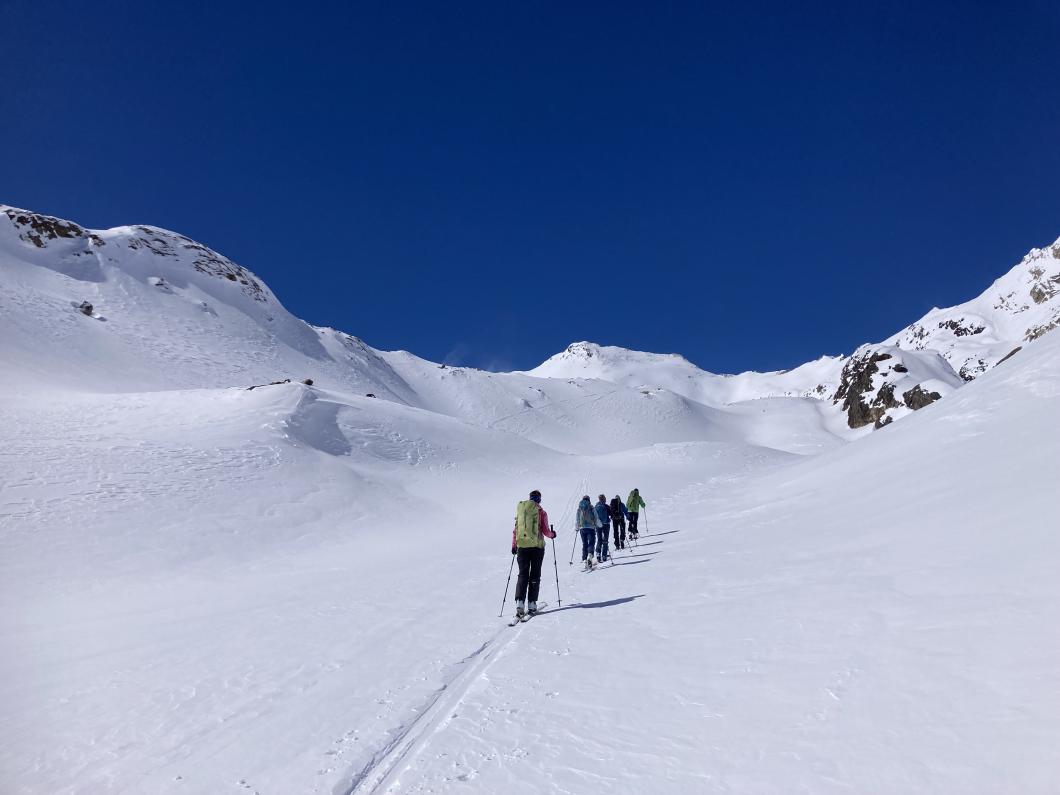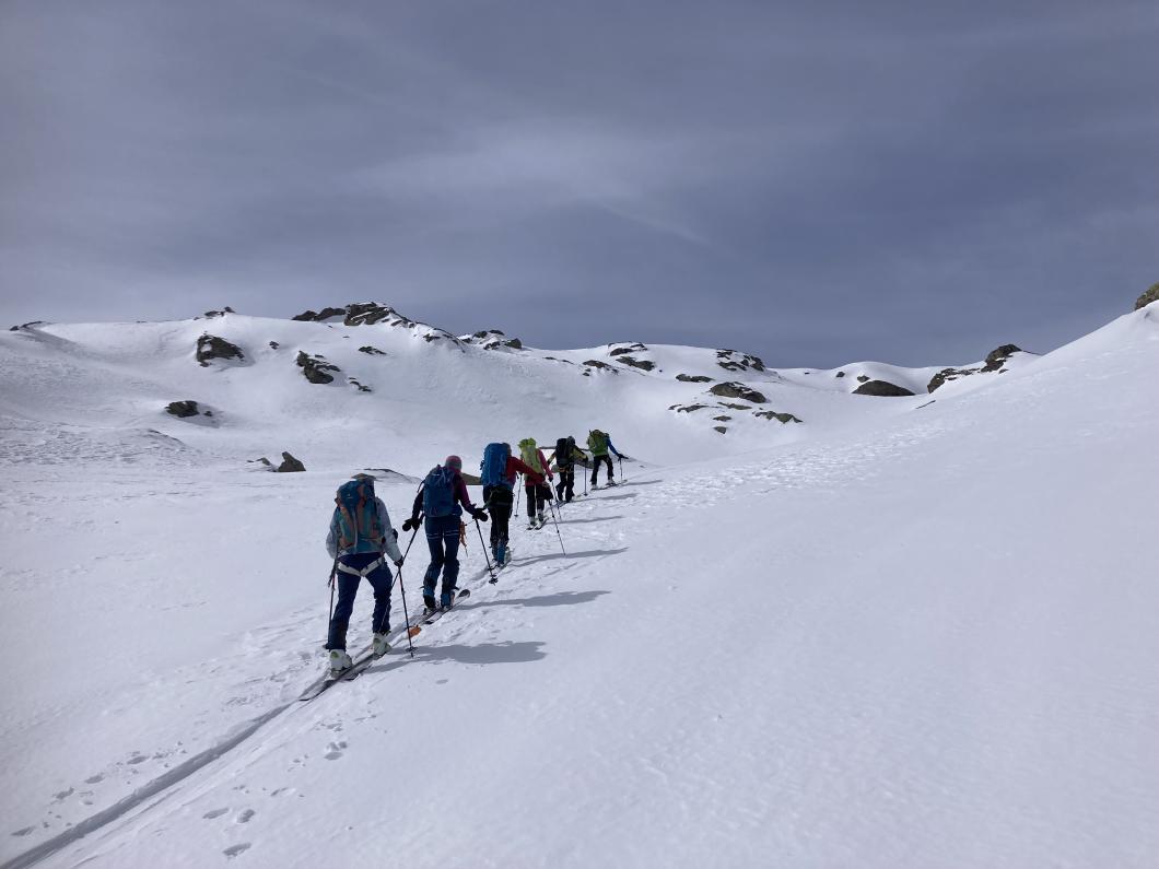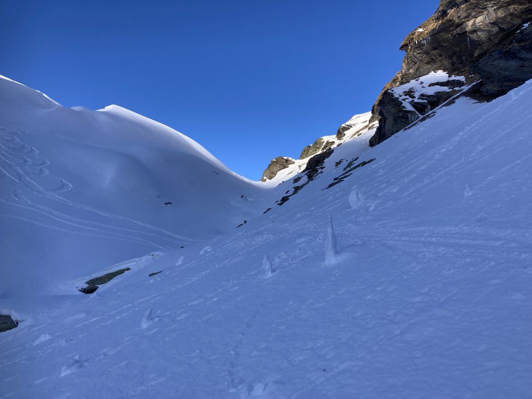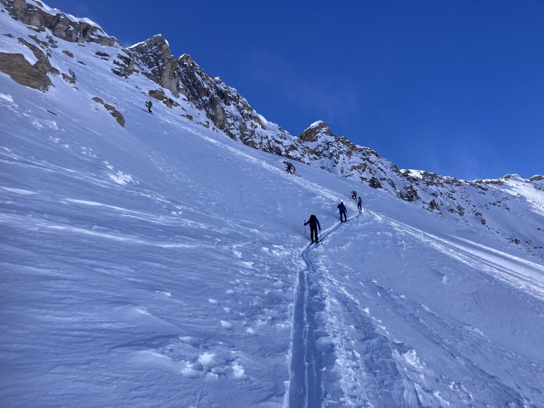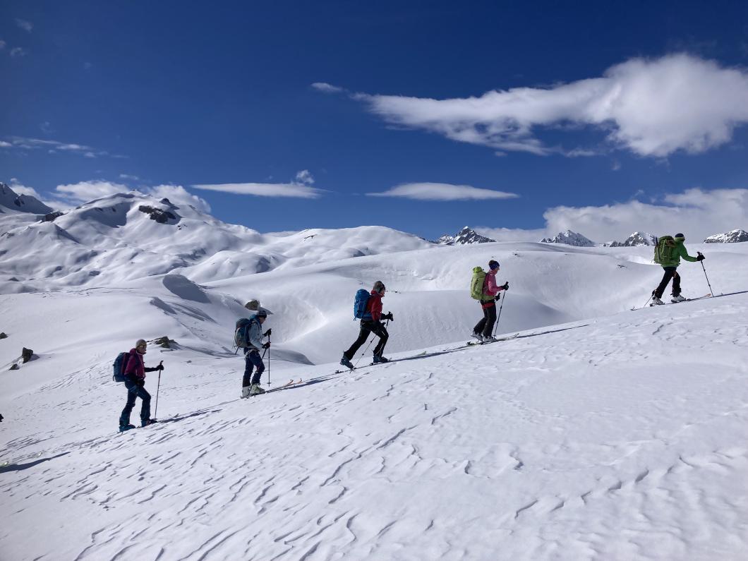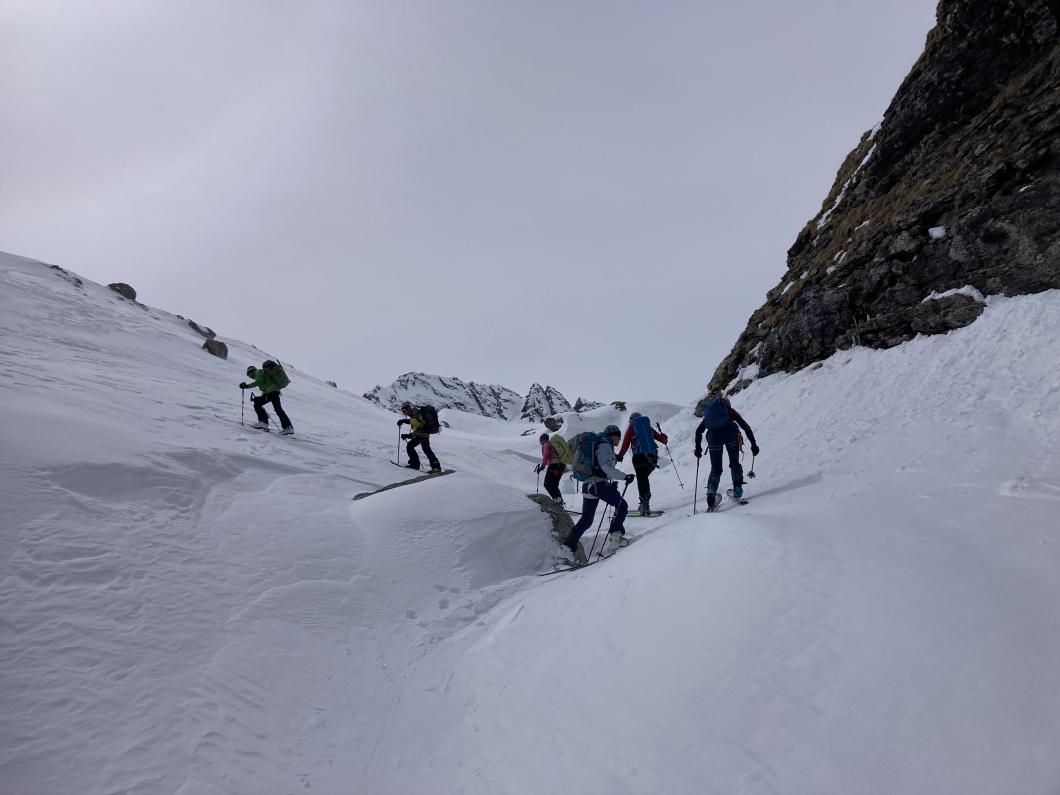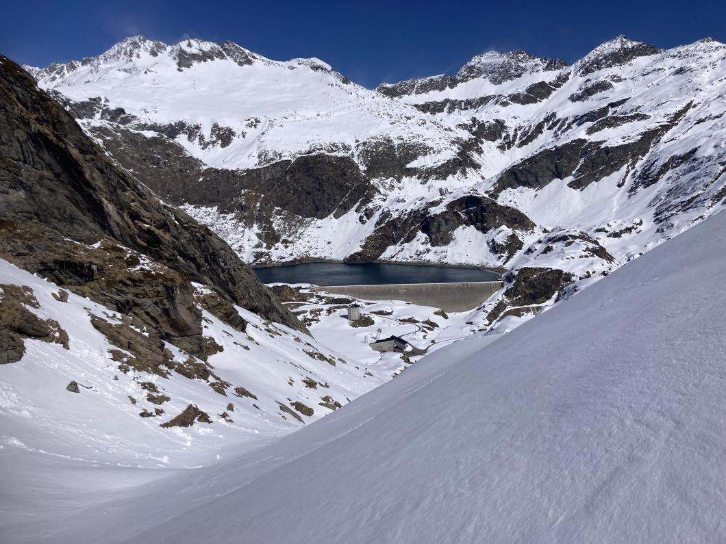 | Tourenbericht Tourenbericht Oberalpstock/ Basodino Da an den vorgesehenen Daten für die Touren Basodino und Oberalpstock das Wetter nicht mitspielte, haben Erwin und ich, in Absprache mit den angemeldeten Teilnehmern entschlossen, die Tour zusammen im Tessin zu unternehmen. Somit reisten wir Dienstag 4. April nach All Acqua ins Bedrettotal und stiegen von dort mit einigen Startschwierigkeiten hoch zur Bocchetta di Formazzora. Der letzte Hang war steil, durch die aktuelle Lawinensitation musste dieser Vorsichtig begangen werden. Alle gut oben angekommen, erfolgte eine kurze Abfahrt, um anschliessend wieder aufzusteigen Richtung Marchhorn. Da kurz vor dem Gipfel der Wind zu stark war verzichteten wir auf die Besteigung. Wir benutzten den Übergang unterhalb des Pizzo Fiorina und gelangten hinunter zu unserem Tagesziel der Basodino Hütte. Diese war nicht bewartet, somit wurde in der gut eingerichteten Küche Wasser gekocht, um Tee und Suppe zu machen. Die Zimmer wurden bezogen, etwas ausgeruht, und um 18.30 Uhr gabs zum Nachtessen Spa ghetti Bolognese. (Sauce von Erwin vorgekocht mit Hirschfleisch in Adelboden) Zur Geburtstagsfeier von Erwin, gabs noch ein Stück Nusstorte die von Rita gebacken wurde. Am nächsten Tag starteten wir bei schönem Wetter Richtung Basodino. Nach ca 200 Höhenmetern kam ich etwas von der Originalroute ab, was sich aber im Nachhinein als vorteilhaft erwies, da eine Steilstufe auf der Originalstrecke wegen der Lawinengefahr sehr gefährlich gewesen wäre zu passieren. Nach einem langen Aufstieg über den Basodino-Gletscher erreichten wir das Skidepot. Da in den Tagen zuvor niemand auf dem Gipfel war, kämpften wir uns im teils tiefen Schnee über den Grat zum Gipfel. Oben angelangt genossen wir die schöne Aussicht und stiegen zurück zum Skidepot. Mit den Skiern erfolgte eine schöne Abfahrt über den mit wenig Schnee bedecktem Gletscher bis hinunter auf ca 2200. Unten angelangt, hiess es wieder Felle montieren, um die ca 450 Höhenmeter hinauf zur Bocchetta di Val Maggio aufzusteigen. Oben angelangt, mussten wir einige Meter zu Fuss absteigen und genossen anschliessend auf der anderen Seite nochmals einen schönen Pulverhang hinunter zur Alpe Regina. Nochmals folgte ein Aufstieg hinauf zum Passo San Giacomo und einer weiteren Abfahrt hinunter nach All Acqua. Auf der Rückreise durch den Gotthard-Tunel machten wir Halt in der Raststätte Gotthard Nord, löschten unseren Durst und stillten unseren Hunger und fuhren zurück nach Adelboden. Alle waren sich einig, es waren zwei gelungene Tourentage im Nord-Tessin. Fritz |