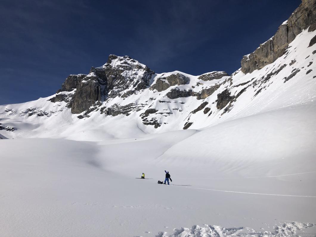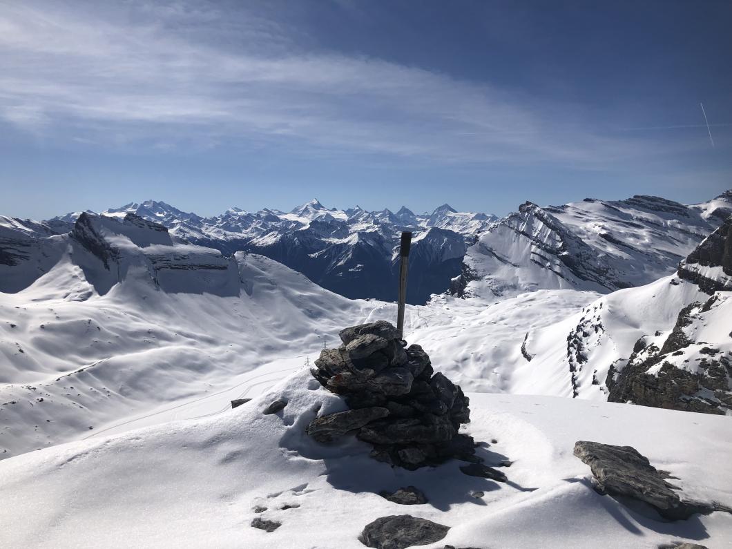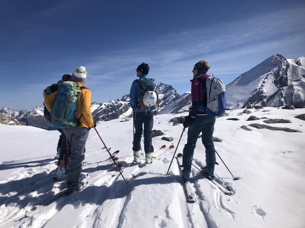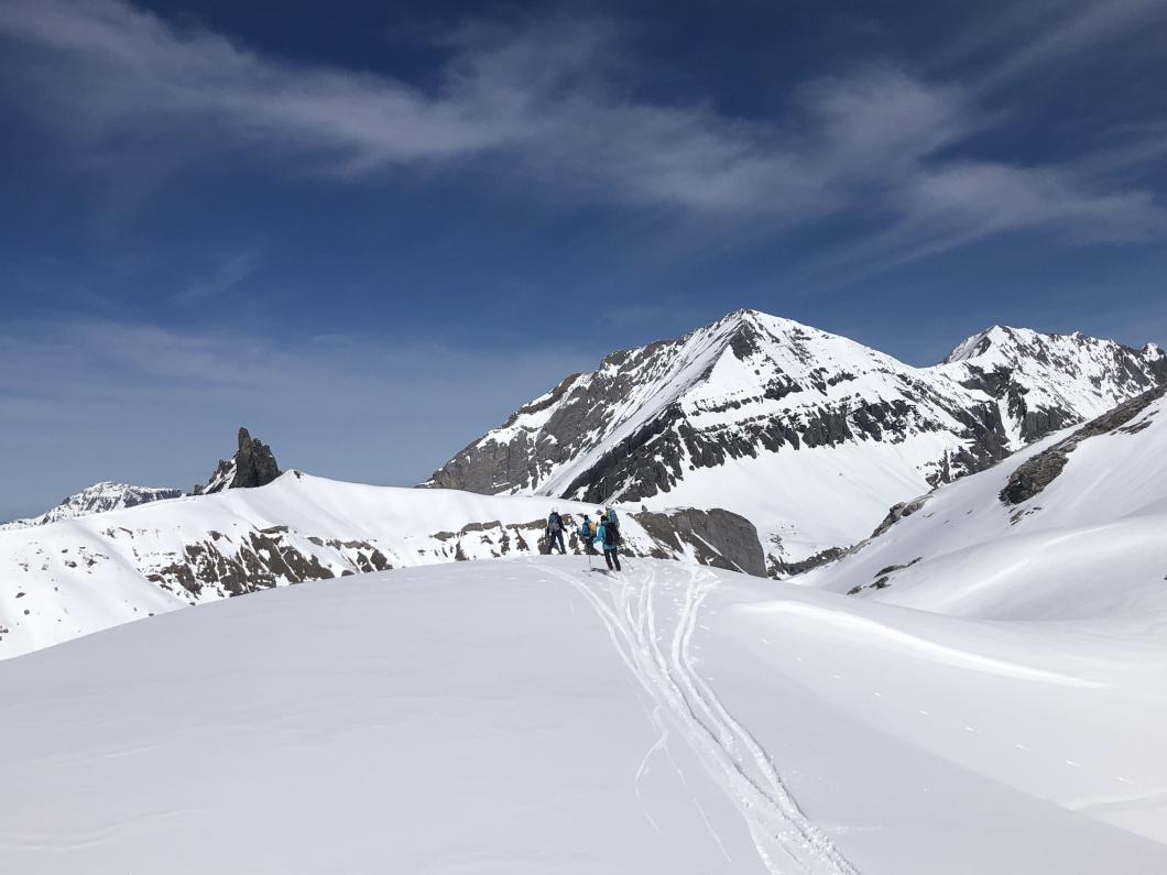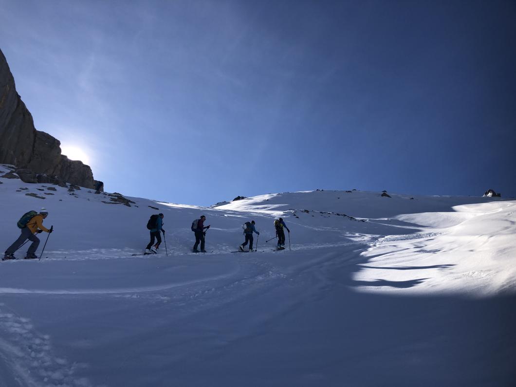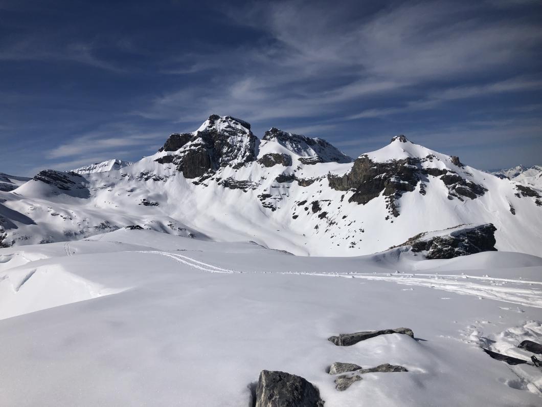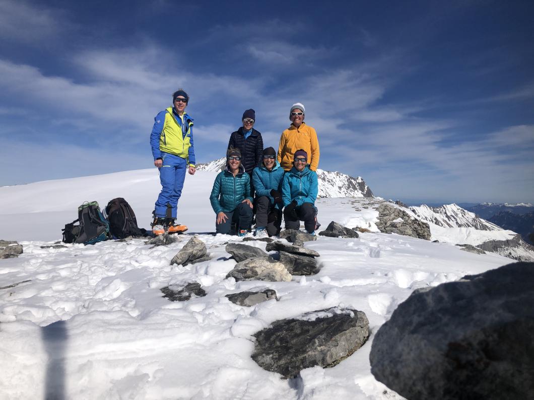 | Tourenbericht Wenn sechs SAC’ler via Chindpettipass das Felshore besteigen und davon fünf trainierte Damen vorabziehen, um die Aussicht auf die Walliser Viertausender zu geniessen, müssen dazu dreimal die Felle aufgezogen werden und im Tälli zweimal abgefahren werden. Es wurde eine einzigartige Skitour, insbesondere weil das Wetter sich von bester Seite zeigte. Um 0900 zogen wir am Dossen das erste Mal die Felle auf und stiegen über eine bestehende Spur durch Pulverschnee zügig gegen den Chinpettipass hoch. Dabei blies ein kalter Wind vom Pass hinunter. Nach einer halben Stunde oben angekommen war es windstill. Znüni? Um gehend fuhren wir über Frühjahrschnee zum Tälligletscher ab. Vom Tierhöri-Grat war vor einigen Tagen ein Schneebrett niedergegangen. Die Felle waren um 0950 ein zweites Mal montiert und in grosszügigen Bogen ging Nadia vorab. Um 1030 erreichten wir das Felshore. Znüni oder Mittagessen? Znüni mit Aussicht: Im Süden in 100km die Walliser Alpen mit Fletsch- und Lagginhorn sowie Weissmies, dann die Mischabelgruppe, vorab mit Nadelhorn und Dom, weiter mit der Monte Rosagruppe, weiter zum Zinalrothorn und Matterhorn sowie Bis- und Weisshorn. Im Südwesten der Rote Totz und der Tälligletscher, dann der Gipfelkranz der Engstligenalp, daneben über dem Chindpetipass und Albrist im Western in 100km der Jura mit Mont Tendre und neben dem Gsür der Chasseral. Wäre da nicht der Lohner. Doch auch hier die Sicht nach Norden im Dunst wieder mit Jura vom Feldberg bis Randen. Dann Nordost mit Hogant, Ärmighorn … Blümlisalp und Doldenhorn. Über dem Gasterntal (nicht sichtbar) die Bern/Walliser des Löschentals mit Gletscherhorn, Breithorn sowie Tschingelhorn. Und im Osten mächtig der Altels, das Balmhorn sowie das Rinderhorn und zu Füssen das nördliche Ufer des Gemmisees und der Gemmipass Ein bunter Strauss an Gipfel auf nur 2784m ü.M. Gemäss Führer ist das Felshore «kein markanter Gipfel, aber dank den schönen Hänge auf der NW-Seite und dem verblüffenden Blick … dennoch lohnend». Kurz nach 1100 stachen wir direkt zum Tällisee hinunter. Zuerst bogen wir zu früh ab, hier war es für die heutigen Verhältnisse aber zu steil. Die App zeigte uns den Weg. Erst östlich des Vorgipfel bei Punkt 2756 abbiegen und nördlich vom Pkt 2625 hinunter. Oben kämmten wir den Hang mit 15cm Pulver mit schönsten Schwüngen. Sonnseitig waren Ansätze zu Bruchharst, teilweise Triebschnee und Achtung ein Stein! Und ein drittes Mal Felle aufziehen, dann wurde es warm. Vom Pkt 2429 nutzte Nadine die mässig steilen Hangflächen, um in direkter östlicher Richtung - durch den mit Abfahrtsspuren verfahrenen Hang - wieder auf die Höhe des Sommerweges zu gelangen. Mit gross gewählten Abständen erreichten wir durch den nassen Schnee um 1210 wieder den Chindpettipass. Die Schlüsselstelle hatten wir zeitig gemeistert. Nun war Mittagessen angesagt, denn das Mitgebrachte schmeck zu Hause nicht mehr so gut. Die Abfahrt ca 1240 zur Engstligenalp hinunter, ging mit rasanten Schwüngen durch Pulver und unten wartete noch etwas Sulz. Was wollen wir noch mehr…? Um 1320 nahmen wir die Luftseilbahn und gelangten glücklich hinunter ins Grüne ‘Unter dem Birg’. Danke Nadine, das Felshore war mehr als lohnend! |