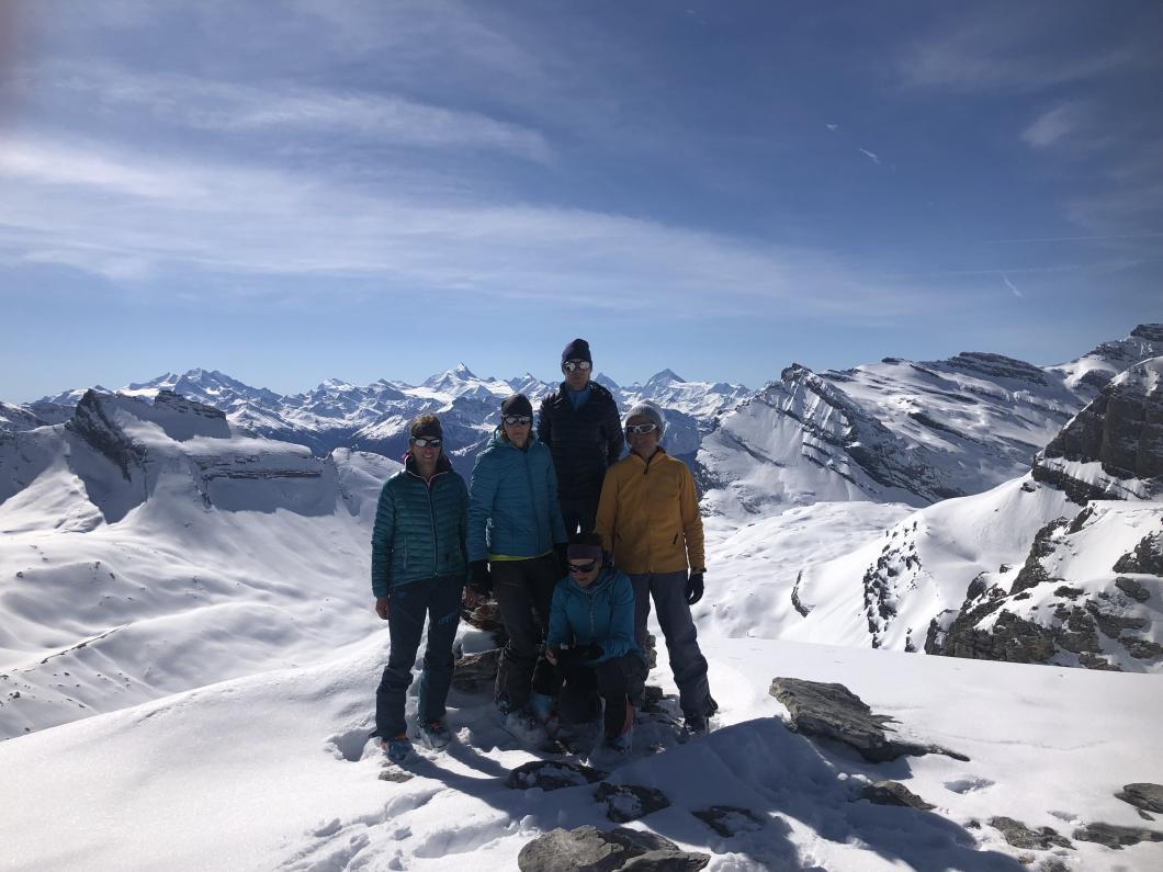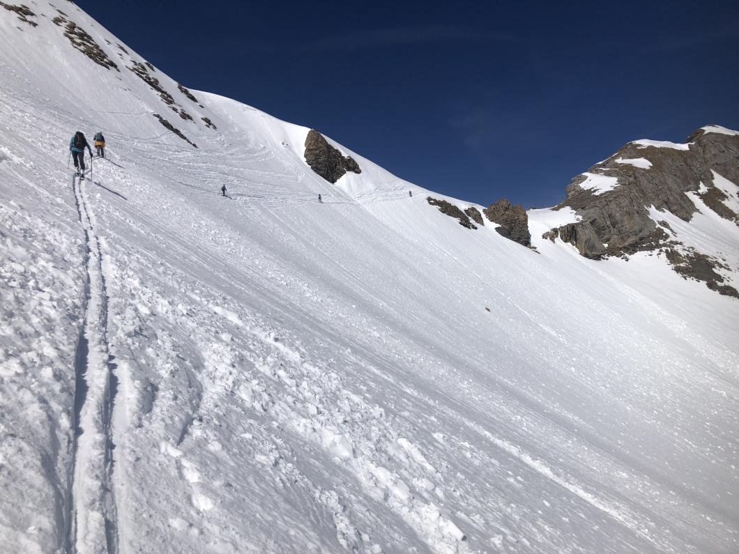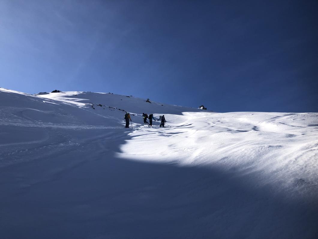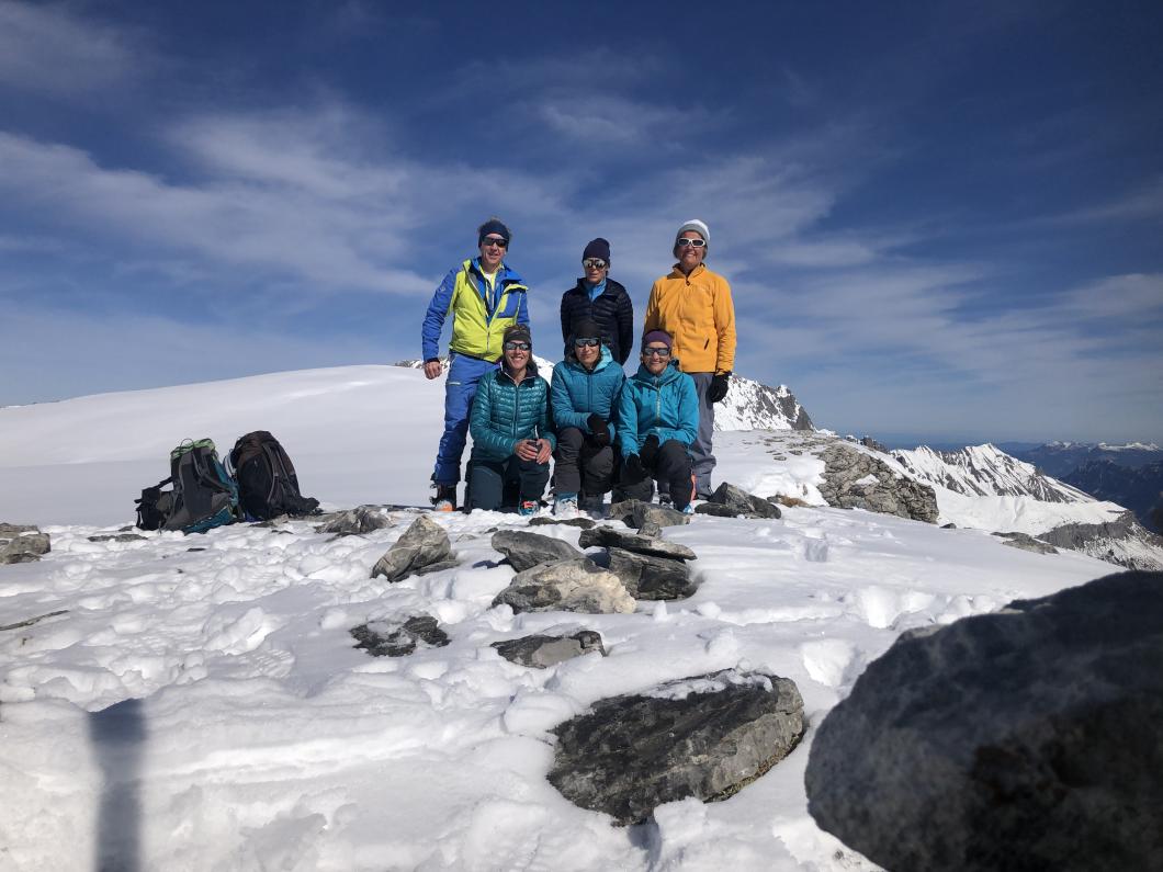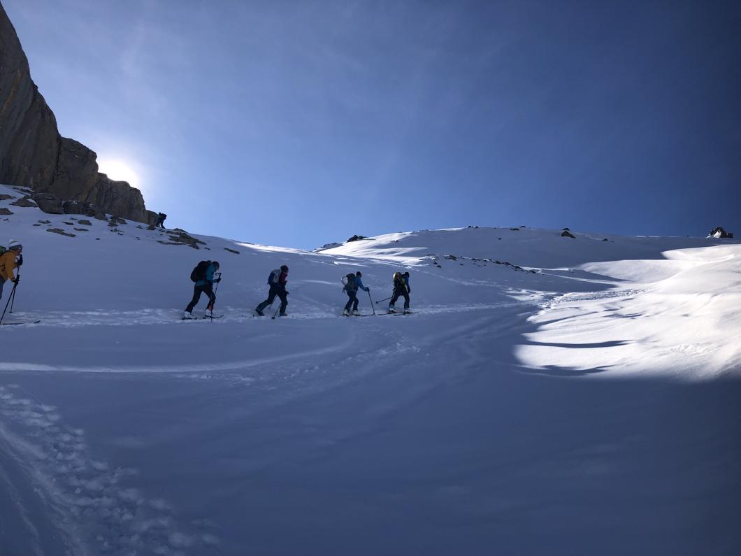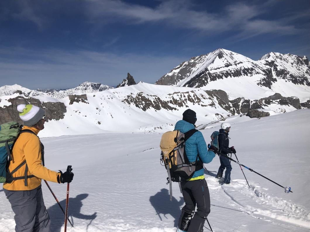 | Tourenbericht Wenn sechs SAC’ler via Chindpettipass das Felshore besteigen und davon fünf trainierte Damen vorabziehen, um die Aussicht auf die Walliser Viertausender zu geniessen, müssen dazu dreimal die Felle aufgezogen werden und im Tälli zweimal abgefahren werden. Es wurde eine einzigartige Skitour, insbesondere weil das Wetter sich von bester Seite zeigte. Um 0900 zogen wir am Dossen das erste Mal die Felle auf und stiegen über eine bestehende Spur durch Pulverschnee zügig gegen den Chinpettipass hoch. Dabei blies ein kalter Wind vom Pass hinunter. Nach einer halben Stunde oben angekommen war es windstill. Znüni? Um gehend fuhren wir über Frühjahrschnee zum Tälligletscher ab. Vom Tierhöri-Grat war vor einigen Tagen ein Schneebrett niedergegangen. Die Felle waren um 0950 ein zweites Mal montiert und in grosszügigen Bogen ging Nadia vorab. Um 1030 erreichten wir das Felshore. Znüni oder Mittagessen? Znüni mit Aussicht: Im Süden in 100km die Walliser Alpen mit Fletsch- und Lagginhorn sowie Weissmies, dann die Mischabelgruppe, vorab mit Nadelhorn und Dom, weiter mit der Monte Rosagruppe, weiter zum Zinalrothorn und Matterhorn sowie Bis- und Weisshorn. Im Südwesten der Rote Totz und der Tälligletscher, dann der Gipfelkranz der Engstligenalp, daneben über dem Chindpetipass und Albrist im Western in 100km der Jura mit Mont Tendre und neben dem Gsür der Chasseral. Wäre da nicht der Lohner. Doch auch hier die Sicht nach Norden im Dunst wieder mit Jura vom Feldberg bis Randen. Dann Nordost mit Hogant, Ärmighorn … Blümlisalp und Doldenhorn. Über dem Gasterntal (nicht sichtbar) die Bern/Walliser des Löschentals mit Gletscherhorn, Breithorn sowie Tschingelhorn. Und im Osten mächtig der Altels, das Balmhorn sowie das Rinderhorn und zu Füssen das nördliche Ufer des Gemmisees und der Gemmipass Ein bunter Strauss an Gipfel auf nur 2784m ü.M. Gemäss Führer ist das Felshore «kein markanter Gipfel, aber dank den schönen Hänge auf der NW-Seite und dem verblüffenden Blick … dennoch lohnend». Kurz nach 1100 stachen wir direkt zum Tällisee hinunter. Zuerst bogen wir zu früh ab, hier war es für die heutigen Verhältnisse aber zu steil. Die App zeigte uns den Weg. Erst östlich des Vorgipfel bei Punkt 2756 abbiegen und nördlich vom Pkt 2625 hinunter. Oben kämmten wir den Hang mit 15cm Pulver mit schönsten Schwüngen. Sonnseitig waren Ansätze zu Bruchharst, teilweise Triebschnee und Achtung ein Stein! Und ein drittes Mal Felle aufziehen, dann wurde es warm. Vom Pkt 2429 nutzte Nadine die mässig steilen Hangflächen, um in direkter östlicher Richtung - durch den mit Abfahrtsspuren verfahrenen Hang - wieder auf die Höhe des Sommerweges zu gelangen. Mit gross gewählten Abständen erreichten wir durch den nassen Schnee um 1210 wieder den Chindpettipass. Die Schlüsselstelle hatten wir zeitig gemeistert. Nun war Mittagessen angesagt, denn das Mitgebrachte schmeck zu Hause nicht mehr so gut. Die Abfahrt ca 1240 zur Engstligenalp hinunter, ging mit rasanten Schwüngen durch Pulver und unten wartete noch etwas Sulz. Was wollen wir noch mehr…? Um 1320 nahmen wir die Luftseilbahn und gelangten glücklich hinunter ins Grüne ‘Unter dem Birg’. Danke Nadine, das Felshore war mehr als lohnend! |