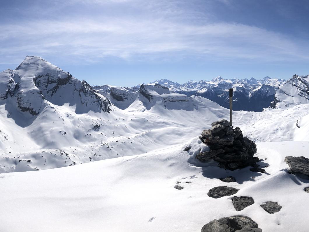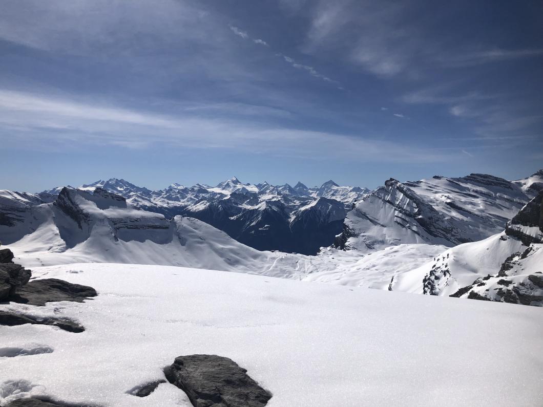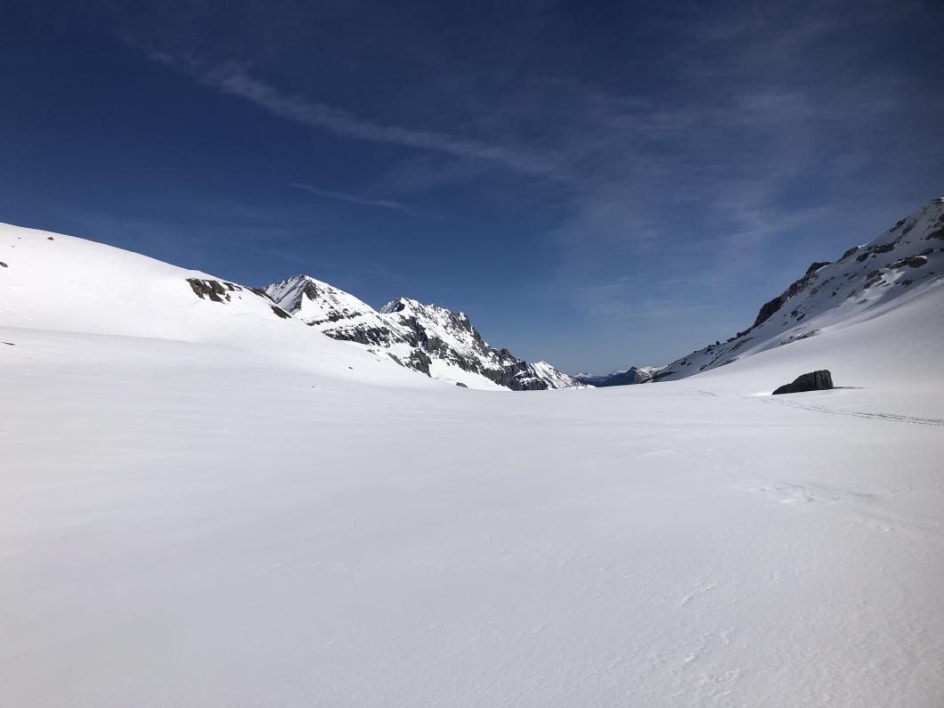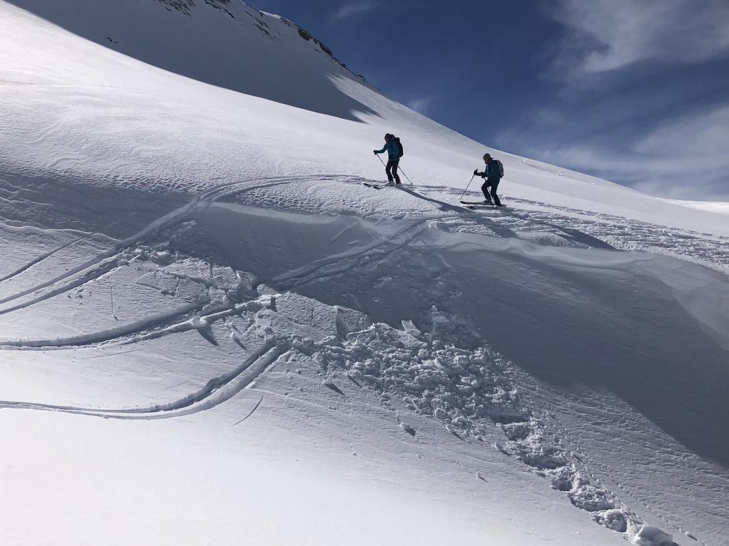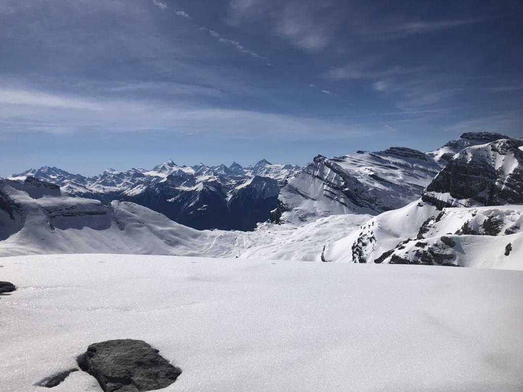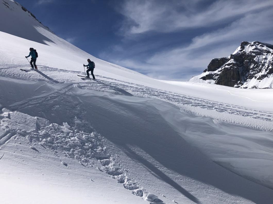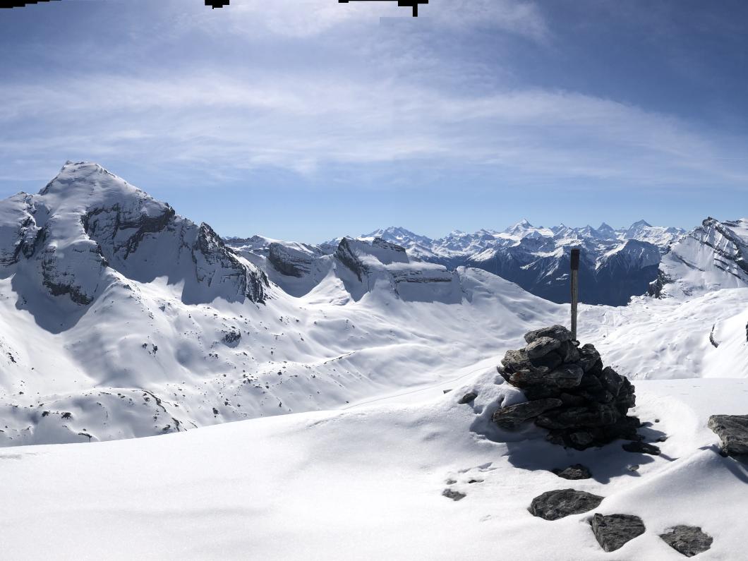 | Tourenbericht Wenn sechs SAC’ler via Chindpettipass das Felshore besteigen und davon fünf trainierte Damen vorabziehen, um die Aussicht auf die Walliser Viertausender zu geniessen, müssen dazu dreimal die Felle aufgezogen werden und im Tälli zweimal abgefahren werden. Es wurde eine einzigartige Skitour, insbesondere weil das Wetter sich von bester Seite zeigte. Um 0900 zogen wir am Dossen das erste Mal die Felle auf und stiegen über eine bestehende Spur durch Pulverschnee zügig gegen den Chinpettipass hoch. Dabei blies ein kalter Wind vom Pass hinunter. Nach einer halben Stunde oben angekommen war es windstill. Znüni? Um gehend fuhren wir über Frühjahrschnee zum Tälligletscher ab. Vom Tierhöri-Grat war vor einigen Tagen ein Schneebrett niedergegangen. Die Felle waren um 0950 ein zweites Mal montiert und in grosszügigen Bogen ging Nadia vorab. Um 1030 erreichten wir das Felshore. Znüni oder Mittagessen? Znüni mit Aussicht: Im Süden in 100km die Walliser Alpen mit Fletsch- und Lagginhorn sowie Weissmies, dann die Mischabelgruppe, vorab mit Nadelhorn und Dom, weiter mit der Monte Rosagruppe, weiter zum Zinalrothorn und Matterhorn sowie Bis- und Weisshorn. Im Südwesten der Rote Totz und der Tälligletscher, dann der Gipfelkranz der Engstligenalp, daneben über dem Chindpetipass und Albrist im Western in 100km der Jura mit Mont Tendre und neben dem Gsür der Chasseral. Wäre da nicht der Lohner. Doch auch hier die Sicht nach Norden im Dunst wieder mit Jura vom Feldberg bis Randen. Dann Nordost mit Hogant, Ärmighorn … Blümlisalp und Doldenhorn. Über dem Gasterntal (nicht sichtbar) die Bern/Walliser des Löschentals mit Gletscherhorn, Breithorn sowie Tschingelhorn. Und im Osten mächtig der Altels, das Balmhorn sowie das Rinderhorn und zu Füssen das nördliche Ufer des Gemmisees und der Gemmipass Ein bunter Strauss an Gipfel auf nur 2784m ü.M. Gemäss Führer ist das Felshore «kein markanter Gipfel, aber dank den schönen Hänge auf der NW-Seite und dem verblüffenden Blick … dennoch lohnend». Kurz nach 1100 stachen wir direkt zum Tällisee hinunter. Zuerst bogen wir zu früh ab, hier war es für die heutigen Verhältnisse aber zu steil. Die App zeigte uns den Weg. Erst östlich des Vorgipfel bei Punkt 2756 abbiegen und nördlich vom Pkt 2625 hinunter. Oben kämmten wir den Hang mit 15cm Pulver mit schönsten Schwüngen. Sonnseitig waren Ansätze zu Bruchharst, teilweise Triebschnee und Achtung ein Stein! Und ein drittes Mal Felle aufziehen, dann wurde es warm. Vom Pkt 2429 nutzte Nadine die mässig steilen Hangflächen, um in direkter östlicher Richtung - durch den mit Abfahrtsspuren verfahrenen Hang - wieder auf die Höhe des Sommerweges zu gelangen. Mit gross gewählten Abständen erreichten wir durch den nassen Schnee um 1210 wieder den Chindpettipass. Die Schlüsselstelle hatten wir zeitig gemeistert. Nun war Mittagessen angesagt, denn das Mitgebrachte schmeck zu Hause nicht mehr so gut. Die Abfahrt ca 1240 zur Engstligenalp hinunter, ging mit rasanten Schwüngen durch Pulver und unten wartete noch etwas Sulz. Was wollen wir noch mehr…? Um 1320 nahmen wir die Luftseilbahn und gelangten glücklich hinunter ins Grüne ‘Unter dem Birg’. Danke Nadine, das Felshore war mehr als lohnend! |