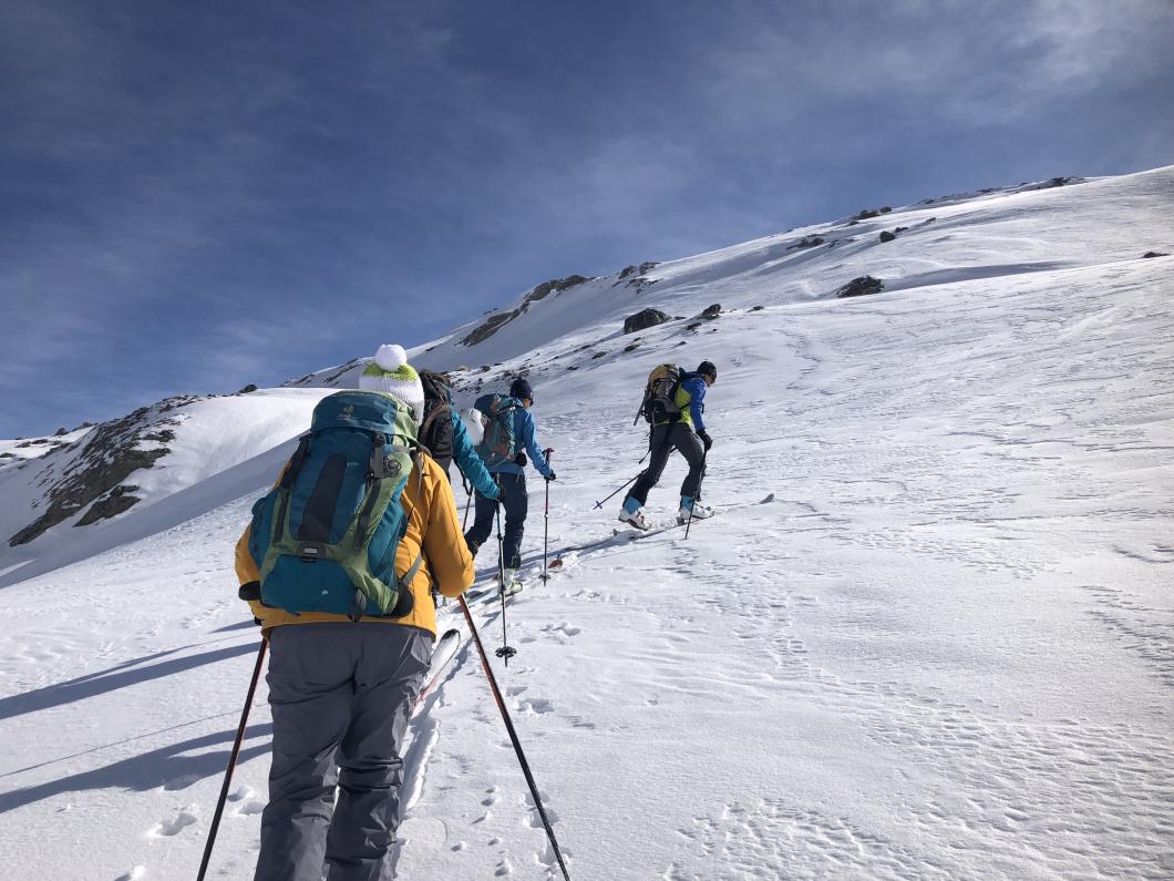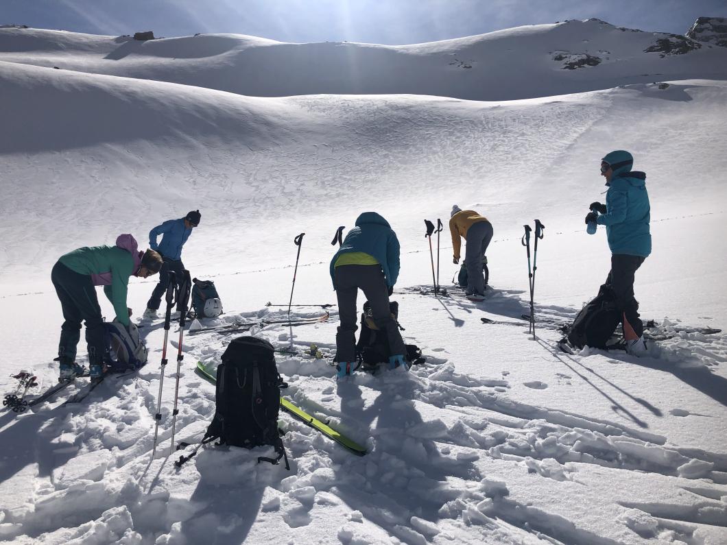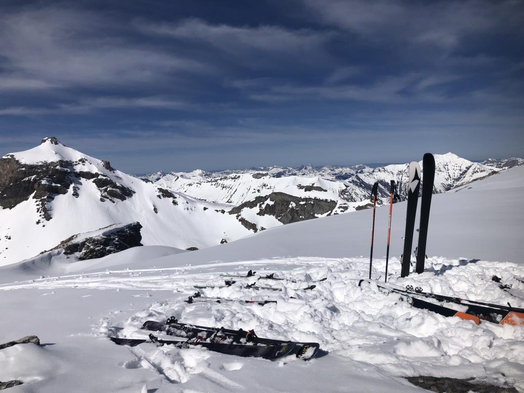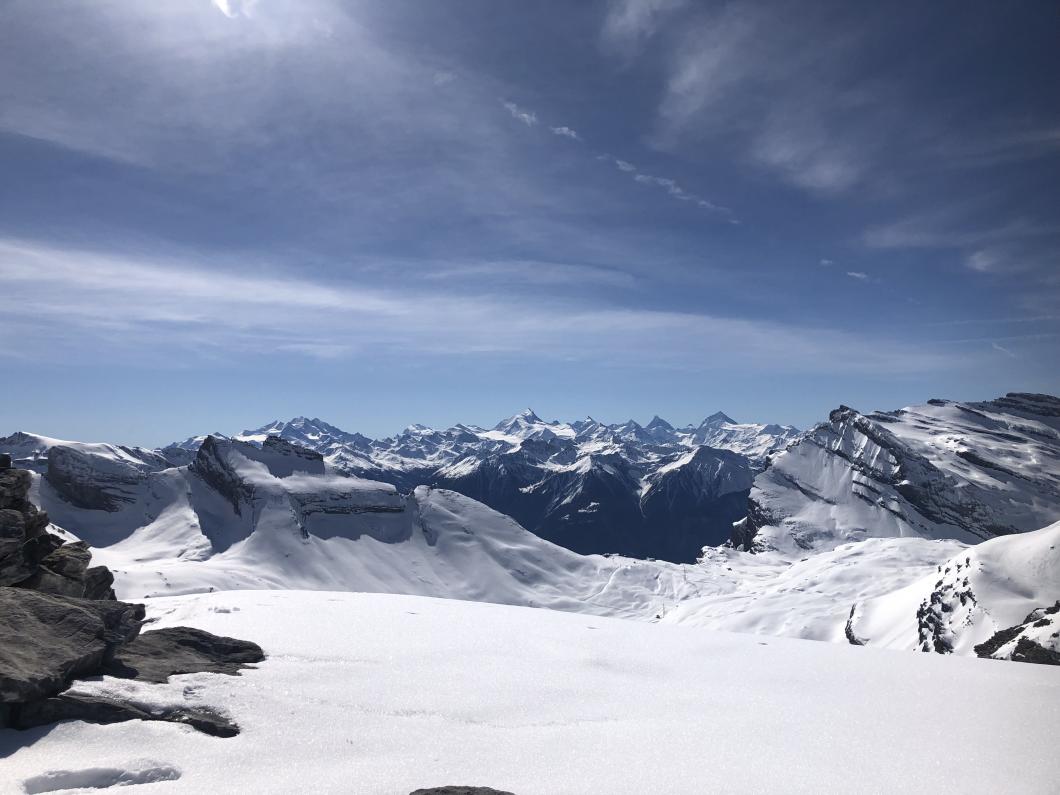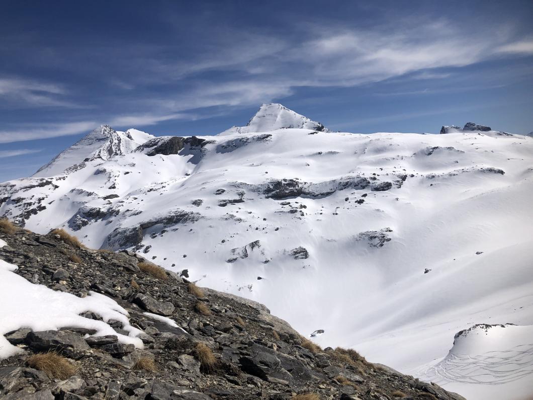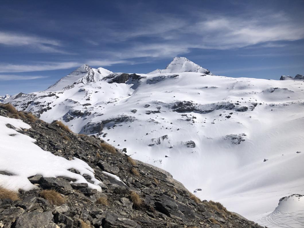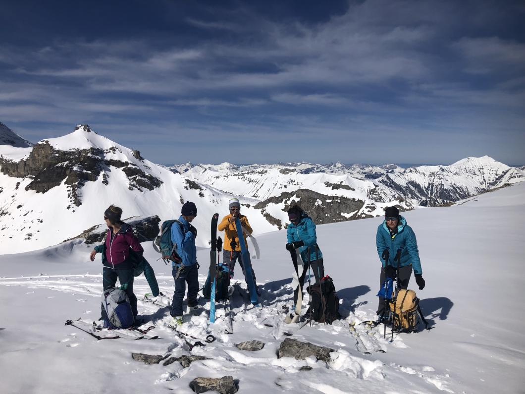 | Tourenbericht Wenn sechs SAC’ler via Chindpettipass das Felshore besteigen und davon fünf trainierte Damen vorabziehen, um die Aussicht auf die Walliser Viertausender zu geniessen, müssen dazu dreimal die Felle aufgezogen werden und im Tälli zweimal abgefahren werden. Es wurde eine einzigartige Skitour, insbesondere weil das Wetter sich von bester Seite zeigte. Um 0900 zogen wir am Dossen das erste Mal die Felle auf und stiegen über eine bestehende Spur durch Pulverschnee zügig gegen den Chinpettipass hoch. Dabei blies ein kalter Wind vom Pass hinunter. Nach einer halben Stunde oben angekommen war es windstill. Znüni? Um gehend fuhren wir über Frühjahrschnee zum Tälligletscher ab. Vom Tierhöri-Grat war vor einigen Tagen ein Schneebrett niedergegangen. Die Felle waren um 0950 ein zweites Mal montiert und in grosszügigen Bogen ging Nadia vorab. Um 1030 erreichten wir das Felshore. Znüni oder Mittagessen? Znüni mit Aussicht: Im Süden in 100km die Walliser Alpen mit Fletsch- und Lagginhorn sowie Weissmies, dann die Mischabelgruppe, vorab mit Nadelhorn und Dom, weiter mit der Monte Rosagruppe, weiter zum Zinalrothorn und Matterhorn sowie Bis- und Weisshorn. Im Südwesten der Rote Totz und der Tälligletscher, dann der Gipfelkranz der Engstligenalp, daneben über dem Chindpetipass und Albrist im Western in 100km der Jura mit Mont Tendre und neben dem Gsür der Chasseral. Wäre da nicht der Lohner. Doch auch hier die Sicht nach Norden im Dunst wieder mit Jura vom Feldberg bis Randen. Dann Nordost mit Hogant, Ärmighorn … Blümlisalp und Doldenhorn. Über dem Gasterntal (nicht sichtbar) die Bern/Walliser des Löschentals mit Gletscherhorn, Breithorn sowie Tschingelhorn. Und im Osten mächtig der Altels, das Balmhorn sowie das Rinderhorn und zu Füssen das nördliche Ufer des Gemmisees und der Gemmipass Ein bunter Strauss an Gipfel auf nur 2784m ü.M. Gemäss Führer ist das Felshore «kein markanter Gipfel, aber dank den schönen Hänge auf der NW-Seite und dem verblüffenden Blick … dennoch lohnend». Kurz nach 1100 stachen wir direkt zum Tällisee hinunter. Zuerst bogen wir zu früh ab, hier war es für die heutigen Verhältnisse aber zu steil. Die App zeigte uns den Weg. Erst östlich des Vorgipfel bei Punkt 2756 abbiegen und nördlich vom Pkt 2625 hinunter. Oben kämmten wir den Hang mit 15cm Pulver mit schönsten Schwüngen. Sonnseitig waren Ansätze zu Bruchharst, teilweise Triebschnee und Achtung ein Stein! Und ein drittes Mal Felle aufziehen, dann wurde es warm. Vom Pkt 2429 nutzte Nadine die mässig steilen Hangflächen, um in direkter östlicher Richtung - durch den mit Abfahrtsspuren verfahrenen Hang - wieder auf die Höhe des Sommerweges zu gelangen. Mit gross gewählten Abständen erreichten wir durch den nassen Schnee um 1210 wieder den Chindpettipass. Die Schlüsselstelle hatten wir zeitig gemeistert. Nun war Mittagessen angesagt, denn das Mitgebrachte schmeck zu Hause nicht mehr so gut. Die Abfahrt ca 1240 zur Engstligenalp hinunter, ging mit rasanten Schwüngen durch Pulver und unten wartete noch etwas Sulz. Was wollen wir noch mehr…? Um 1320 nahmen wir die Luftseilbahn und gelangten glücklich hinunter ins Grüne ‘Unter dem Birg’. Danke Nadine, das Felshore war mehr als lohnend! |