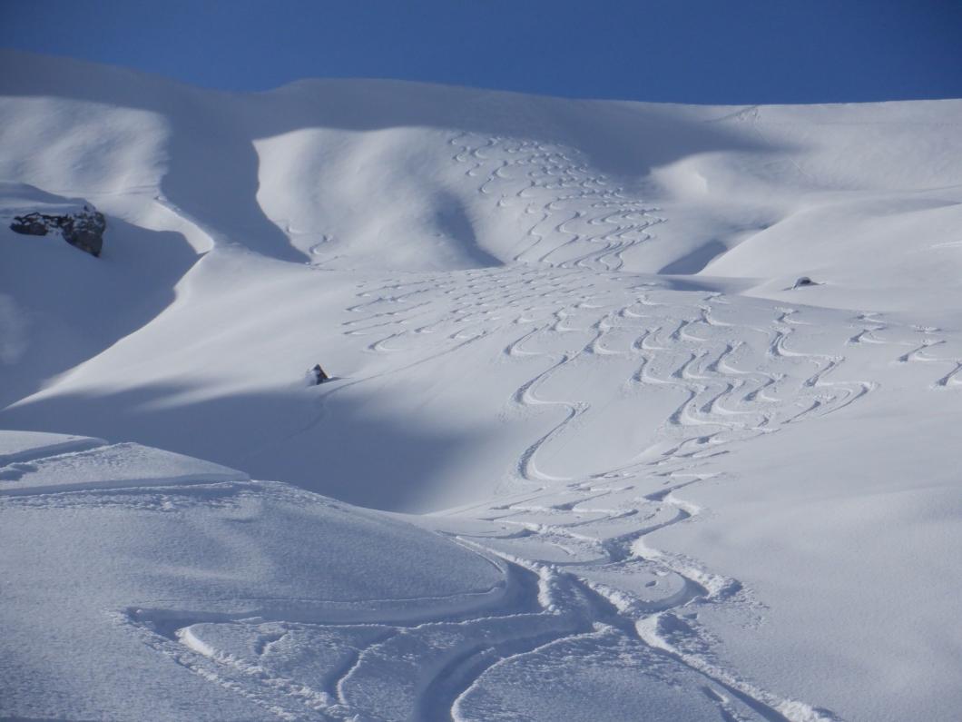 | Tourenbericht Bereits 3 Tage vor der Tour sind wir ein erstes Mal gefordert: Patrick bittet uns um eine Selbsteinschätzung in Bezug auf die Anforderungen der Tour aufs Gsür. Wir sehen: der neue Tourenleiter kommuniziert klar und bereitet sich seriös vor! Doch schlussendlich entscheiden weder Kondition noch Spitzkehrtechnik über Gsür/Landvogtehore oder nicht, sondern die Lawinensituation. Der arme Chistihubel. Er wäre doch so gerne DAS Traum-Gipfelziel aller Skitourengeher. Stattdessen fristet er ein Dasein als Alternativroute. Der Chistihubel ist allzeit bereit zum Einspringen, wenn sich andernorts Wetter oder Verhältnisse nicht wie gewünscht präsentieren. Entsprechend ist am Chistihubel auch meistens viel los. So auch heute. Dank Patricks Zeitplan sind wir angenehmerweise vor vielen anderen auf dem "Hubel" und können nach dem gestrigen Neuschnee unsere Kurven in noch unverspurte Hänge ziehen. Diese Vergnügen macht definitiv Appetit auf mehr! Ab Dünde-Mittelberg gönnen wir uns daher einen weiteren Aufstieg bis hinauf auf ca. 2300m auf der Route zum Bundstock. Von dort geniessen wir nochmals schneestiebende Abfahrten über schöne Hänge. Obwohl dieser zweite Aufstieg einige von uns gefordert hat, sind wir uns doch einig: es hat sich allemal gelohnt! Rasch sind wir unten auf der Griesalp und zurück beim Ausgangspunkt im Tschingel. Der wohlverdiente Kaffee mit Kuchen gibts in der Alpenruhe. Vielen Dank Patrick für die Tour. Wir freuen uns auf ein nächstes Mal! Bericht: Monika Schranz |