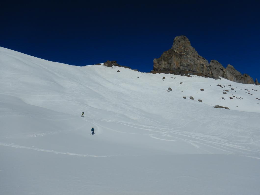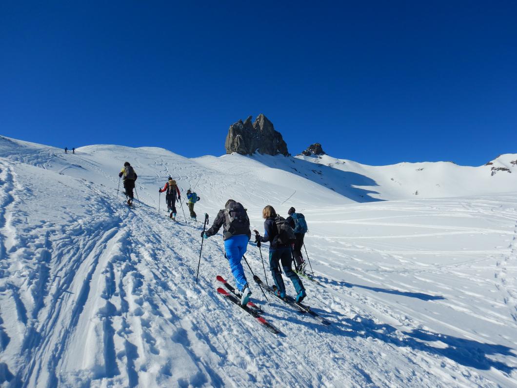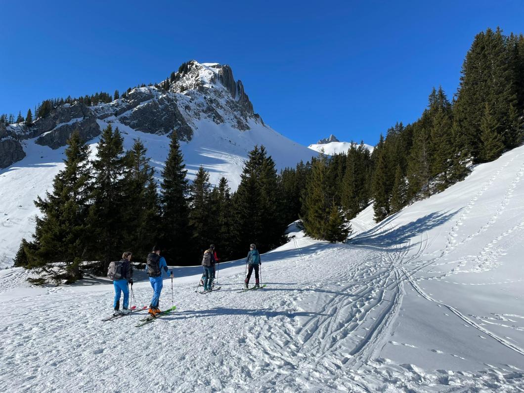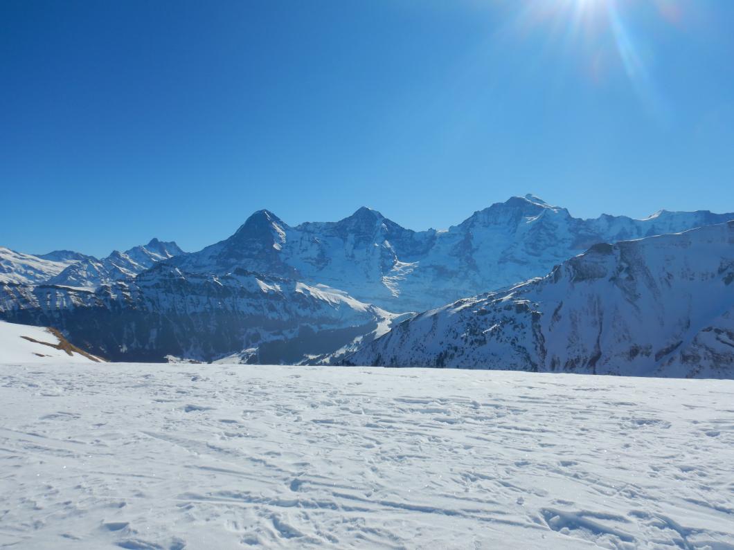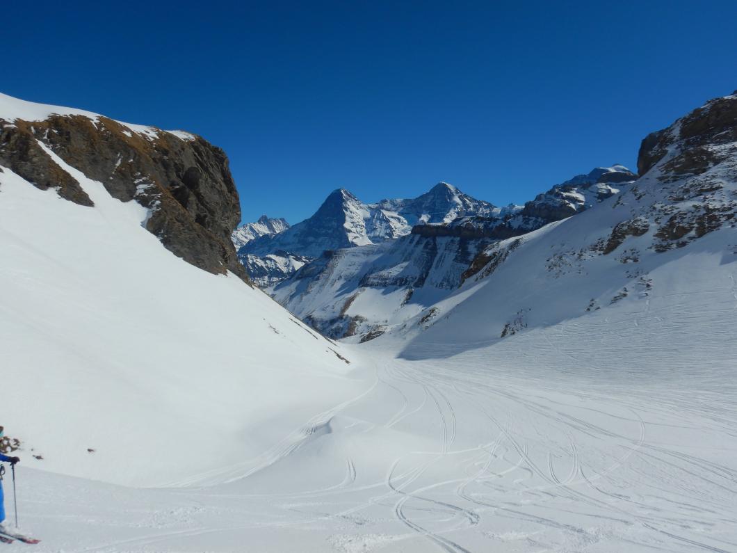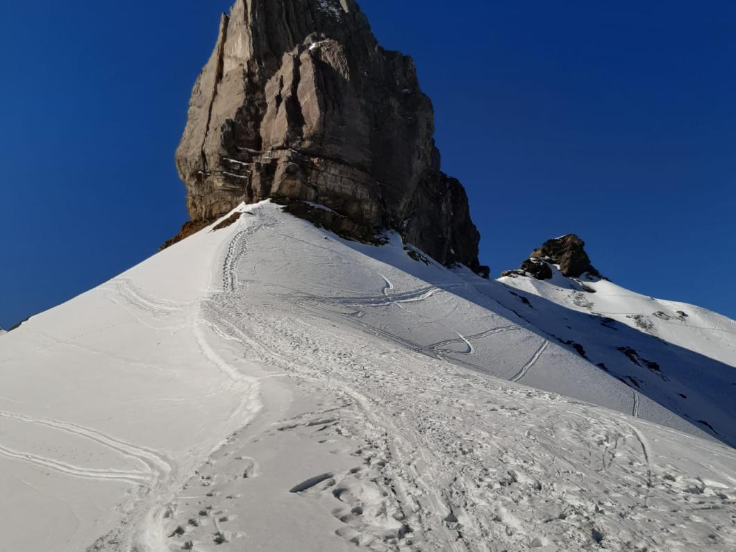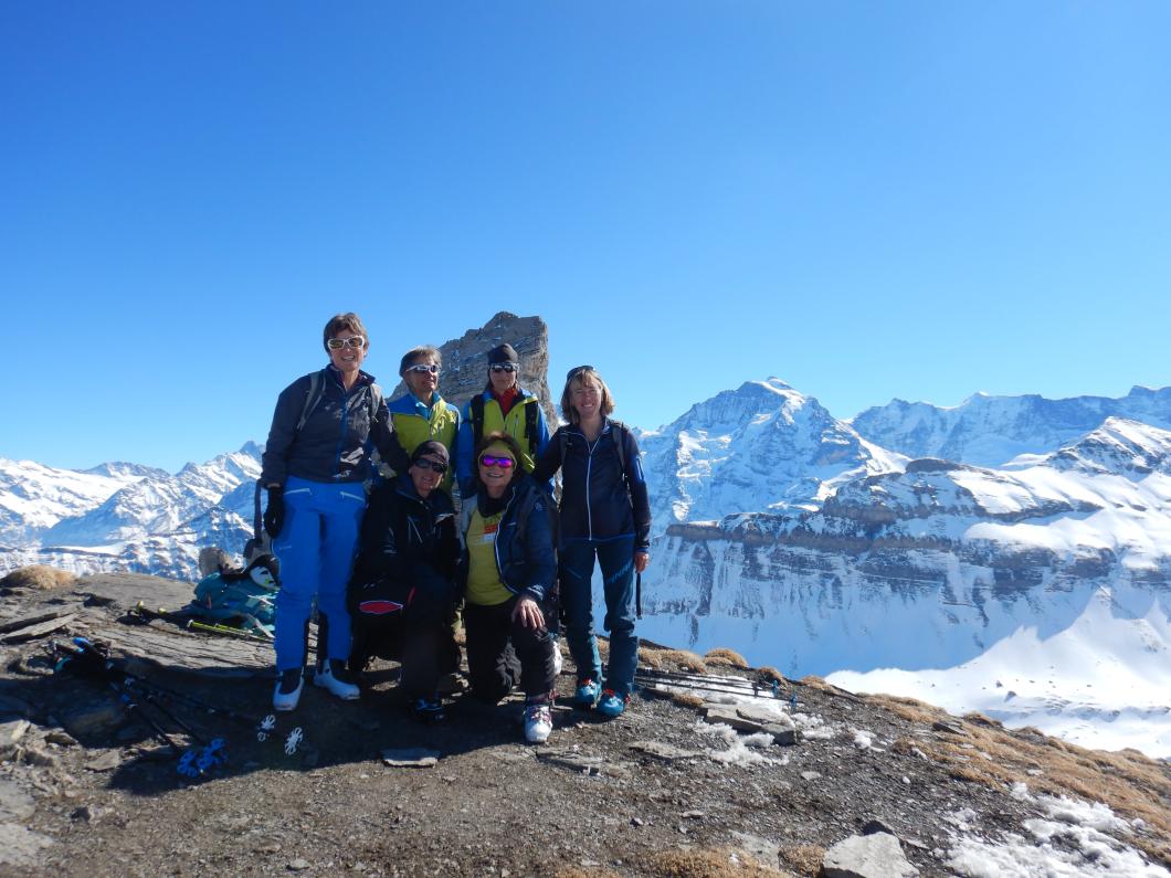 Von Isenfluh fuhren wir sieben mit einer extra-Luftseilbahn rasch an die wärmende Sonne nach Suldwald hinauf. Nadia führte uns zügig den Bergweg durch den Wald nach Suls hoch. Die Lobhornhütte liessen wir rechts liegen und stiegen übers Grätli zur Soulsegg auf. Dann ein Aahh.. als das majestätische Dreigestirn erschien. Der Aufschwung zum Schwarze Schopf war bald überwunden. Mit Harscheisen ging es noch um das Grosse Lobhorn herum und nach drei Stunden standen wir auf dem Chlyne Lobhorn. Wir genossen bei angenehmen Temperaturen die Aussicht ins Mittelland, Emmental, Brienzergrat, in die Urner und Berner und Freiburger-Alpen sowie Niesen- und Gantrisch-Kette – der Jura war im Dunst. Nach dem Lunch war der Sulz angerichtet und wir stachen ins Soustal hinunter. Leider waren die Nordhänge nicht dasselbe Abfahrtsvergnügen. Dann ging es durchs Soustal hinaus und rasant durch die Alpstrasse nach Isenfluh hinunter. Beim Einkehrschwung liessen wir die heutige und ältere gemeinsame Erlebnisse Revue passieren. Merci Nadia für das Organisieren und Führen, wir durften einen herrlichen Skitourentag in unserer eindrucksvollen Bergewelt erleben.