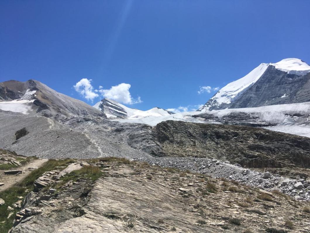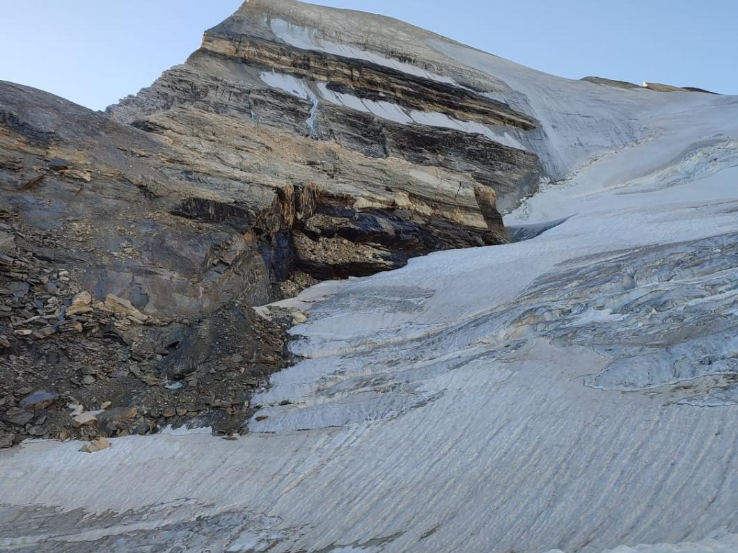 | Tourenbericht Mitten in der Hauptferienzeit stehen auch wir rund zwei Stunden in der Kolonne zum Autoverlad in Kandersteg. Die Wartezeit verkürzen wir uns mit Glace schlecken. Dank der Glace ist es dann auch nicht so schlimm, dass der Kuchen in der Turtmannhütte bei unserer Ankunft bereits ausverkauft ist. Nach einer kurzen Repetition der Seilhandhabung und einem stärkenden Znacht gehts früh zu Bett. Am Morgen starten wir um 4 Uhr. Der Supervollmond vom 13. Juli leuchtet uns auch heute noch den Weg. Bereits um 4:30 Uhr ist es schon warm genug, um auf über 2500m im T-Shirt zu laufen. Während wir auf dem Brunegggletscher unterwegs sind, geht die Sonne am Bishorn auf. Als der Gletscher steiler wird, zeigen sich erste ausgeaperte Stellen. Wir suchen uns den besten Weg auf die Felsen bis zum Punkt 3671. Von hier betrachten wir das im Schatten liegende Firnfeld des Brunegghorns. Es stellt sich später als weniger steil heraus als es von hier aussieht. Um 9:30 Uhr erreichen wir den Gipfel. Wir sind die Einzigen und geniessen die tolle Aussicht auf Walliser und Berner Alpen. Zurück bei der Hütte erfahren wir vom Hüttenteam zwei Dinge: die Tour aufs Brunegghorn wird kaum gemacht und Kuchen hat es auch heute keinen mehr… Beides für uns völlig unverständlich ;-) Danke Yvonne, dass Du mit uns diese anscheinend selten begangene Tour gewagt hast. |