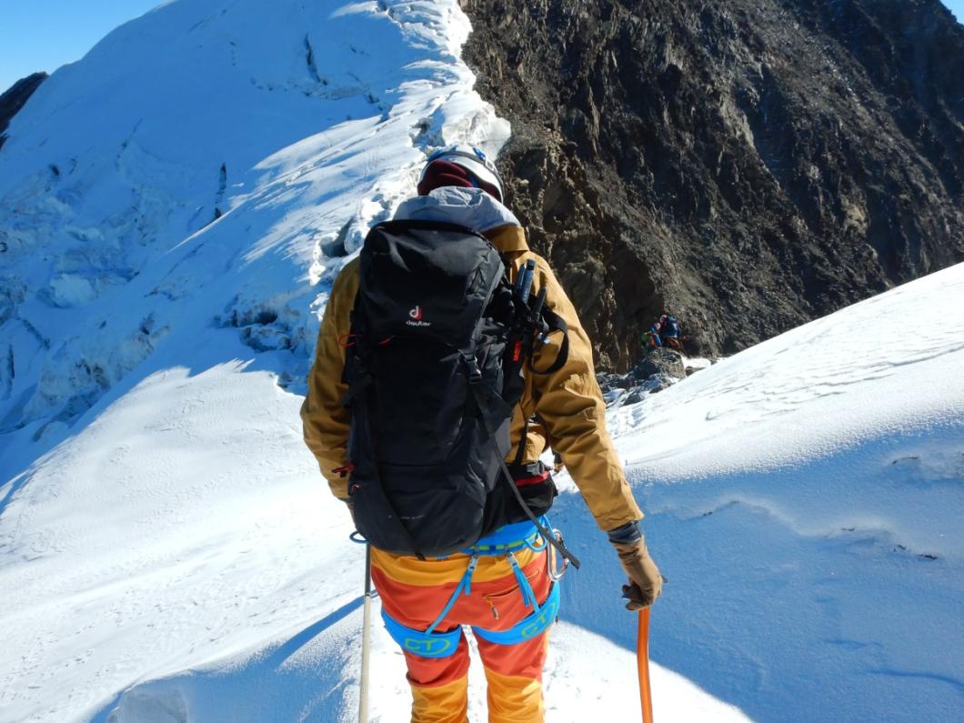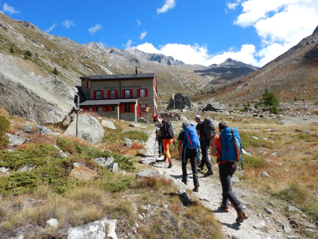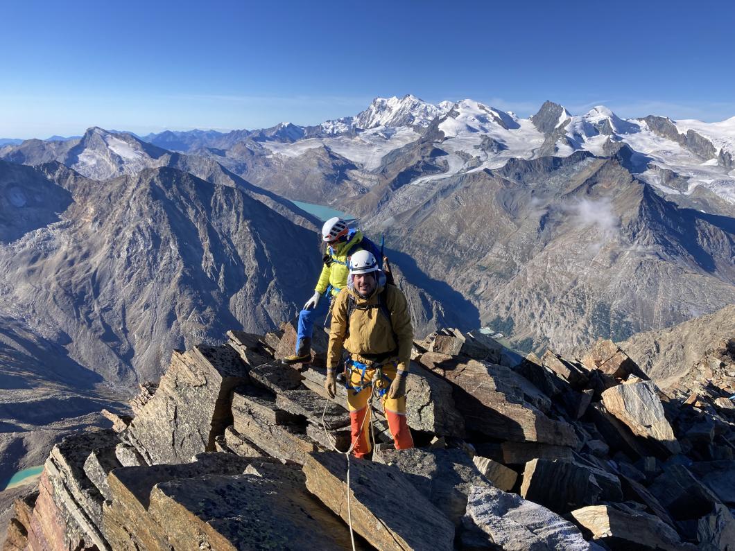 | Tourenbericht Am Samstag gegen Mittag und bei wunderbarem Wetter macht sich die siebenköpfige Truppe auf den Weg von Saas Almagell hoch auf die Almageller Hütte SAC. Nach einem kurzen Aufstieg durch den wunderschönen Pinienwald, erreichen wir das Platau der Almageller-Alp. Wir stärken uns und reservieren im Restaurant der Hütte sieben Stücke Früchtekuchen für den Abstieg am Sonntag – dieser soll ein Geheimtipp sein (laut Haueter!). Über einen wunderschönen Aufstieg erreichen wir zeitig unser Tagesziel und geniessen zusammen den Abend bevor es heisst Lichterlöschen! Um 4:45 werden wir unsanft – so wie es sich gehört – aus den Federn geholt. Aus dem Schlaf geweckt, wäre an meiner Stelle gelogen, denn diesen finde ich in der ganzen Nacht nur sehr selten. Nach dem Frühstück packen wir unsere sieben Sachen und begeben uns unter hellem Mond- und Stirnlampenlicht auf den Pfad in Richtung Rotgrad. Der Weg beginnt gleich mit einem Fels-Block Abschnitt, womit ein friedliches Vor-sich-hin-dösen ausgeschlossen ist. Gibt es was Schöneres, um in den Morgen zu starten? Wohl eher nicht… Gut aufgewärmt erreichen wir nach kurzer Zeit die Schlüssel-Stelle, welche eine kurze Kletterei (3) hoch zum Rotgrad beinhaltet. Ruckzuck befinden wir uns auf dem Namensgeber der Route und erklimmen Stück für Stück den roten Rücken des Weissmies. Das Wetter ist kaiserlich, kein Wölkchen weit und breit und die Sicht ist glasklar. Die Aussicht ist atemberaubend. Immer weiter dem Grad empor gelangen wir zum weissen Zuckerhut des Gipfels. Nun heisst es Pickel hervor und Eisen montieren. Als Stadtmensch, welcher ich nun mal bin, macht sich die Höhe langsam bemerkbar und das Atmen fällt mir nicht mehr ganz so leicht. Ein Schritt nach dem anderen lässt mich und die Gruppe dem Gipfel immer näher kommen und meinen inneren Schweinehund überwinden. Wie aus dem nichts, sind wir dann auf einmal auf dem Gipfel. Ein solches Erlebnis mit tollen Menschen, wunderschöner Landschaft und hammer Wetter. Genüsslich verzehre ich mein Essen und sammle Energie für den Abstieg. Da der Weg über die Schneefläche in Richtung Saas-Grund leider nicht passierbar ist, müssen wir über die Normalroute zurück zur SAC-Hütte absteigen. Nach einer kurzen Pause in selbiger, beginnt die Wanderung hinab auf die Almagelleralp. Tatsächlich hat die Reservierung der Kuchen geklappt und wir geniessen die Stücke – wohlbemerkt ohne Rahmtopping – mit einem grossen Glas Rivella. Hat ein Kuchen schon mal besser geschmeckt? Wohl eher nicht… Ich gebe zu, nun wäre ich gerne bereits unten, doch es liegt noch eine gute Stunde Wanderung hinab nach Almagell vor uns. Auch diese meistern wir stoisch. Überglücklich und müde kommen wir an diesem Abend in Almagell an. Alle gesund und heil. Ich war noch nie so dermassen KO und überglücklich zugleich. Vielen Dank euch 6 Gspänli - es war der Hammer! Euer Basler-Läggerli Bericht: Beat Schwald |