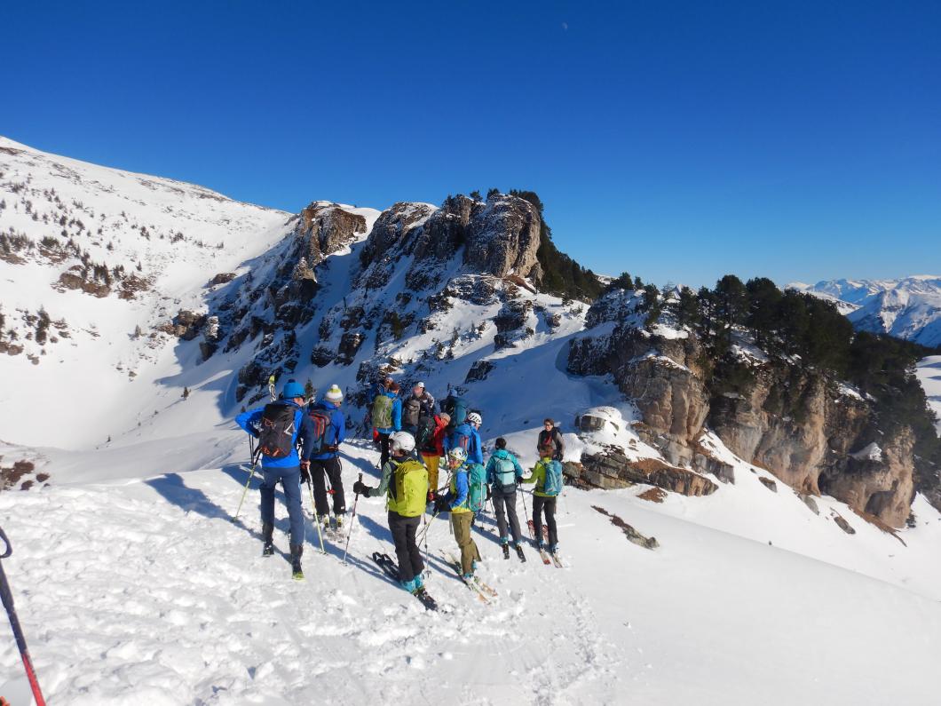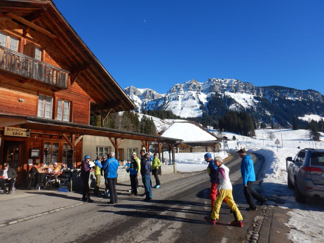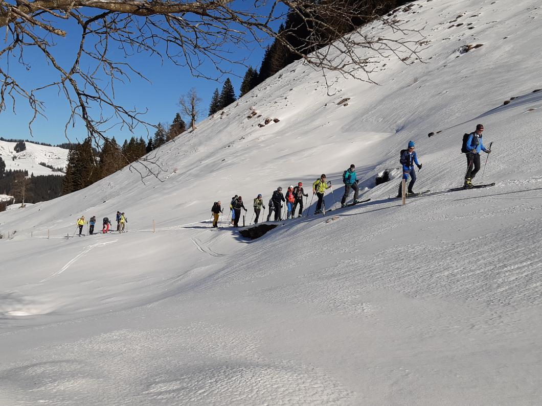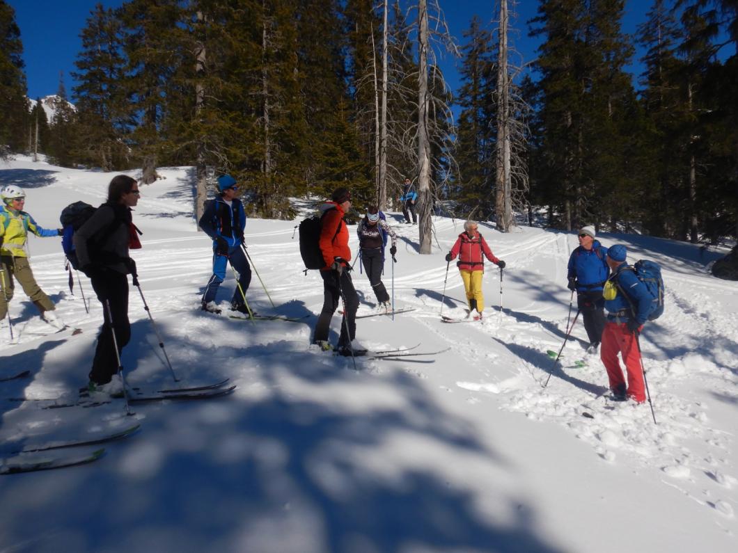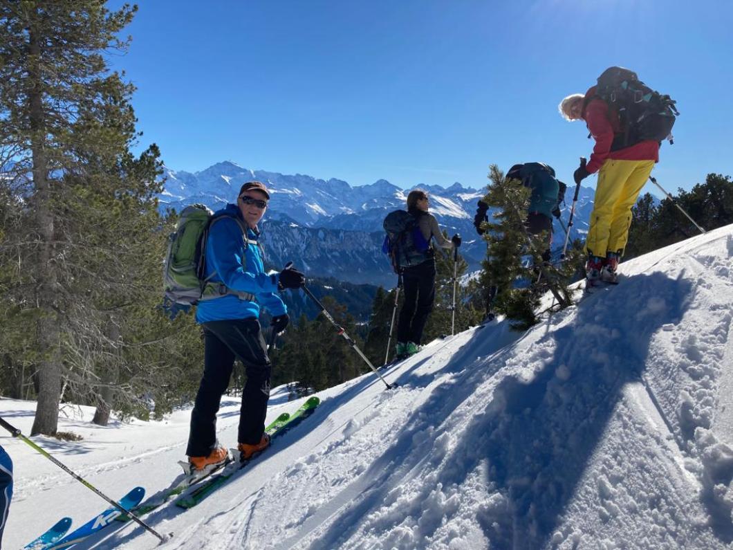 | Tourenbericht Ruedi lud ein zu seiner Mittwoch-Tour und die SAC-ler kamen in Scharen... was für ein Traumtag stand uns bevor. Um 9.30 Uhr starteten wir beim Parkplatz im Inner-Eriz. Fröhlich und mit guter Laune schritten wir Richtung Grünenbergpass voran. Die Temperatur stieg zusehends an, so dass wir mit einigen "Tschogglä" an den Fellen zu kämpfen hatten. Wie wird da wohl die Abfahrt werden? Die Bäume lichteten sich und wir konnten den Gipfel bereits sehen. Ein Skidepot musste errichtet werden und über eine Leiter stiegen wir zu Fuss nach ganz oben. Wow, was für eine Fernsicht! Die Abfahrt führte uns auf derselben Strecke zurück. Wir fetzten durch den Wald hinunter, welch ein Spass! Die Schneeverhältnisse entpuppten sich deutlich besser als befürchtet. Bei einem kühlen Bier durften wir den wunderbaren Tag ausklingen lassen. Danke Ruedi. Bericht: Evelyne Allenbach |