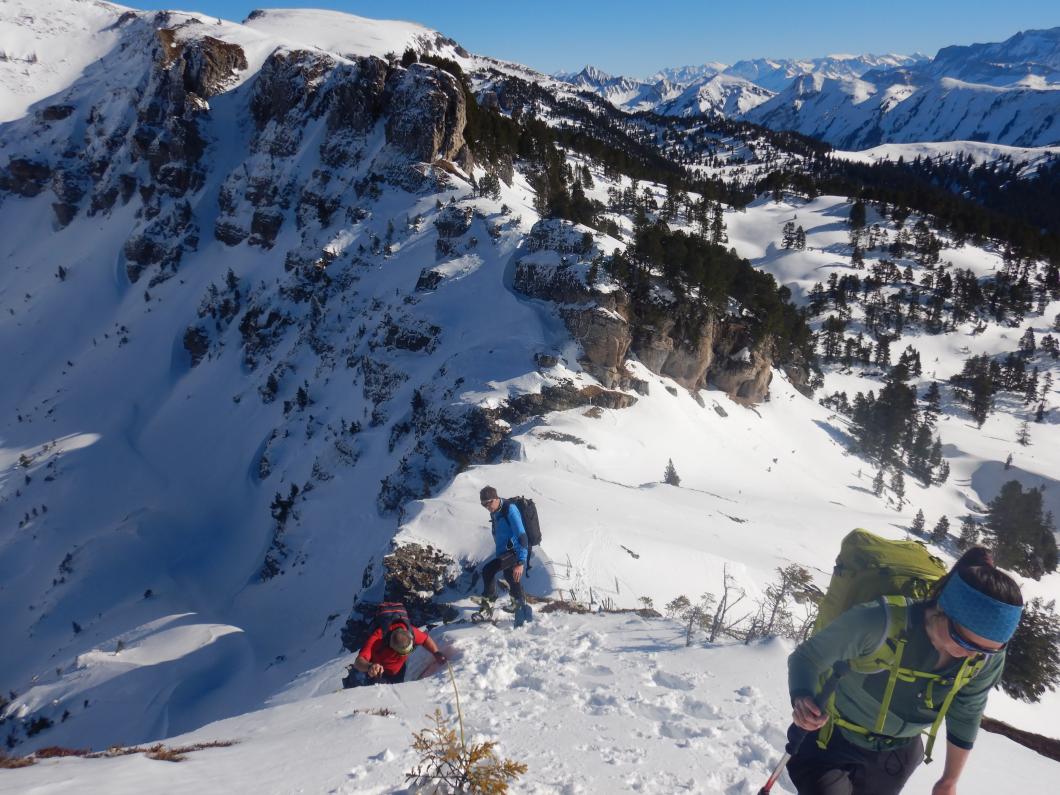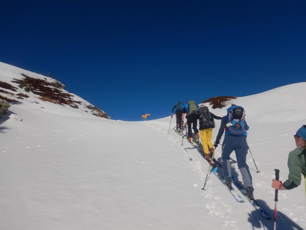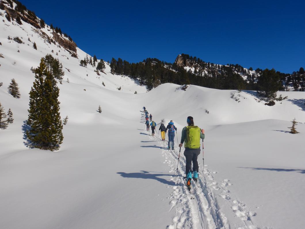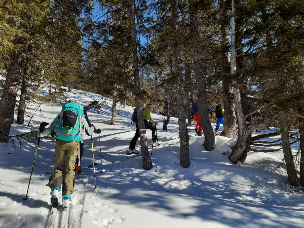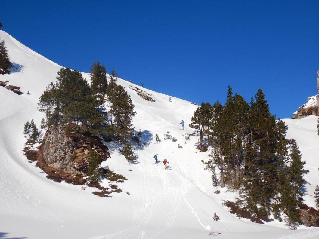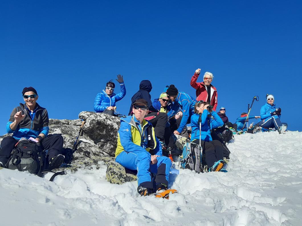 | Tourenbericht Ruedi lud ein zu seiner Mittwoch-Tour und die SAC-ler kamen in Scharen... was für ein Traumtag stand uns bevor. Um 9.30 Uhr starteten wir beim Parkplatz im Inner-Eriz. Fröhlich und mit guter Laune schritten wir Richtung Grünenbergpass voran. Die Temperatur stieg zusehends an, so dass wir mit einigen "Tschogglä" an den Fellen zu kämpfen hatten. Wie wird da wohl die Abfahrt werden? Die Bäume lichteten sich und wir konnten den Gipfel bereits sehen. Ein Skidepot musste errichtet werden und über eine Leiter stiegen wir zu Fuss nach ganz oben. Wow, was für eine Fernsicht! Die Abfahrt führte uns auf derselben Strecke zurück. Wir fetzten durch den Wald hinunter, welch ein Spass! Die Schneeverhältnisse entpuppten sich deutlich besser als befürchtet. Bei einem kühlen Bier durften wir den wunderbaren Tag ausklingen lassen. Danke Ruedi. Bericht: Evelyne Allenbach |