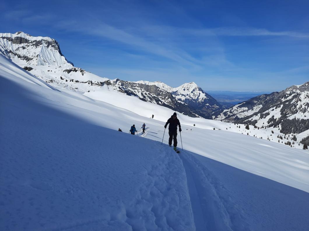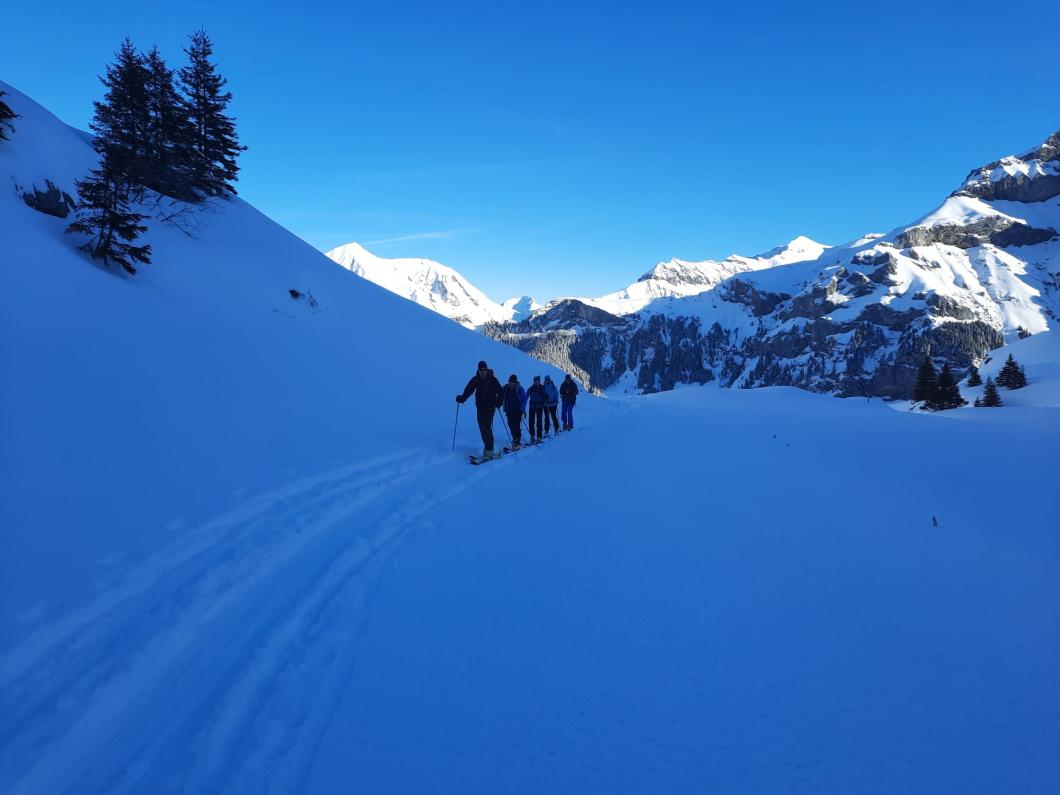 | Tourenbericht Bereits 3 Tage vor der Tour sind wir ein erstes Mal gefordert: Patrick bittet uns um eine Selbsteinschätzung in Bezug auf die Anforderungen der Tour aufs Gsür. Wir sehen: der neue Tourenleiter kommuniziert klar und bereitet sich seriös vor! Doch schlussendlich entscheiden weder Kondition noch Spitzkehrtechnik über Gsür/Landvogtehore oder nicht, sondern die Lawinensituation. Der arme Chistihubel. Er wäre doch so gerne DAS Traum-Gipfelziel aller Skitourengeher. Stattdessen fristet er ein Dasein als Alternativroute. Der Chistihubel ist allzeit bereit zum Einspringen, wenn sich andernorts Wetter oder Verhältnisse nicht wie gewünscht präsentieren. Entsprechend ist am Chistihubel auch meistens viel los. So auch heute. Dank Patricks Zeitplan sind wir angenehmerweise vor vielen anderen auf dem "Hubel" und können nach dem gestrigen Neuschnee unsere Kurven in noch unverspurte Hänge ziehen. Diese Vergnügen macht definitiv Appetit auf mehr! Ab Dünde-Mittelberg gönnen wir uns daher einen weiteren Aufstieg bis hinauf auf ca. 2300m auf der Route zum Bundstock. Von dort geniessen wir nochmals schneestiebende Abfahrten über schöne Hänge. Obwohl dieser zweite Aufstieg einige von uns gefordert hat, sind wir uns doch einig: es hat sich allemal gelohnt! Rasch sind wir unten auf der Griesalp und zurück beim Ausgangspunkt im Tschingel. Der wohlverdiente Kaffee mit Kuchen gibts in der Alpenruhe. Vielen Dank Patrick für die Tour. Wir freuen uns auf ein nächstes Mal! Bericht: Monika Schranz |