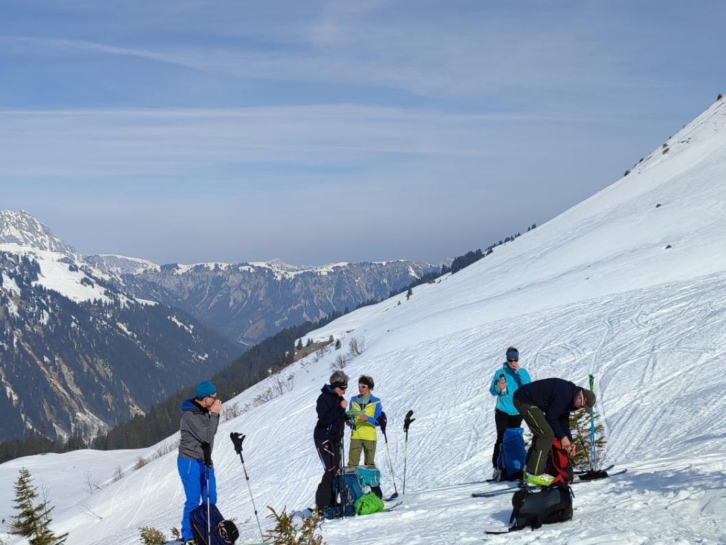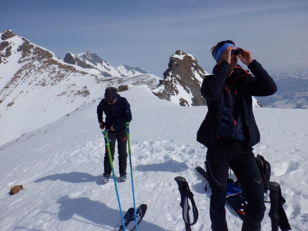 | Tourenbericht Aufgrund der Wetterprognose (Föhn, Staulage im Süden) treffen wir uns mit Tourenleiterin Yvonne Appenzeller im Diemtigtal statt im Goms. Beim Start im Fieldrich kommen wir uns vor wie auf einer extra für Tourenskiläufer präparierten Piste. Unzählige Spuren führen vom und zum Parkplatz. Auch im Gelände weiter oben hat es überall Abfahrtsspuren. Wir lassen uns davon nicht stören und geniessen die Landschaft oder das meditative Laufen. Zu unserer Verwunderung sind heute verhältnismässig wenig Tourengeher unterwegs. Jedenfalls müssen wir unser Tourenziel, den “Wintergipfel” des Bodezehore, mit niemanden teilen. Kaum angekommen fallen uns zwei grosse Greifvögel auf, die sich Richtung Bodezehore schwingen und über unsere Köpfe hinweg Richtung Gsür davon gleiten. Der Blick von Yvonne durch den Feldstecher bestätigt, dass es sich um Bartgeier handelt. Was für ein Spektakel! Die Abfahrt ist wie erwartet nicht das grosse Pulverschneeerlebnis. Dafür gibt es ein paar schöne Kurven im Sulz und der Rest ist auch “fahrbar”. Danke Yvonne für die flexible Planung und die zufriedene Tour. |
