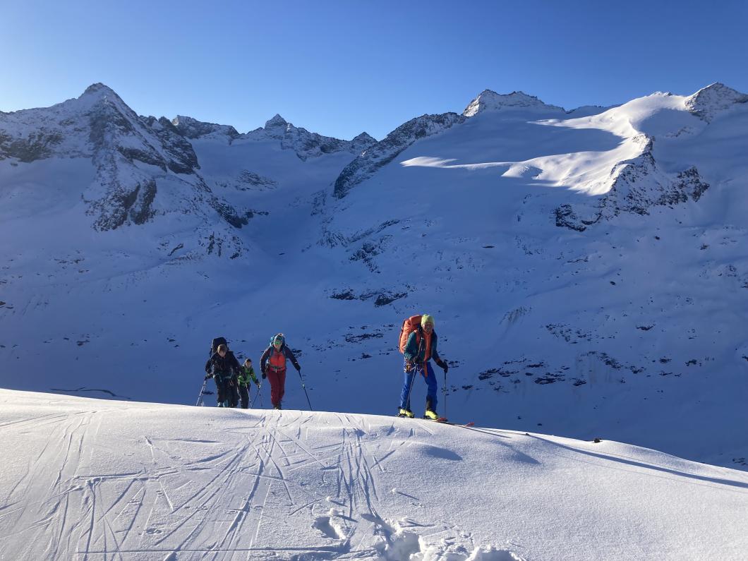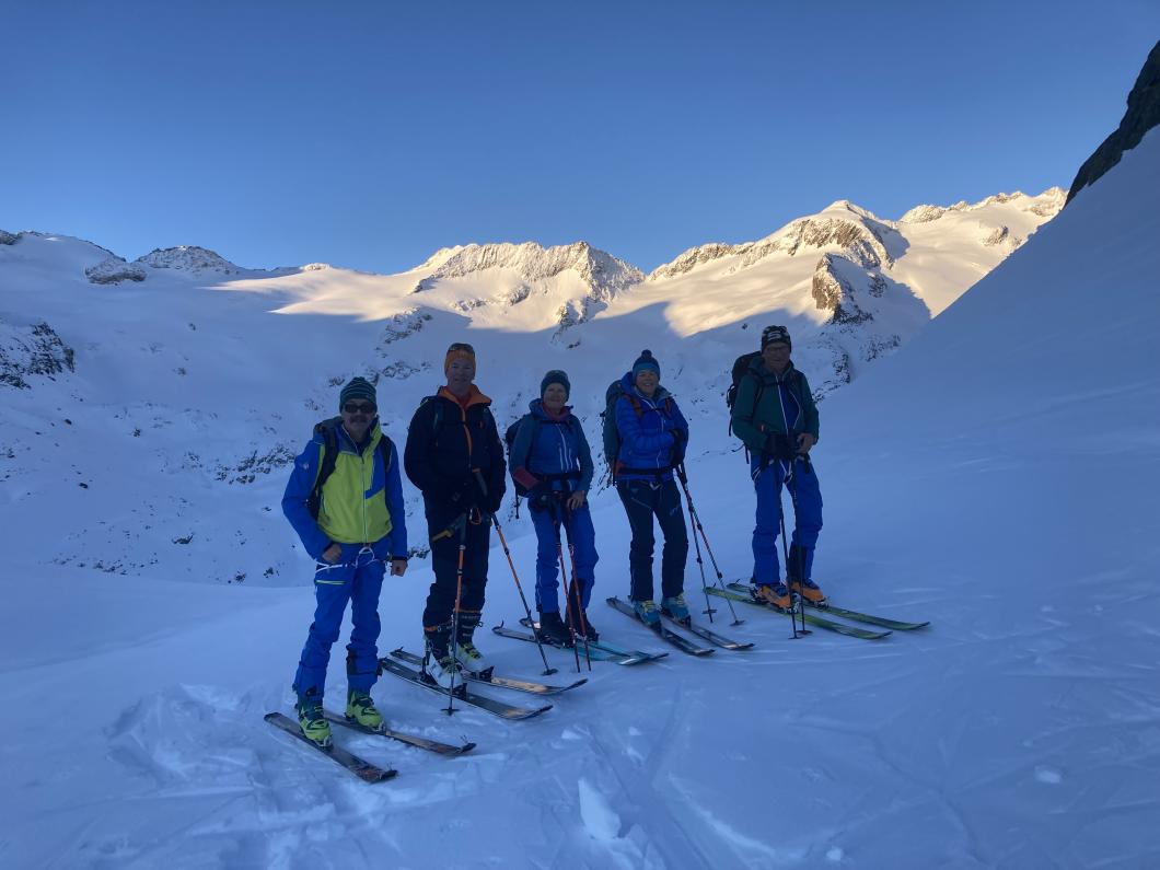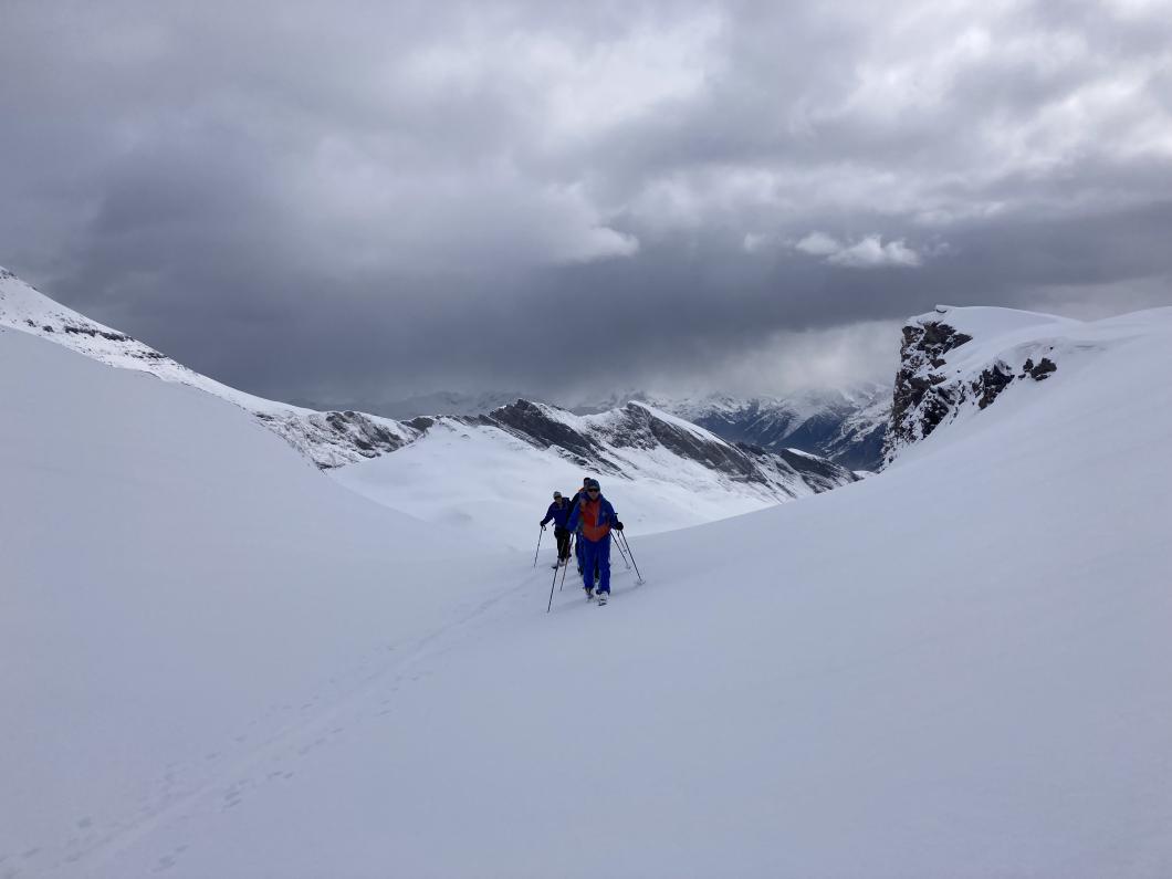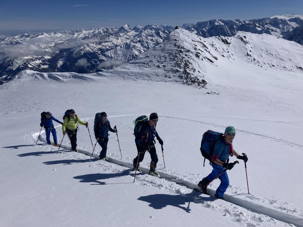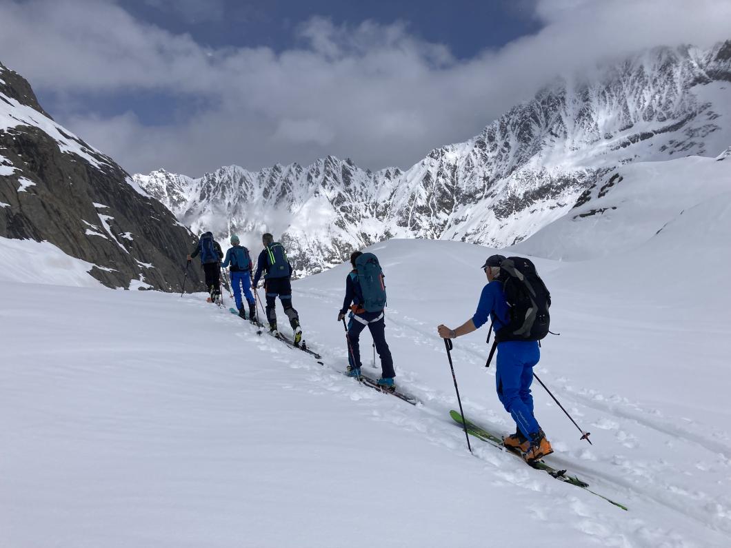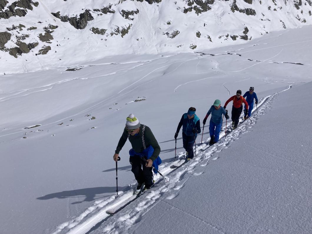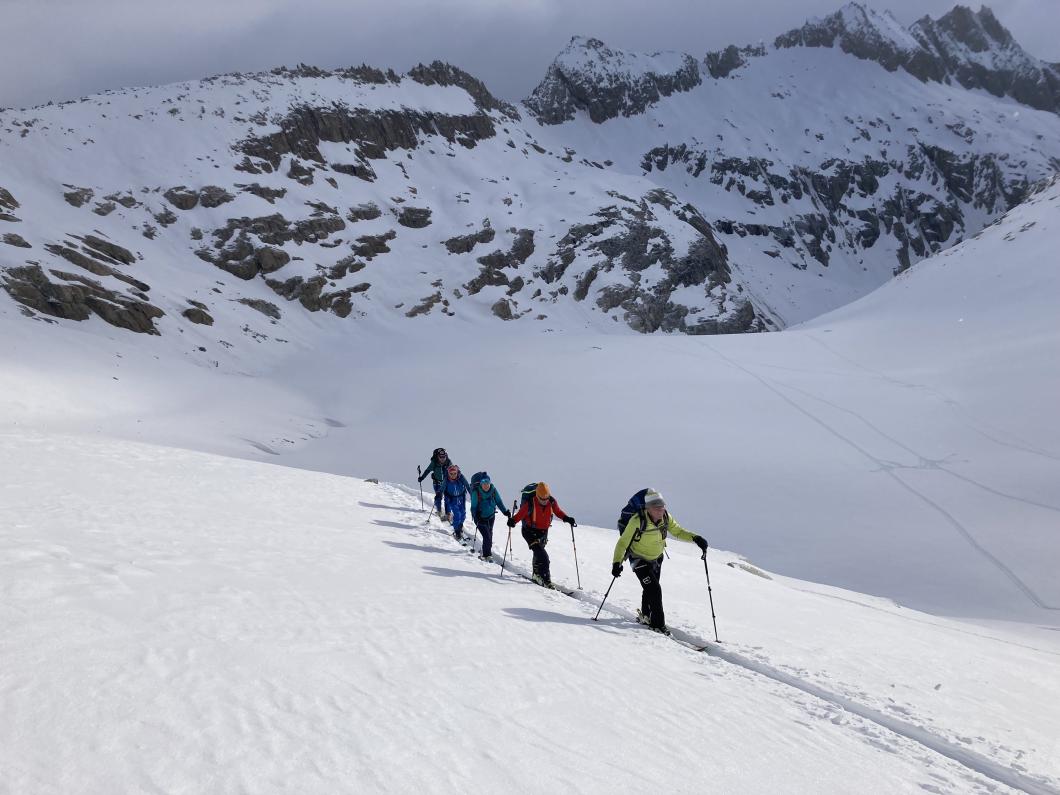 | Tourenbericht Nach durchzogenem Wetterbericht reisten wir am Montag Richtung Meiringen um dort mit dem Taxi in die Handegg zu fahren. Die Gondelbahn zog uns, von dort, in drei Fahrten hinauf zum Räterichsboden-Stasusee. Von dort erfolgte der Aufstieg in die Bächlital-Hütte. Da wunderbares Wetter herrschte entschlossen wir uns, bevor wir definitiv zur Hütte aufstiegen, die Pulverhänge unter dem Brünberg zu geniessen und dies gleich zweimal. Am nächsten Tag stiegen wir bei etwas schlechterem Wetter über die Obere Bächlilücke in die Gauli-Hütte. Leider konnten wir auf Grund des Nebels das vorgesehene Hubelhorn nicht besteigen. In der Hütte spendierte uns Sami und Manfred ein Apero, welches von der Hüttencrew zubereitet wurde. Da der Wetterbericht für Donnerstag einen Wetterwechsel mit viel Wind und Schneefall ankündigte, entschlossen wir uns das Gauli am Mittwoch über das Ränftenhorn, Richtung Rosenlaui, schon wieder zu verlassen. Bei wunderschönem Wetter stiegen wir am nächsten Tag über den Gauligletscher, vorbei am Flugzeugwrack der Dakota, hinauf zum Ränftenhorn. Die grandiose Abfahrt hinunter ins Rosenlaui war lang, anstrengend aber sehr imposant. Im Tal angekommen stiegen wir auf zur Broch-Hütte, wo wir unseren Durst und Hunger stillten. Schon bald begann es zu winden und kurz darauf kam der angekündigte Regen. Nach dem Nachtessen (Gschwellti u Raclette) studierten wir den Wetterbericht für den nächsten Tag. Wir entschlossen uns, in der angekündigten Regenpause, mit einer Gruppe Richtung Schwarzhorn aufzubrechen. Tatsächlich ermöglichte uns dieses Fenster am nächsten Tag dieses Vorhaben. Ein Teil der Gruppe blieb zurück in der Hütte, übte sich in der Seiltechnik bei Selbstaufstieg und Spaltenrettung. Nach der Rückkehr jener Leute, die noch auf den Skiern waren, gabs nochmals etwas zu Essen in der Hütte. Nach einer kurzen Theorie, (Tourenvorbereitung mit elektronischen Hilfsmitteln) endete die um einen Tag verkürzte Tourenwoche. Herzlichen Dank an Sami und Manfred, welche uns kompetent durch diese grandiose Landschaft führten! |