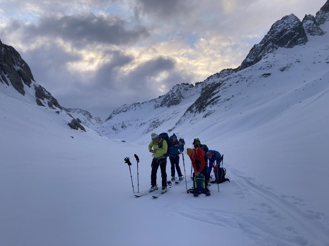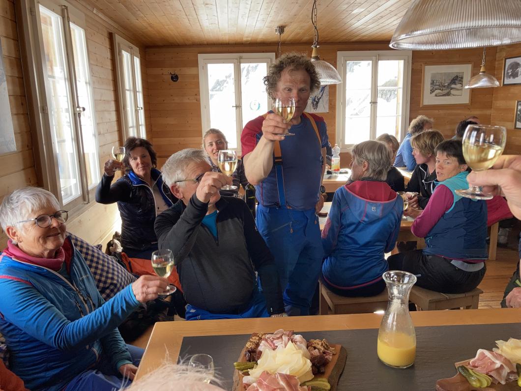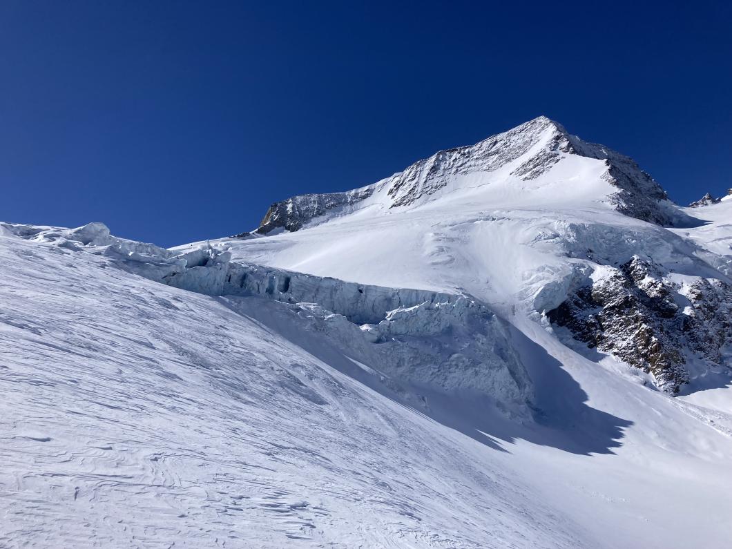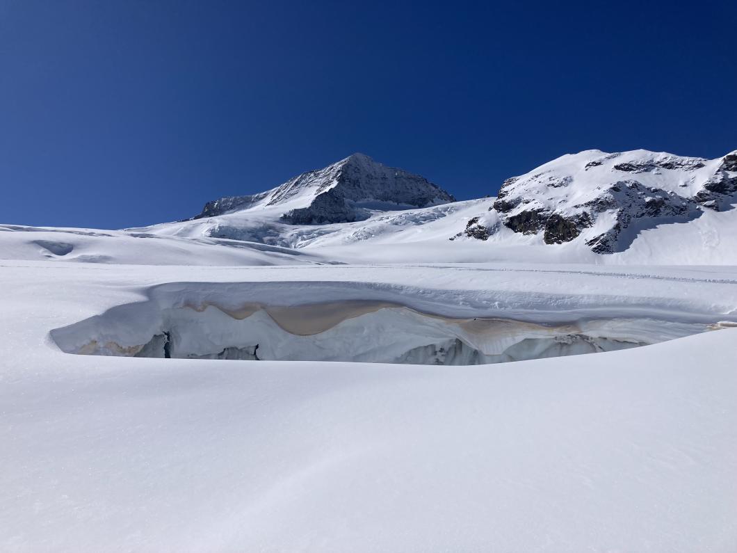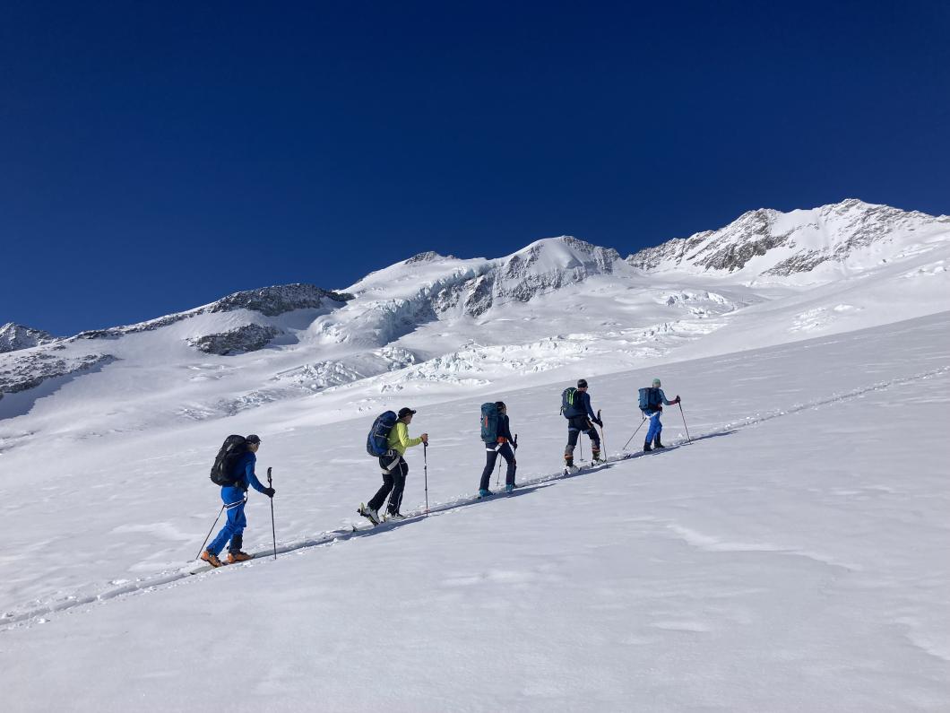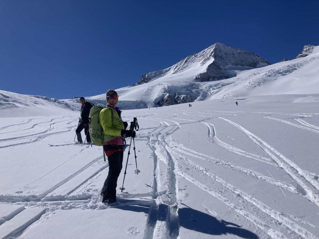 | Tourenbericht Nach durchzogenem Wetterbericht reisten wir am Montag Richtung Meiringen um dort mit dem Taxi in die Handegg zu fahren. Die Gondelbahn zog uns, von dort, in drei Fahrten hinauf zum Räterichsboden-Stasusee. Von dort erfolgte der Aufstieg in die Bächlital-Hütte. Da wunderbares Wetter herrschte entschlossen wir uns, bevor wir definitiv zur Hütte aufstiegen, die Pulverhänge unter dem Brünberg zu geniessen und dies gleich zweimal. Am nächsten Tag stiegen wir bei etwas schlechterem Wetter über die Obere Bächlilücke in die Gauli-Hütte. Leider konnten wir auf Grund des Nebels das vorgesehene Hubelhorn nicht besteigen. In der Hütte spendierte uns Sami und Manfred ein Apero, welches von der Hüttencrew zubereitet wurde. Da der Wetterbericht für Donnerstag einen Wetterwechsel mit viel Wind und Schneefall ankündigte, entschlossen wir uns das Gauli am Mittwoch über das Ränftenhorn, Richtung Rosenlaui, schon wieder zu verlassen. Bei wunderschönem Wetter stiegen wir am nächsten Tag über den Gauligletscher, vorbei am Flugzeugwrack der Dakota, hinauf zum Ränftenhorn. Die grandiose Abfahrt hinunter ins Rosenlaui war lang, anstrengend aber sehr imposant. Im Tal angekommen stiegen wir auf zur Broch-Hütte, wo wir unseren Durst und Hunger stillten. Schon bald begann es zu winden und kurz darauf kam der angekündigte Regen. Nach dem Nachtessen (Gschwellti u Raclette) studierten wir den Wetterbericht für den nächsten Tag. Wir entschlossen uns, in der angekündigten Regenpause, mit einer Gruppe Richtung Schwarzhorn aufzubrechen. Tatsächlich ermöglichte uns dieses Fenster am nächsten Tag dieses Vorhaben. Ein Teil der Gruppe blieb zurück in der Hütte, übte sich in der Seiltechnik bei Selbstaufstieg und Spaltenrettung. Nach der Rückkehr jener Leute, die noch auf den Skiern waren, gabs nochmals etwas zu Essen in der Hütte. Nach einer kurzen Theorie, (Tourenvorbereitung mit elektronischen Hilfsmitteln) endete die um einen Tag verkürzte Tourenwoche. Herzlichen Dank an Sami und Manfred, welche uns kompetent durch diese grandiose Landschaft führten! |