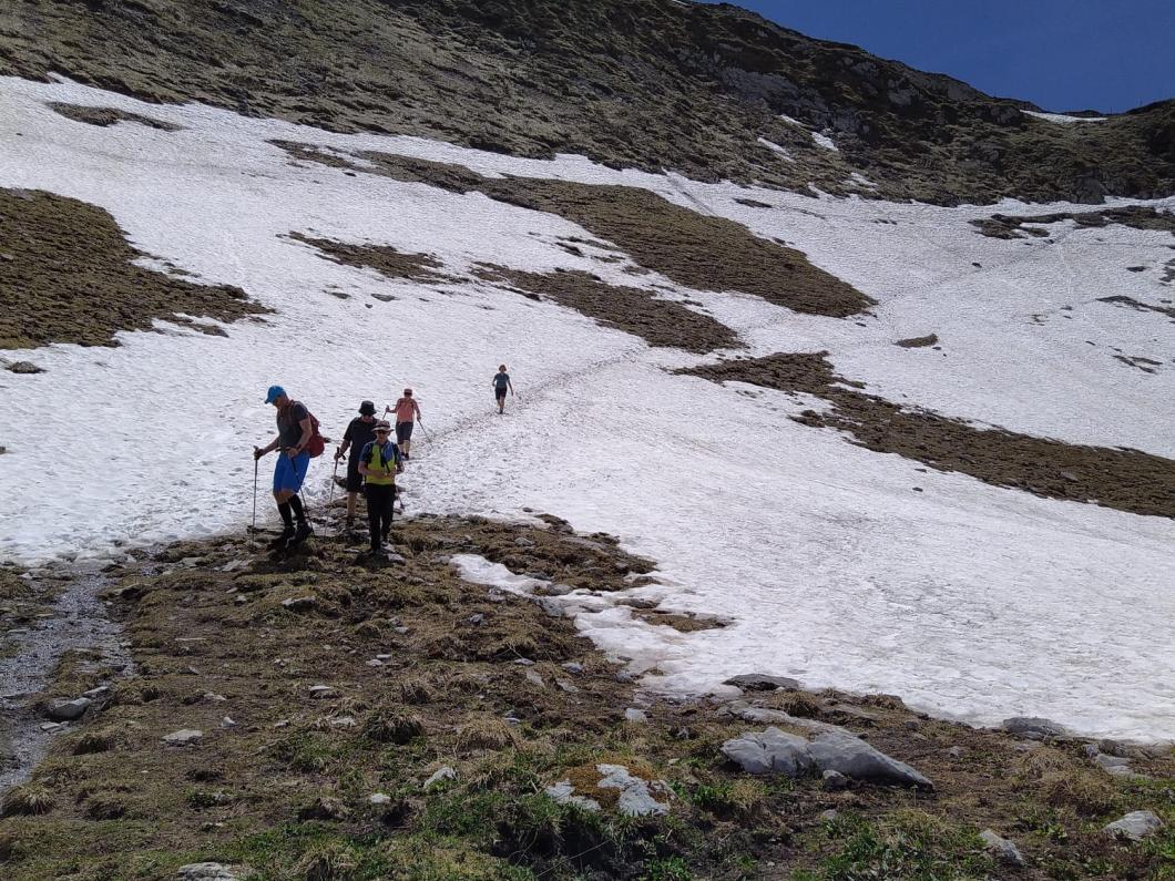 Kaum im Schwefelbergbad angekommen, erklärte Bänz den sechs Teilnehmenden anhand von Skizzen auf einem gefalteten A4-Blatt, wie das Relief der Gantrischkette vor zigtausenden Jahren mag entstanden sein. Gut gelaunt verliessen wir kurzum den Ausgangspunkt mit dem Ziel, auf den Widdersgrind zu wandern. Ein erster Halt auf Oberalpigle wurde genutzt, um sich zu stärken und Gedanken auszutauschen. Weiter wandernd Richtung Grenchengalm erblickten wir in den Seiten der Tagweid ein Rudel Gämsen, welche sich durch unseren Vorbeimarsch nicht aus der Ruhe haben lassen bringen, zu äsen und (die kleineren) herumzutollen. Auf dem Grenchengalm angekommen, entschlossen wir uns kurzerhand, direkt zum Widdersgrind aufzusteigen. Das Wolkenband verzog sich ohne Niederschläge wie prognostiziert rasch gegen Osten, sodass wir bei herrlichem Sonnenschein das Ziel der Wanderung erreichten. Die Fernsicht war gut und alle richteten sich beim Picknick so aus, dass sie den Bergkranz der Alpen bestaunen konnten. Bänz erwies sich als findigen Geocacher und trug sich im Logbuch ein. Andere erfreuten sich an der üppigen Flora in diesen Höhenlagen zur entsprechenden Jahreszeit: Soldanellen, Nelken, Enziane, Mehlprimel, Flühblumen (vom Japaner erfunden, der früh und spät anders ausspricht), Anemonen, Trollblumen (Ankenbälli) und wie sie alle heissen - eine Pracht! Wir verliessen den Widdersgrind via Sunnige Riprächt, vorbei am Schattigseeli, und die Wandergruppe erreichte die Alp Morgete. Eine kurze Stärkung verlieh allen den nötigen Schub, um die steile Wegpassage hinauf zum Morgetepass in rund 25 Minuten zu absolvieren. Oben angekommen, war wie vermutet, der legendäre Kiosk noch geschlossen. Die Alp Morgete wird erst in rund zwei Wochen bestossen sein und der Kiosk demzufolge erst ab dann aktiv bewirtschaftet. Wir verliessen den Blick in Richtung Simmental, Niesenkette, Blümlisalp-Dreigestirn etc. und wendeten uns der nördlichen Seite des Morgetepasses zu. Über einige Schneefelder im Gantrischchummli gelangen wir bald zum Gantrischseeli, wo wir auf eine Gruppe junger Damen stiessen, welche den Jungesellinenabschied auf der Alp Morgete feiern wollten. Wir hoffen, dass diejenige gutgelaunte Partymaus mit den violetten Sneakers wohlauf über die Schneeresten gekommen ist. In der Unteren Gantrischhütte stiessen wir bei einem kühlen Getränk (merci Urs) auf unsere schöne Tour im Gantrisch Park an, eh wir über das letzte Teilstück wieder zum Ausgangspunkt gelangen und uns dort bis zum nächsten Treffen verabschiedeten. Wir danken an dieser Stelle Bänz für die Organisation und Leitung dieser Tour - äs isch schöä gsy!