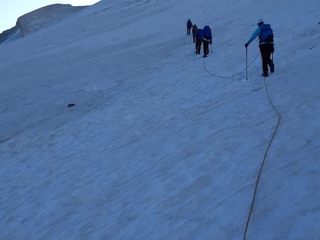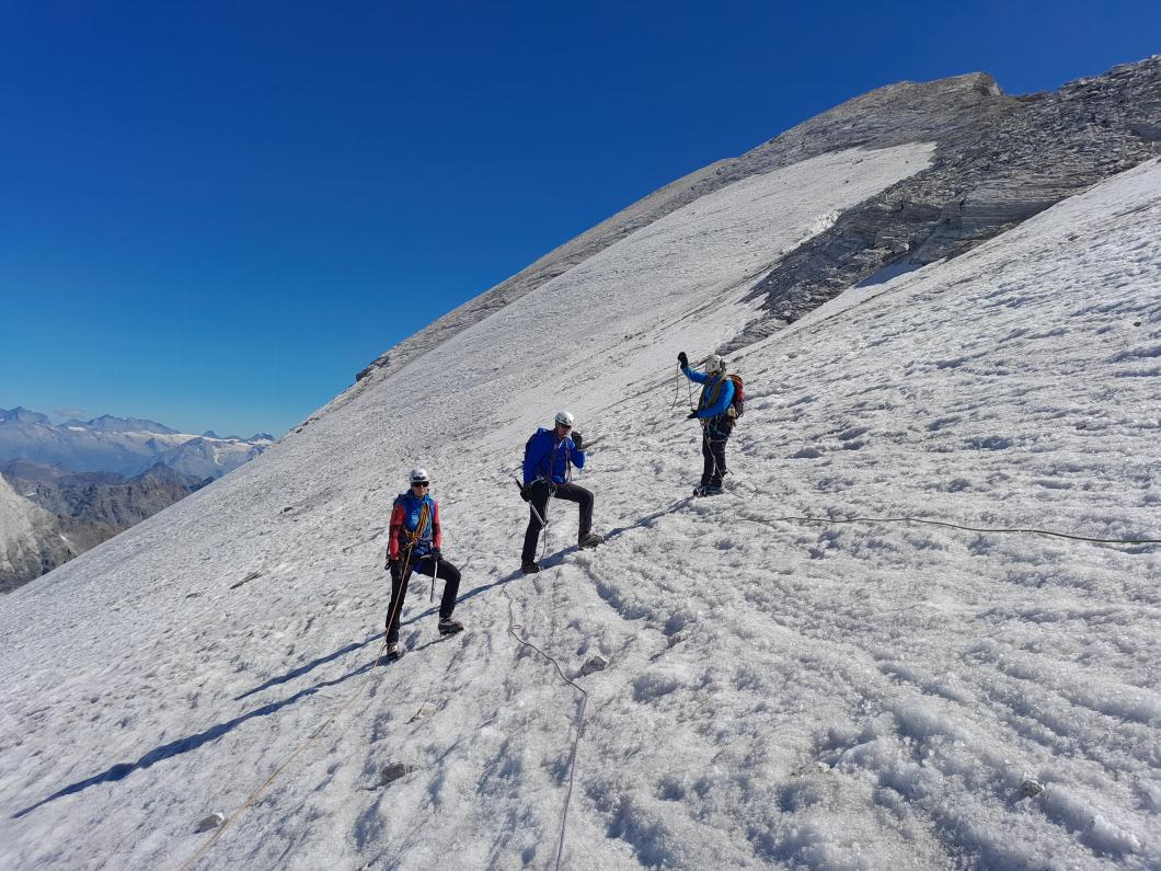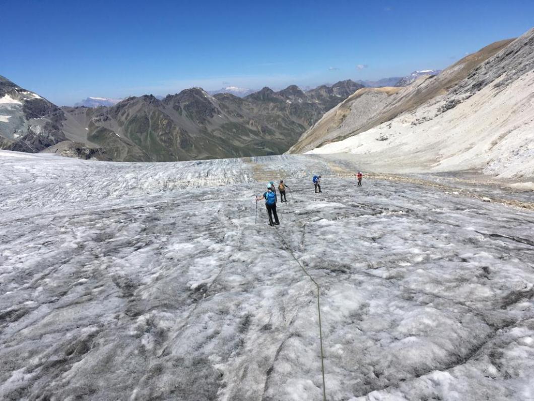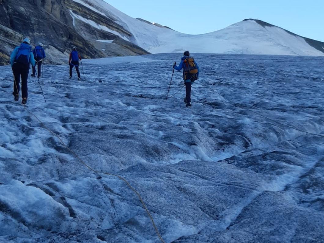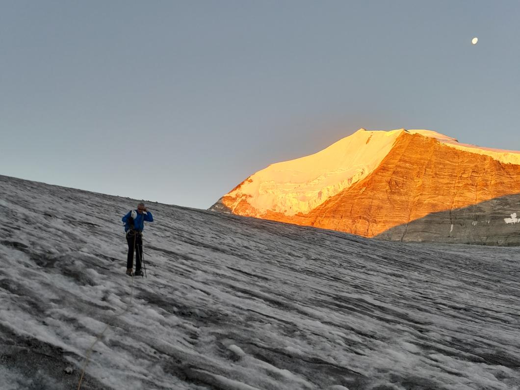 | Tourenbericht Mitten in der Hauptferienzeit stehen auch wir rund zwei Stunden in der Kolonne zum Autoverlad in Kandersteg. Die Wartezeit verkürzen wir uns mit Glace schlecken. Dank der Glace ist es dann auch nicht so schlimm, dass der Kuchen in der Turtmannhütte bei unserer Ankunft bereits ausverkauft ist. Nach einer kurzen Repetition der Seilhandhabung und einem stärkenden Znacht gehts früh zu Bett. Am Morgen starten wir um 4 Uhr. Der Supervollmond vom 13. Juli leuchtet uns auch heute noch den Weg. Bereits um 4:30 Uhr ist es schon warm genug, um auf über 2500m im T-Shirt zu laufen. Während wir auf dem Brunegggletscher unterwegs sind, geht die Sonne am Bishorn auf. Als der Gletscher steiler wird, zeigen sich erste ausgeaperte Stellen. Wir suchen uns den besten Weg auf die Felsen bis zum Punkt 3671. Von hier betrachten wir das im Schatten liegende Firnfeld des Brunegghorns. Es stellt sich später als weniger steil heraus als es von hier aussieht. Um 9:30 Uhr erreichen wir den Gipfel. Wir sind die Einzigen und geniessen die tolle Aussicht auf Walliser und Berner Alpen. Zurück bei der Hütte erfahren wir vom Hüttenteam zwei Dinge: die Tour aufs Brunegghorn wird kaum gemacht und Kuchen hat es auch heute keinen mehr… Beides für uns völlig unverständlich ;-) Danke Yvonne, dass Du mit uns diese anscheinend selten begangene Tour gewagt hast. |